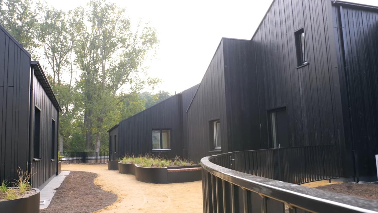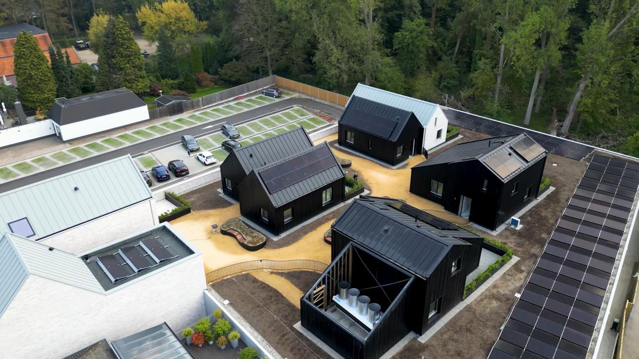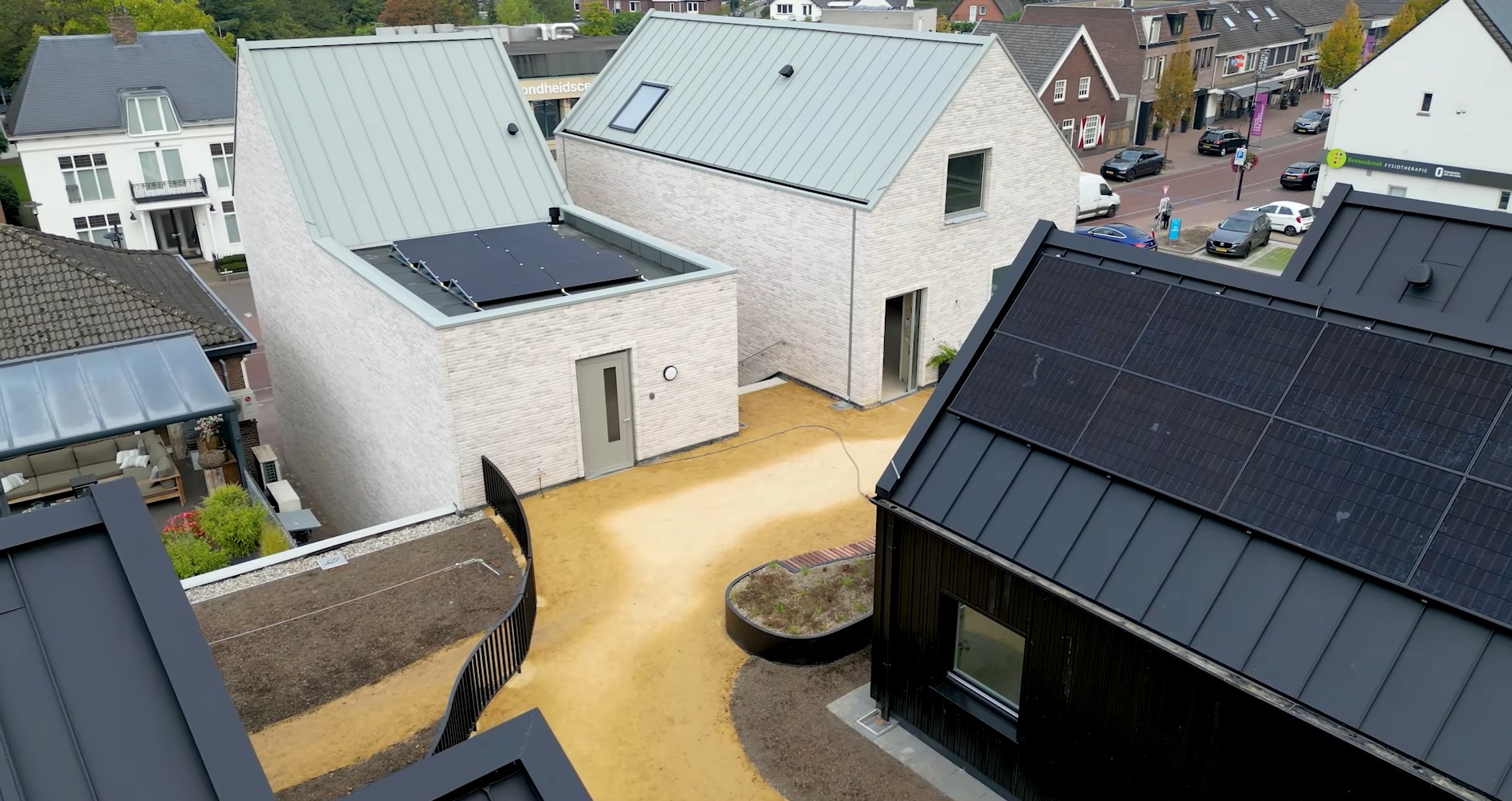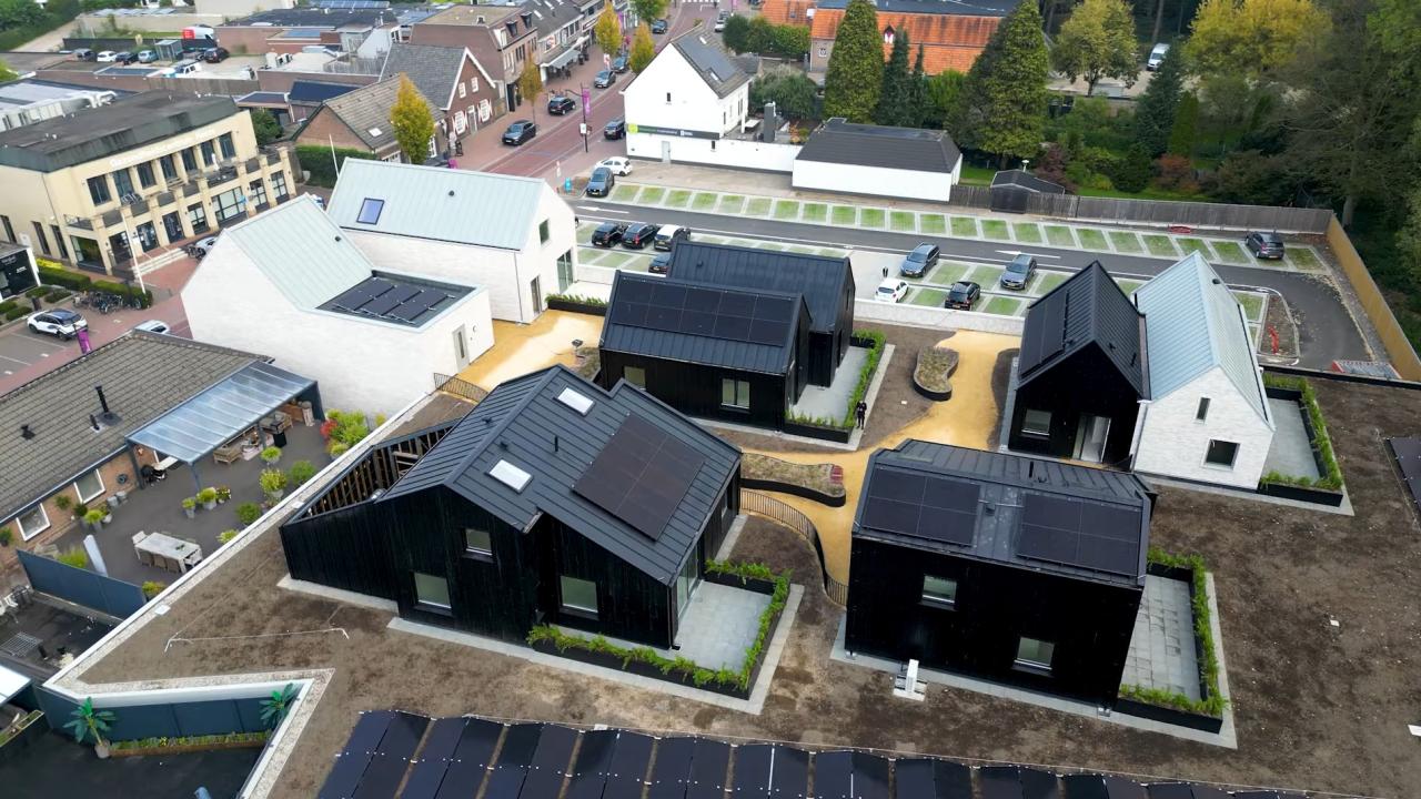 De tussen de huisjes liggende open trap leidt als verlengstuk van de levendige dorpsstraat naar een groene wereld boven op de Albert Heijn. Zo wordt de straat verlengt tot aan de voordeur. Op het dak zijn vijf levensloopbestendige woningen gerealiseerd, vormgegeven als zwarte houten huisjes met zadeldaken. Deze architectuur verwijst naar de schuren op het landgoed van het nabijgelegen Kasteel Heeze en vormt een herkenbaar dorps silhouet boven op het gebouw.