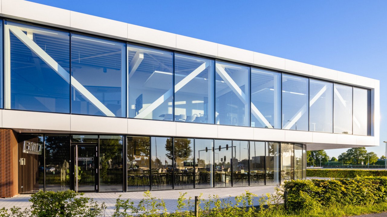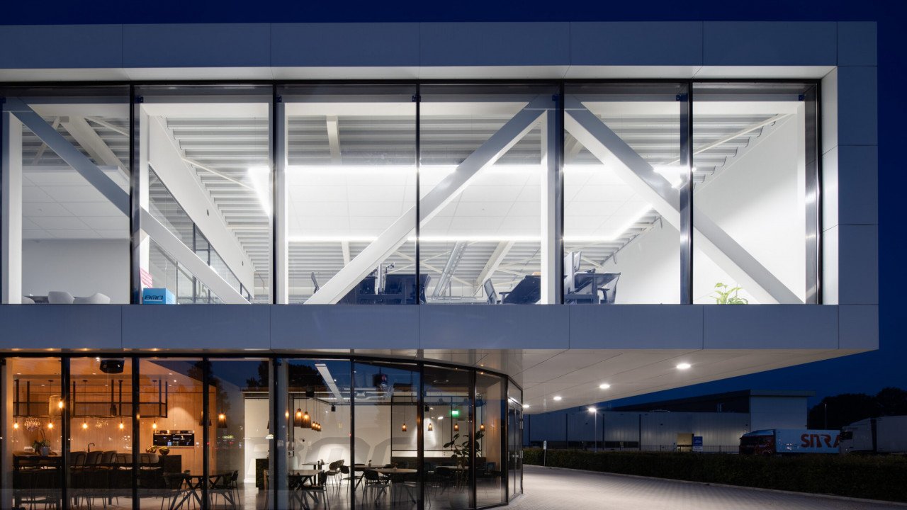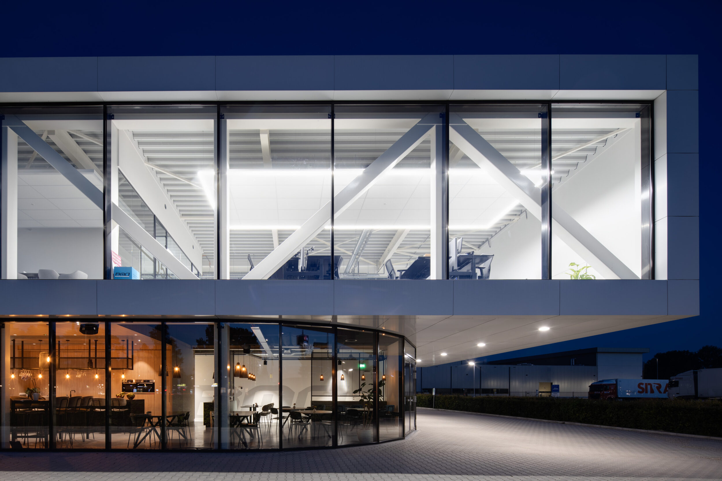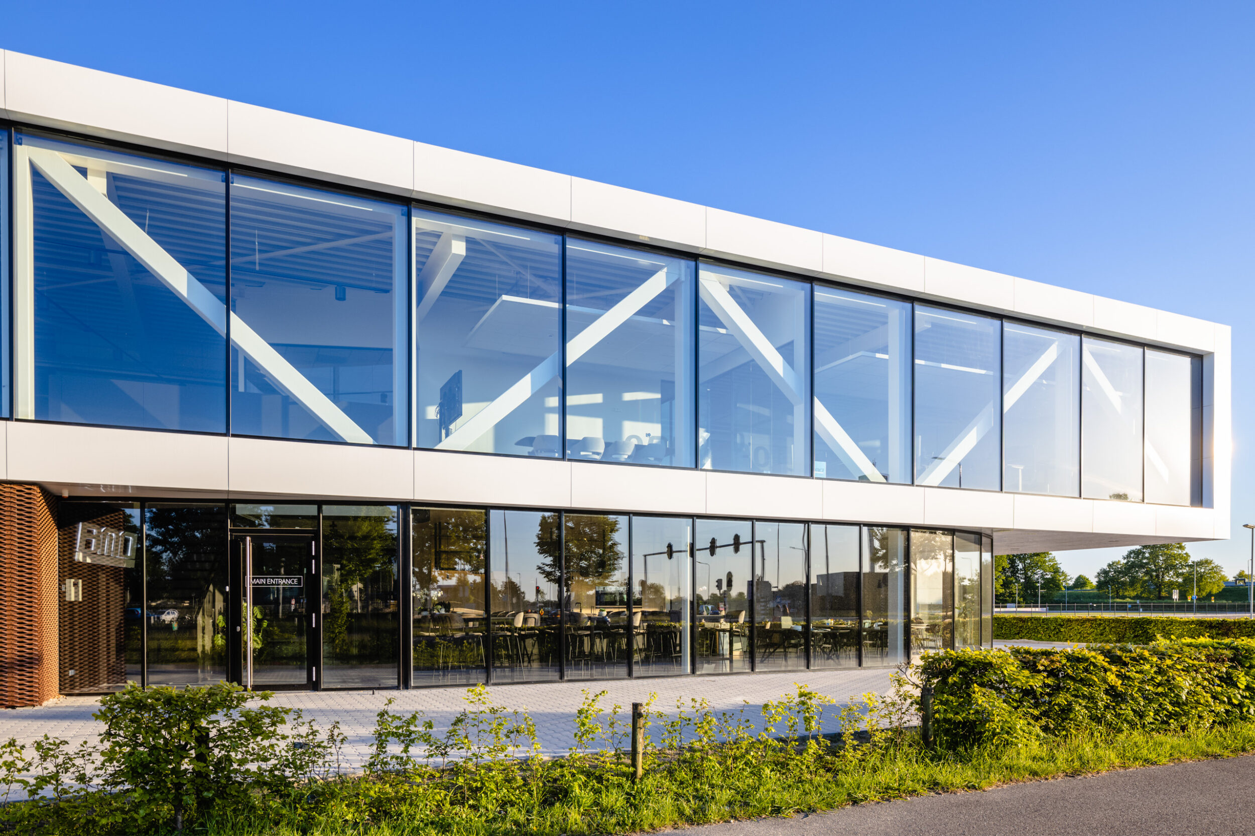 Het 35 meter lange en 4 meter hoge stalen vakwerkspant achter de glazen facade met kenmerkende witte omkadering vormt de blikvanger van het kantoor van BMO.