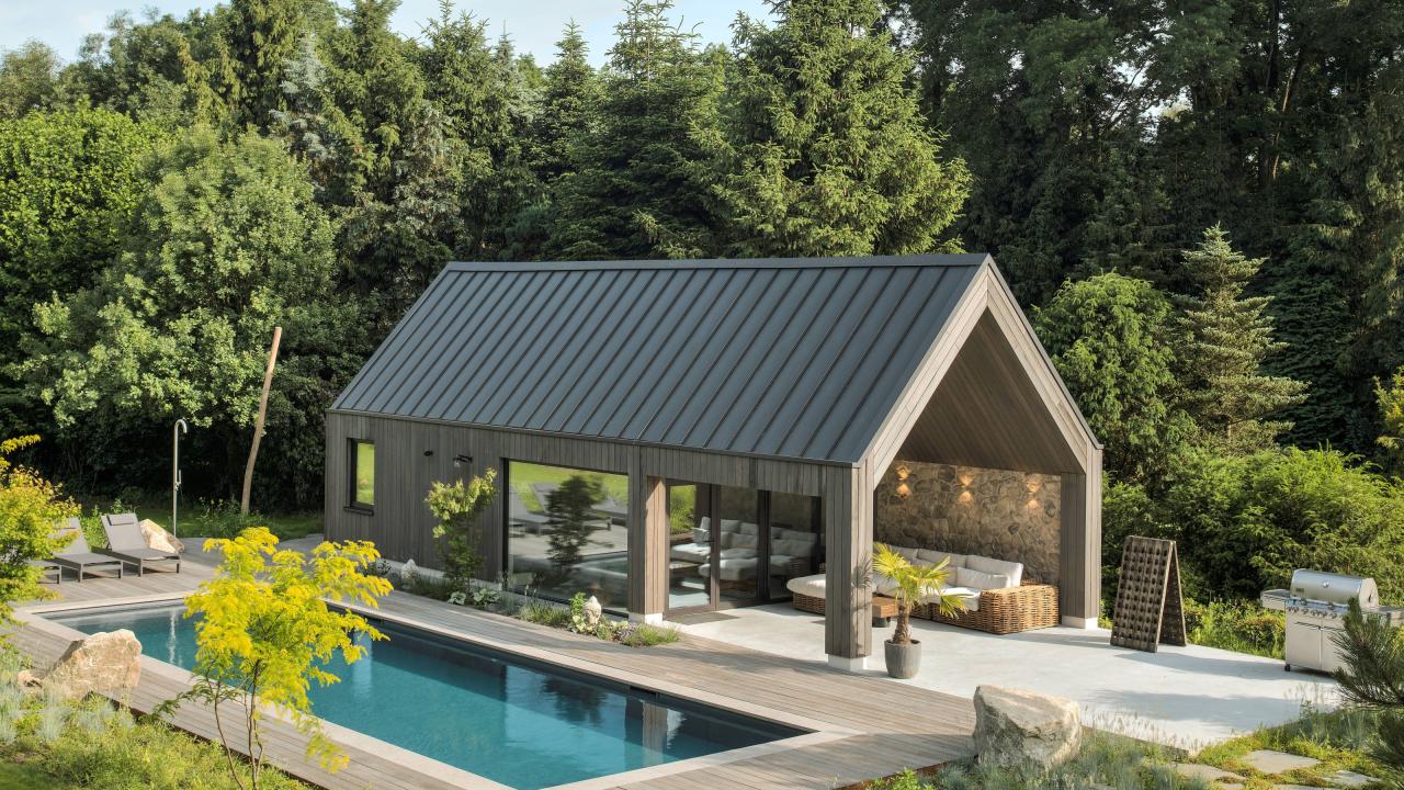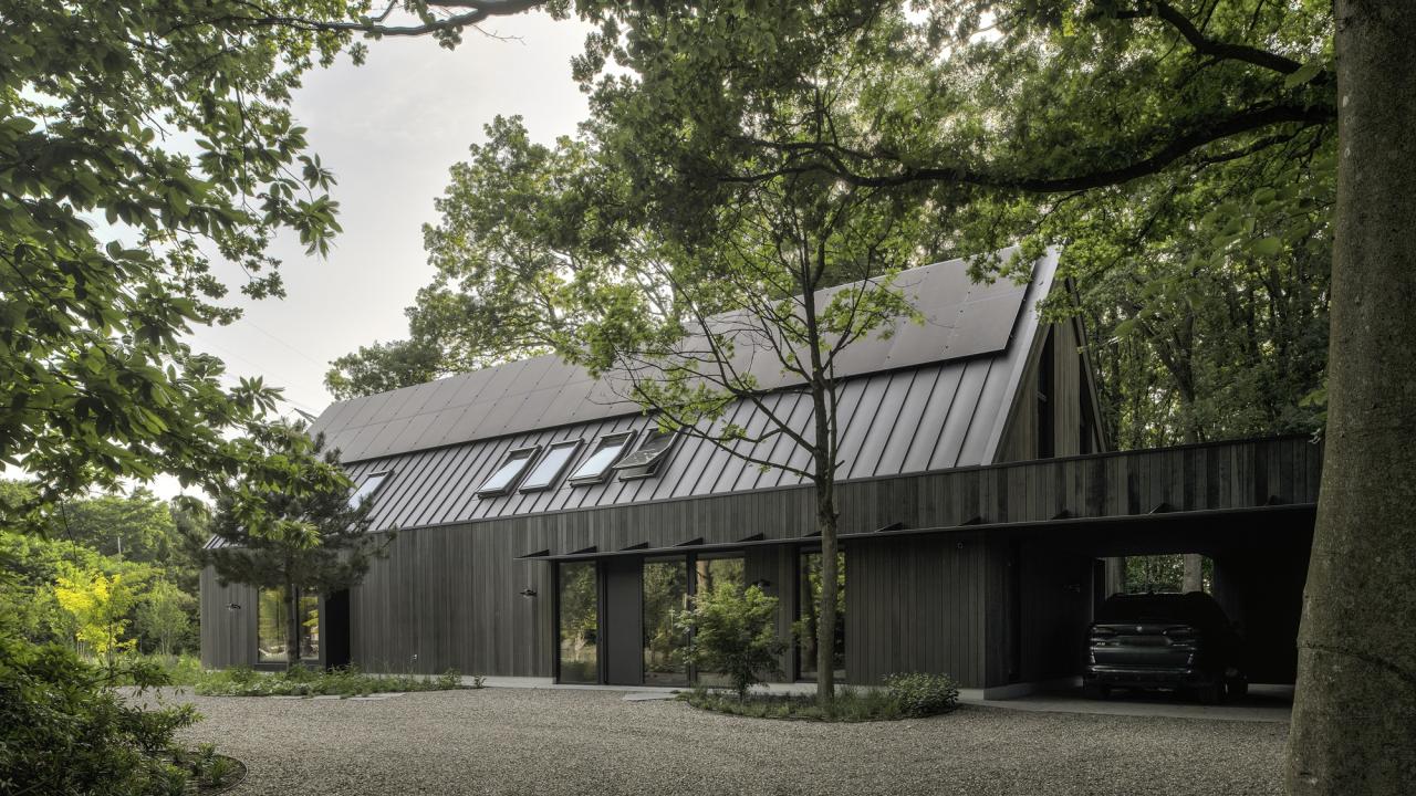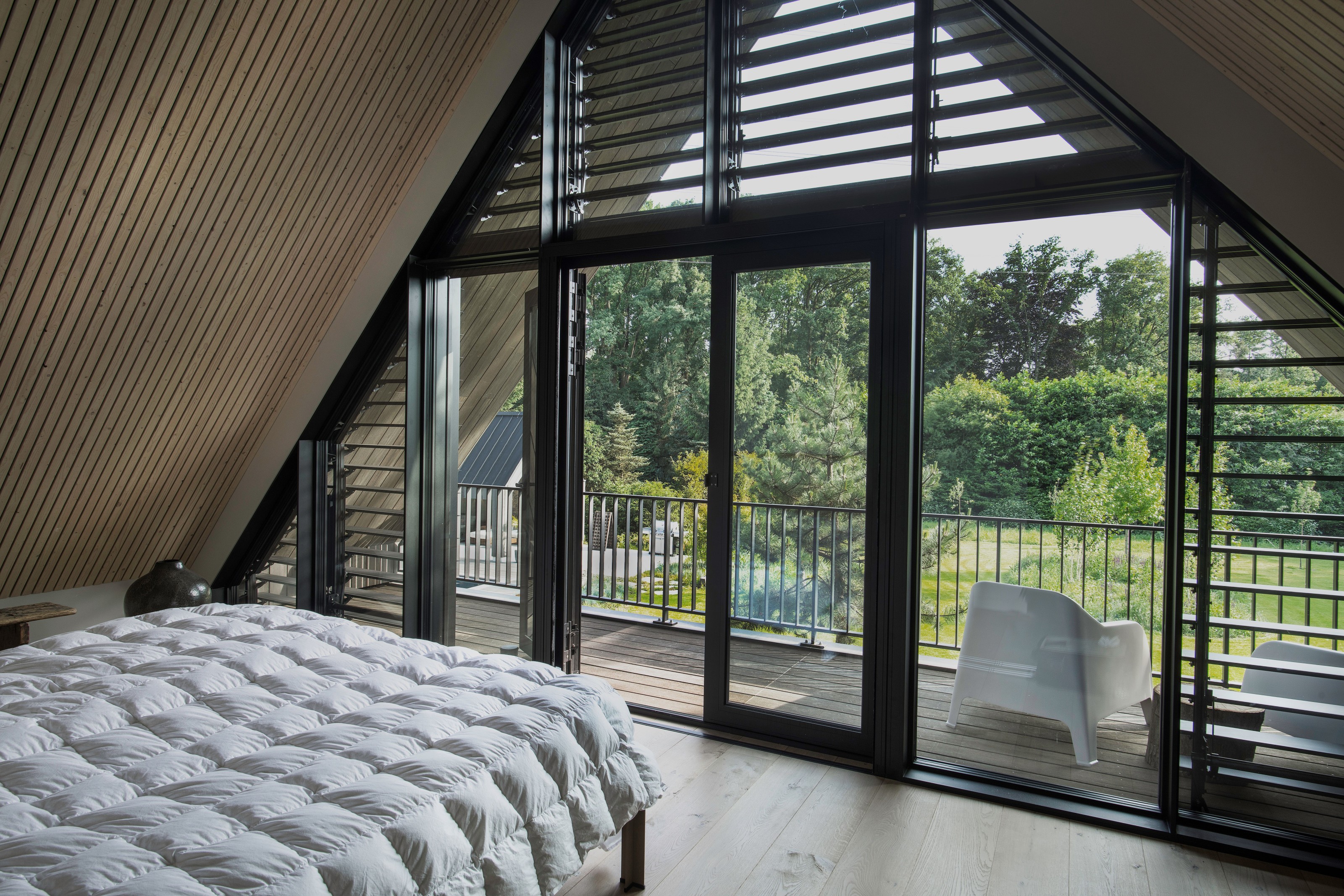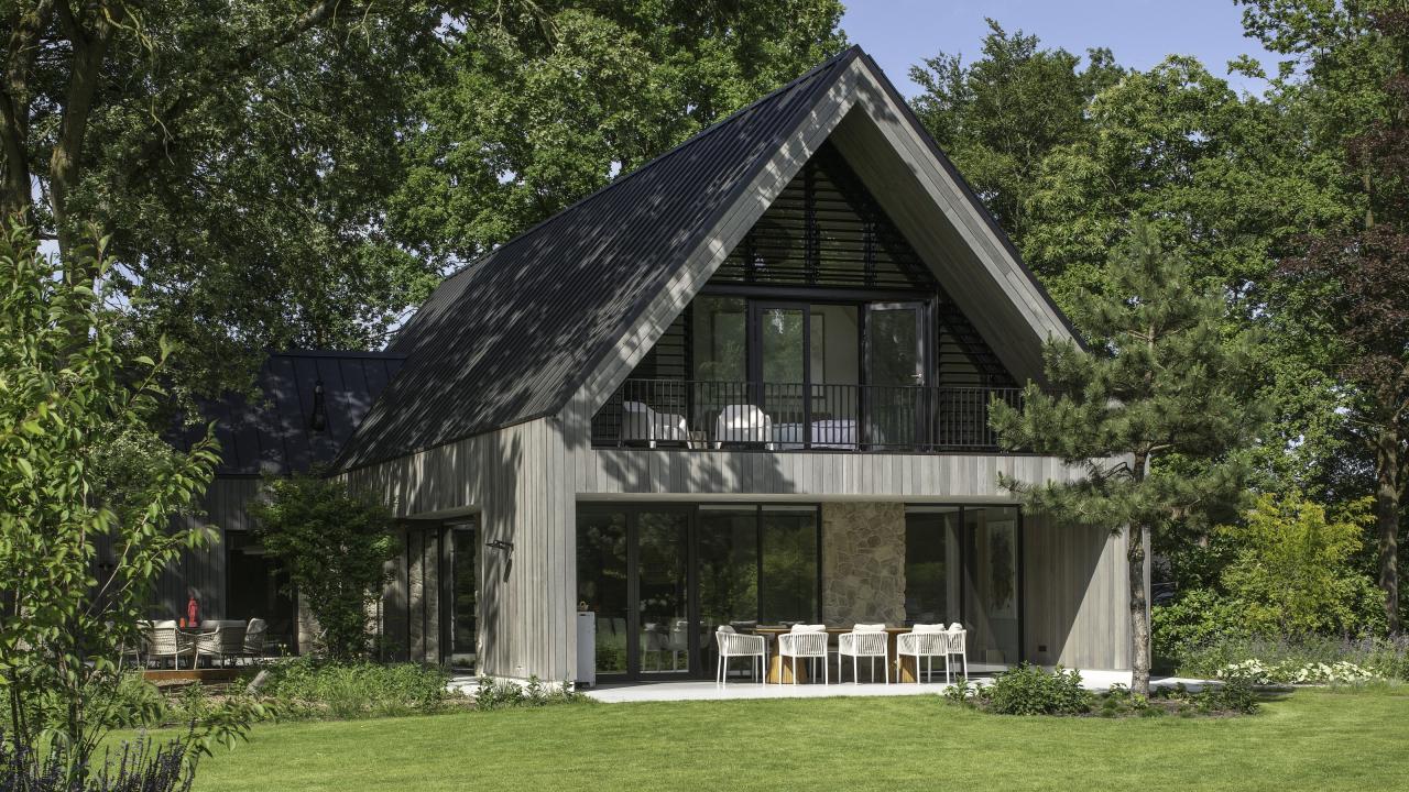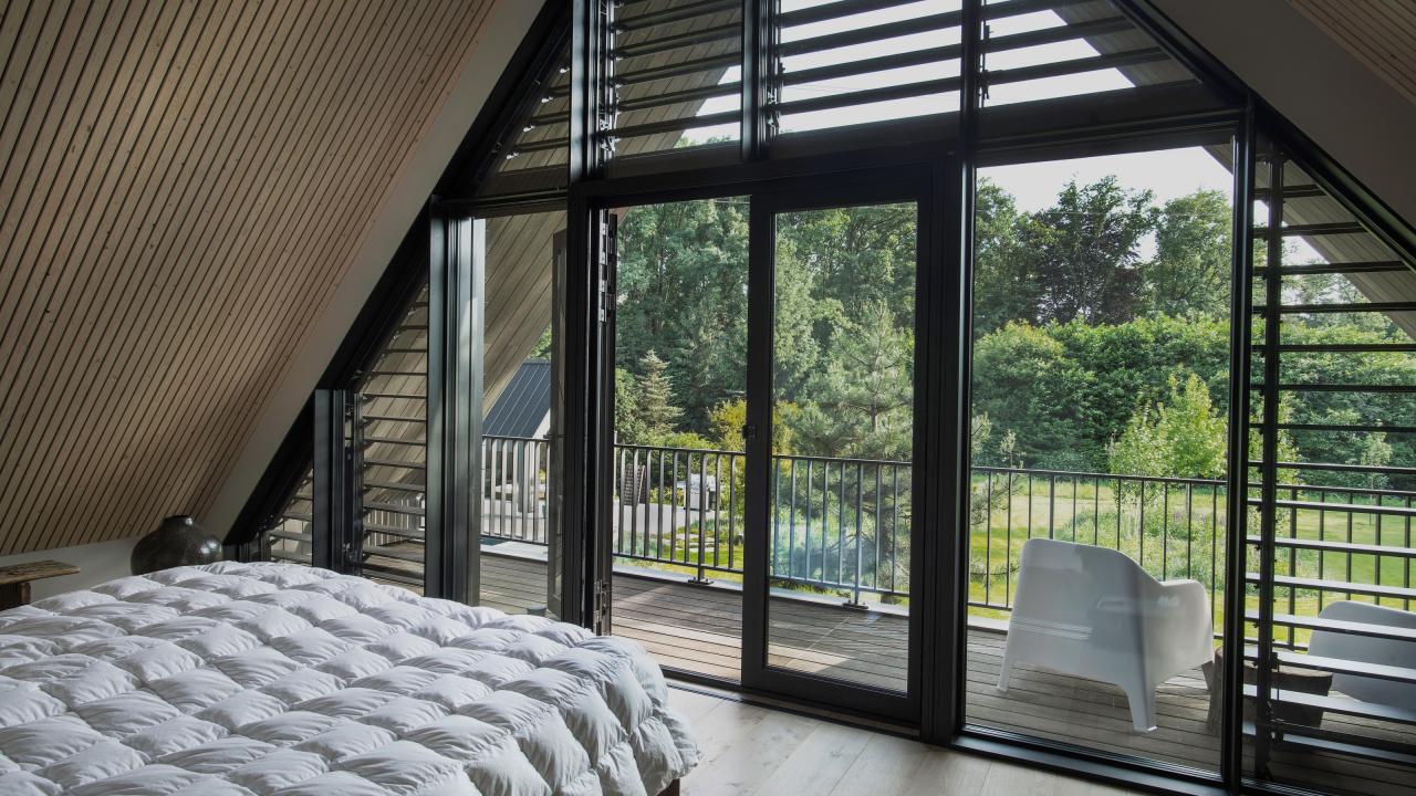 De topgevels van de woning en het poolhouse zijn uitgevoerd in vliesgevels in de slanke SL serie.