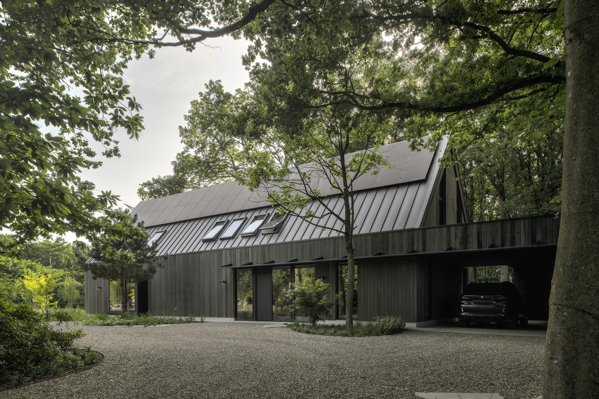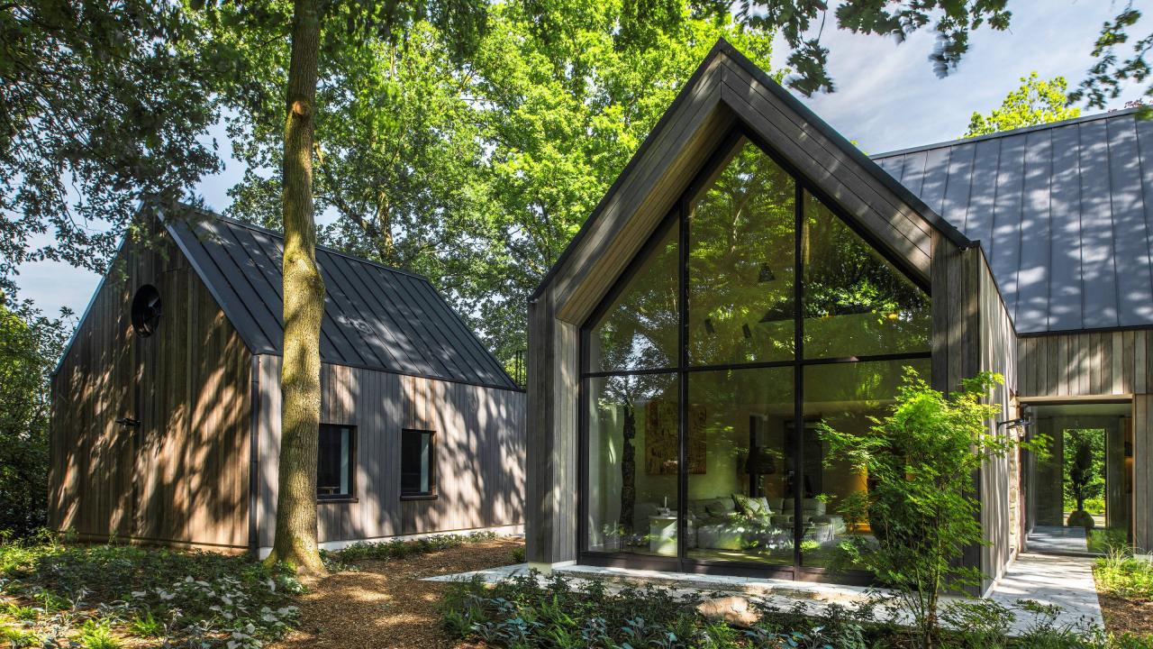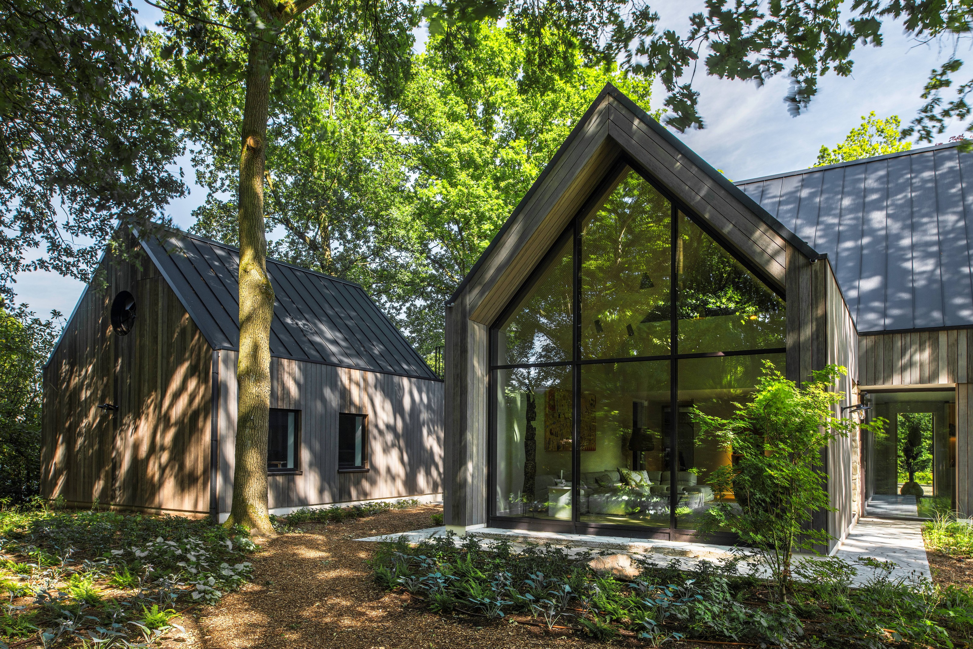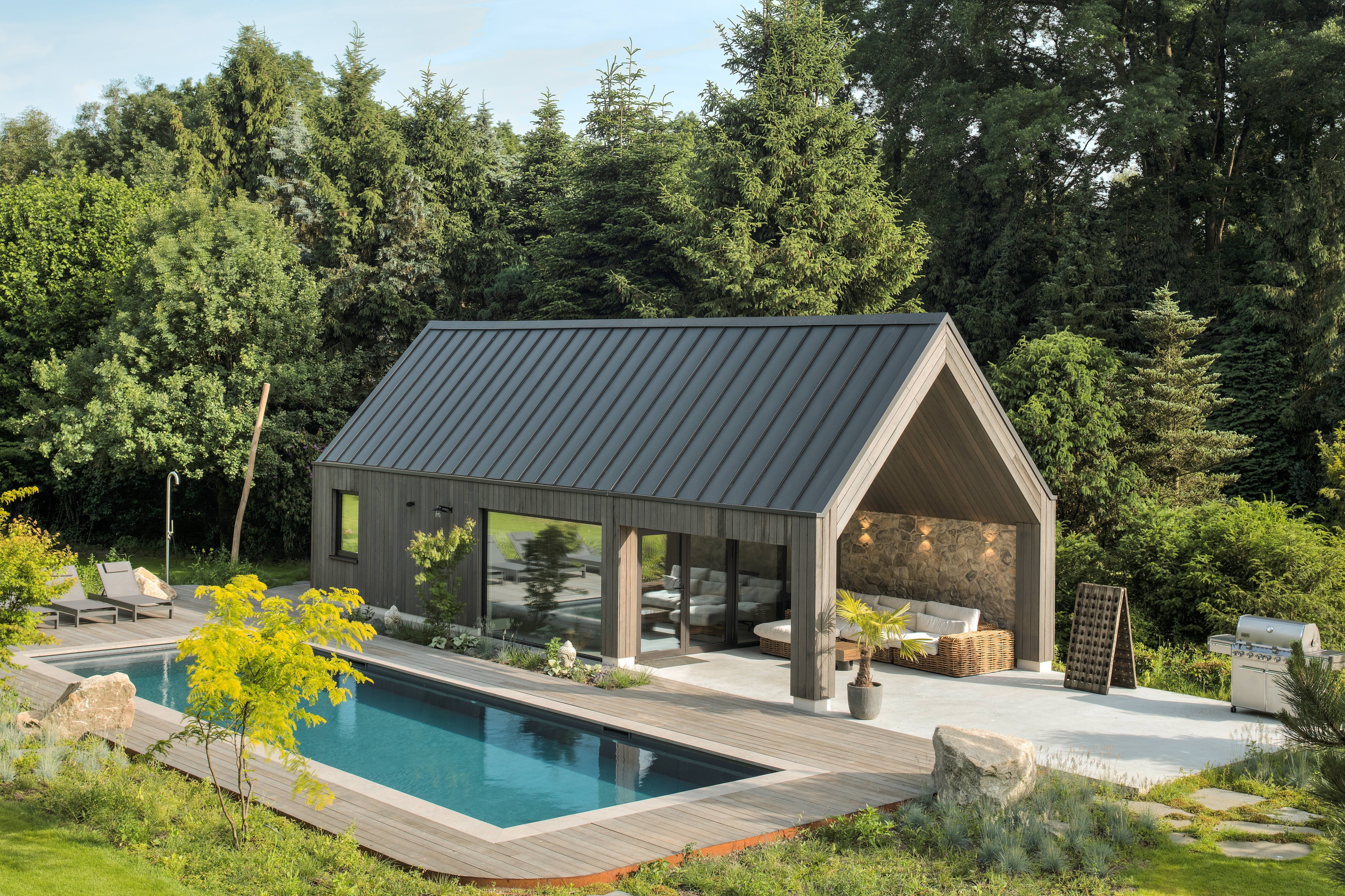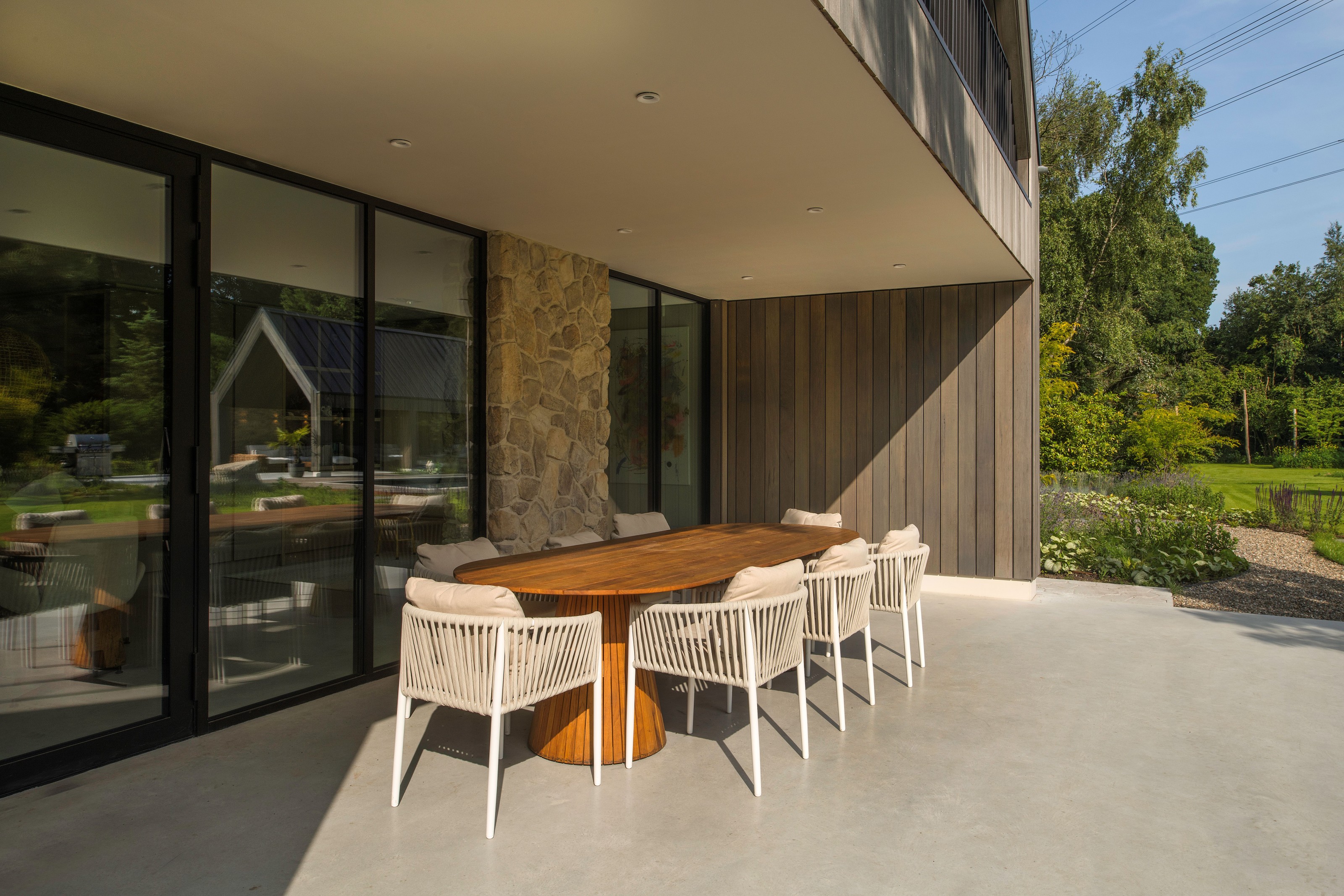 De topgevels van de woning en het poolhouse zijn uitgevoerd in vliesgevels in de slanke SL serie.