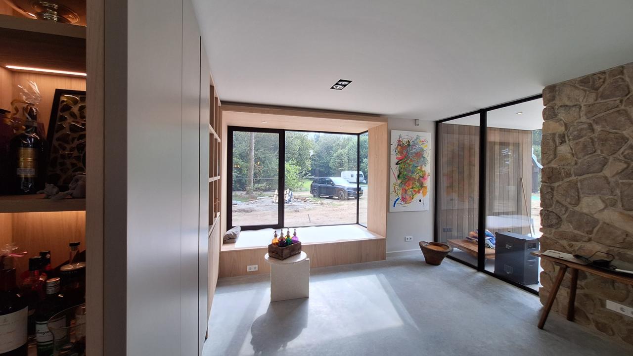 Vanuit de kozijnen in de keuken heb je overzicht over het zwembad en het poolhouse.
