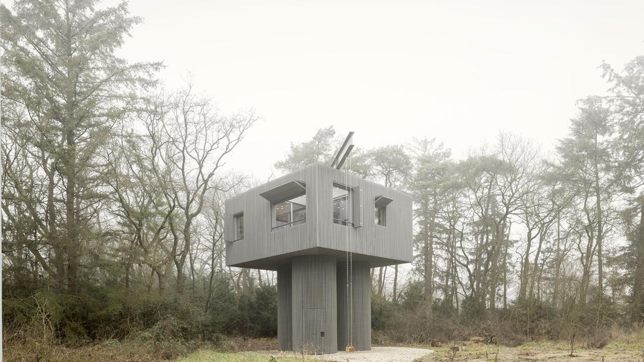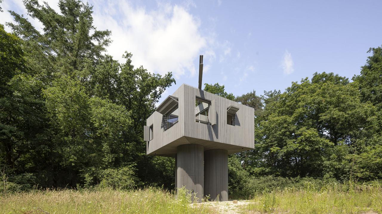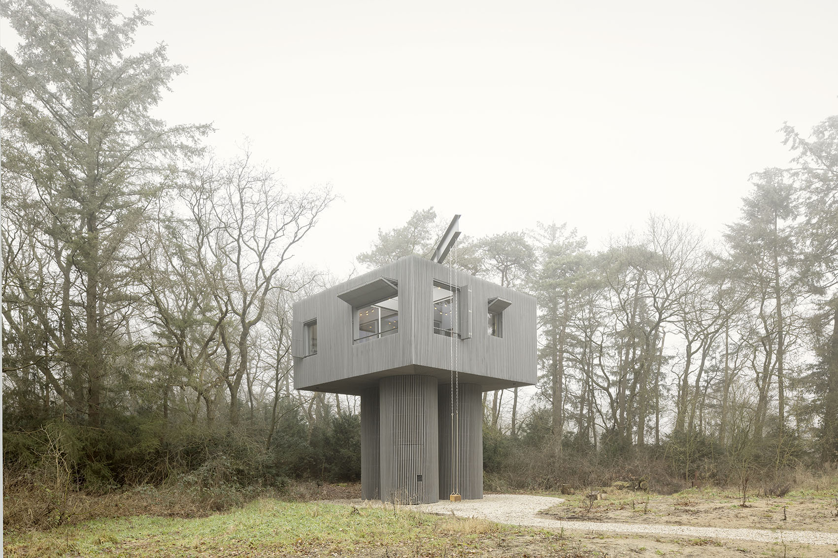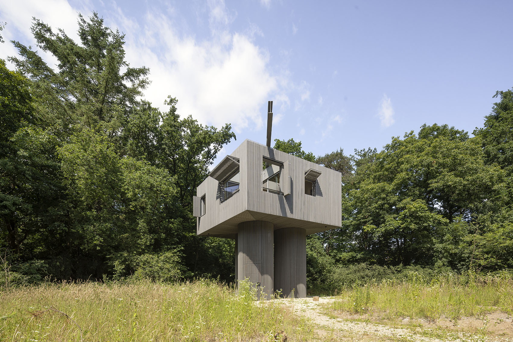 “Dit is een jongensdroom … op professionele wijze een hut in het bos bouwen”, zegt Gijs Baks. “We gingen zelfs zover om aan de inschrijving een zwart-witfoto van onszelf als jeugdige huttenbouwers toe te voegen.” En het kostte ook weinig brainstormsessies om te bepalen dat ze de hoogte in wilden. Daardoor ontstaat er namelijk een mooi contrast met de twee andere follies op het open veld, die zich onder de grond en in een ruïne van een schuur bevinden. “Maar dat was niet de enige reden. We willen hier ook genieten van de privacy en het groen van de bomen. En we hadden de ambitie om de grond zo min mogelijk te beroeren”, zegt Gijs, die met zijn broer tevens eigenaar is van Dolmen. “De aarde loopt daarom - behalve onder het huis - ook gewoon door in de drie poten.”