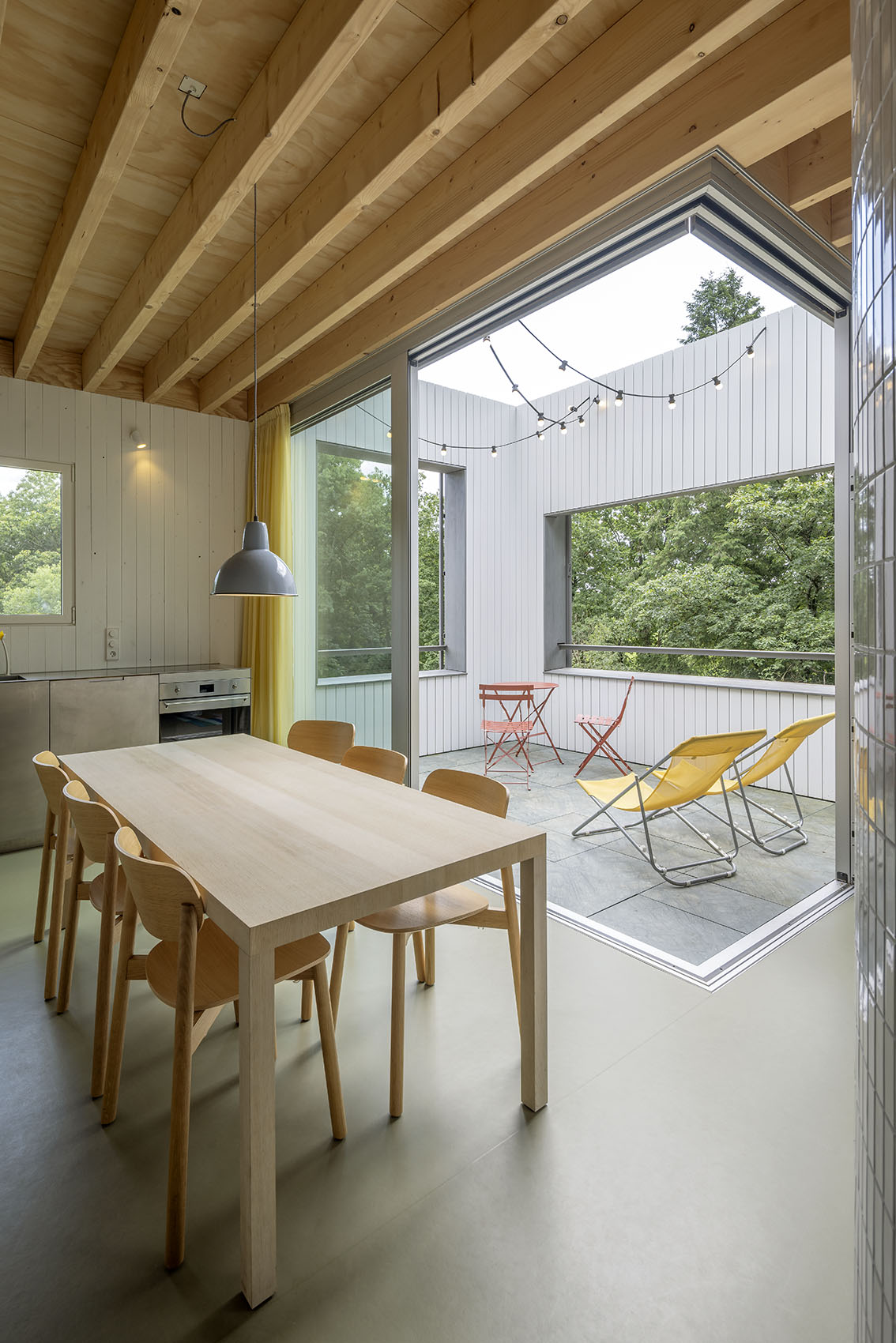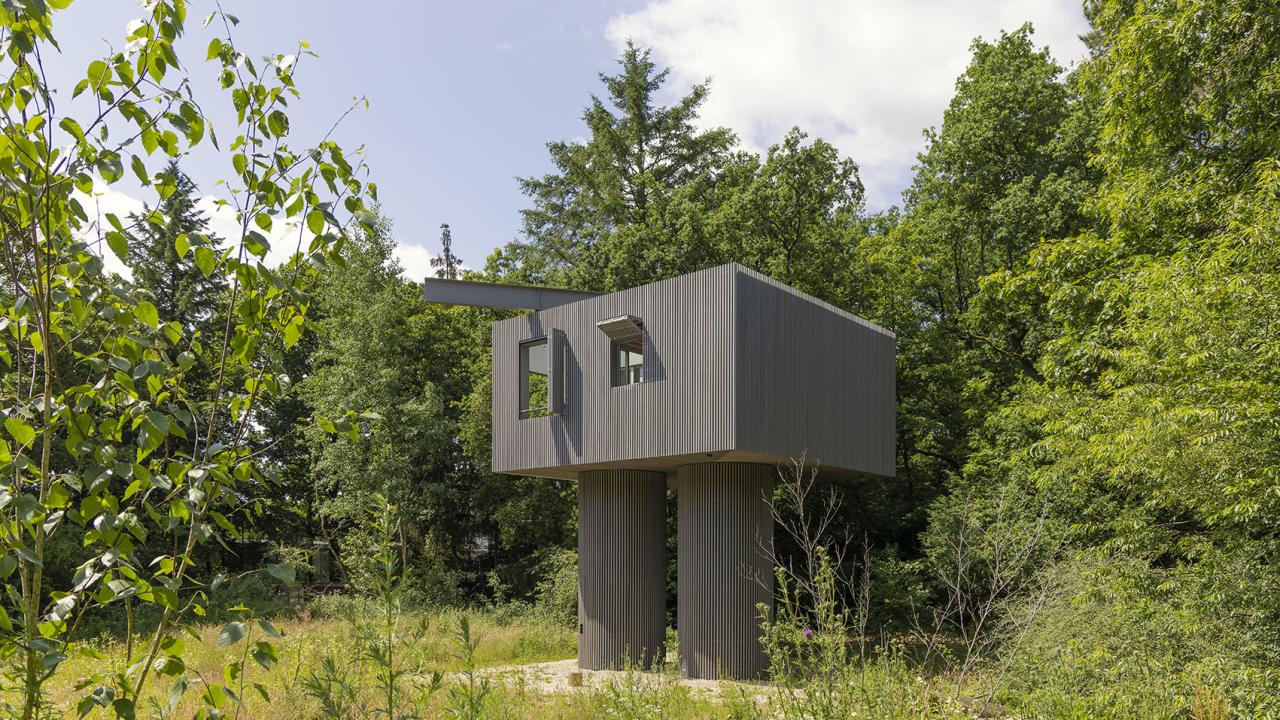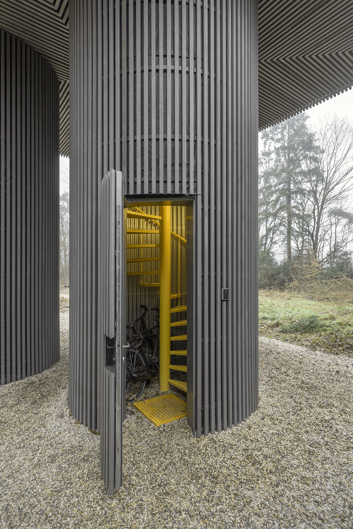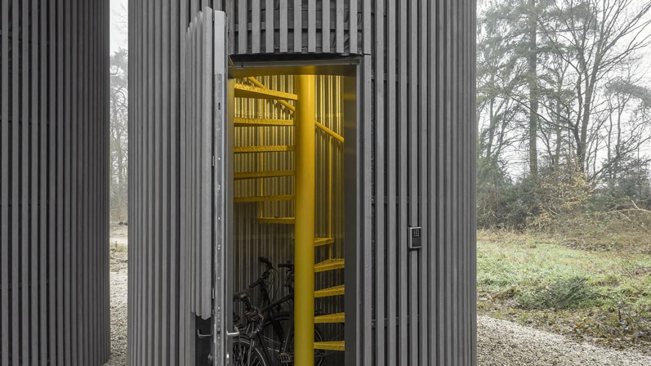 “Dit is een jongensdroom … op professionele wijze een hut in het bos bouwen”, zegt Gijs Baks. “We gingen zelfs zover om aan de inschrijving een zwart-witfoto van onszelf als jeugdige huttenbouwers toe te voegen.” En het kostte ook weinig brainstormsessies om te bepalen dat ze de hoogte in wilden. Daardoor ontstaat er namelijk een mooi contrast met de twee andere follies op het open veld, die zich onder de grond en in een ruïne van een schuur bevinden. “Maar dat was niet de enige reden. We willen hier ook genieten van de privacy en het groen van de bomen. En we hadden de ambitie om de grond zo min mogelijk te beroeren”, zegt Gijs, die met zijn broer tevens eigenaar is van Dolmen. “De aarde loopt daarom - behalve onder het huis - ook gewoon door in de drie poten.”