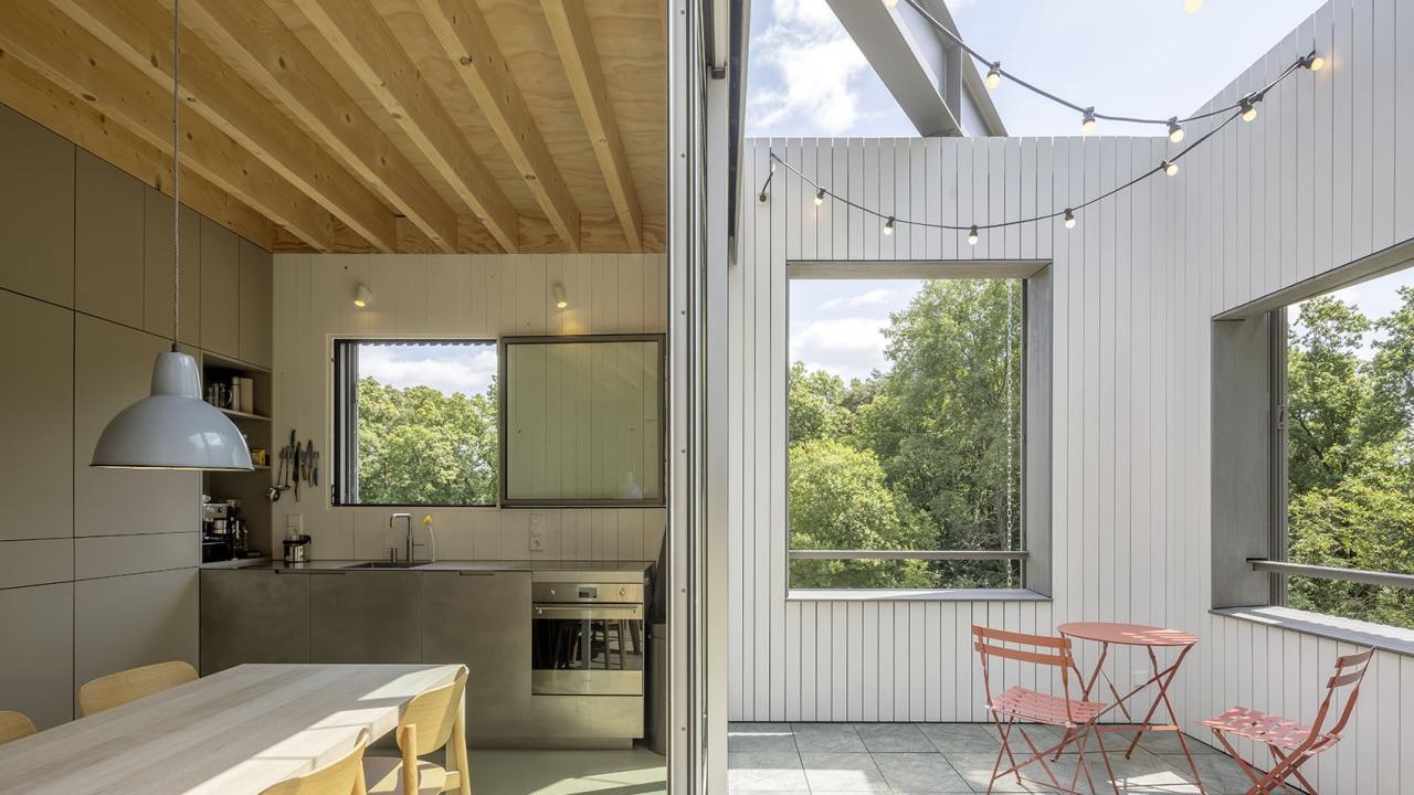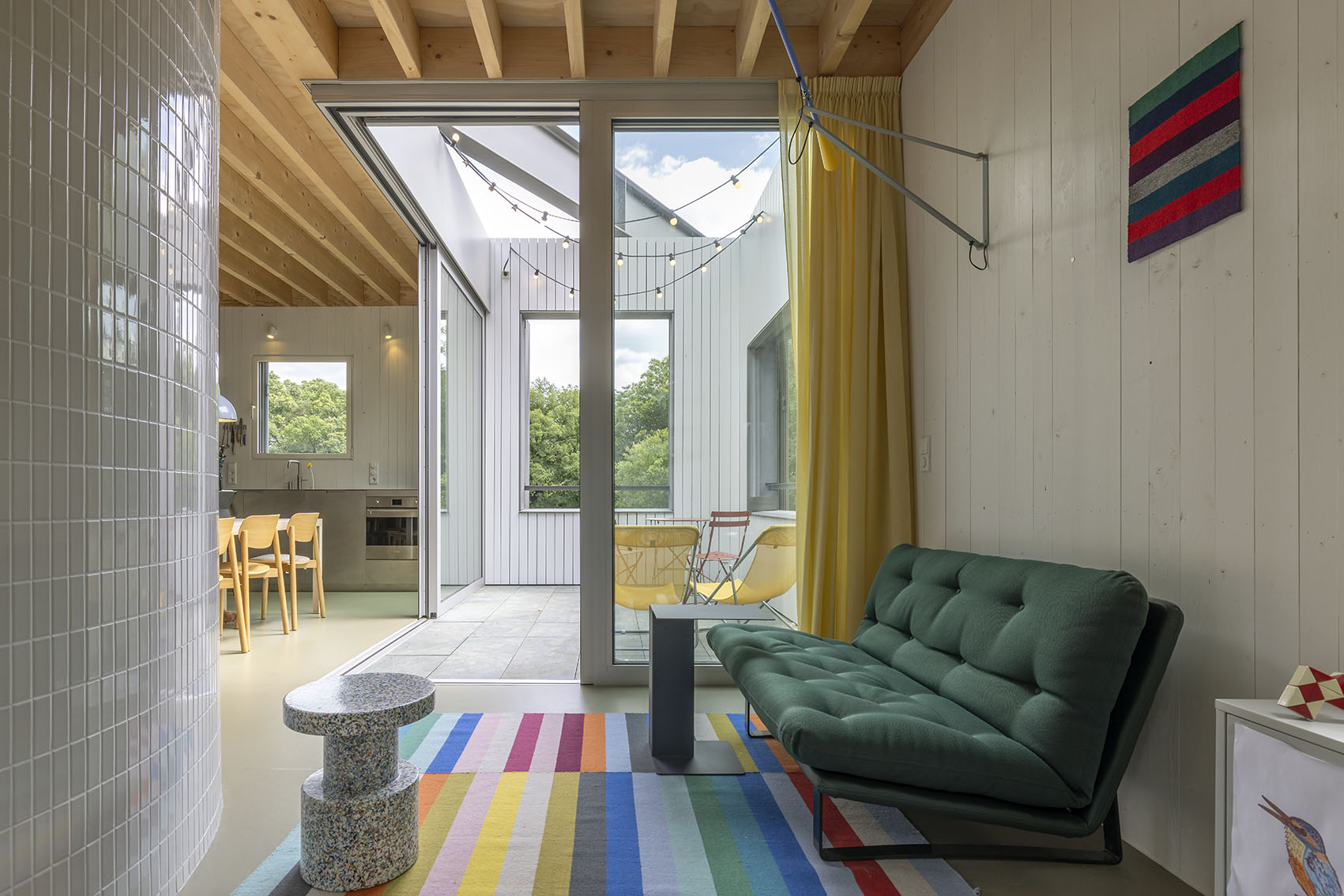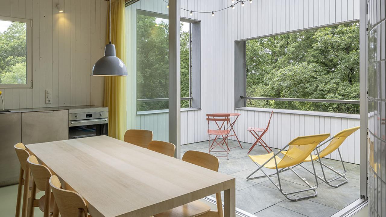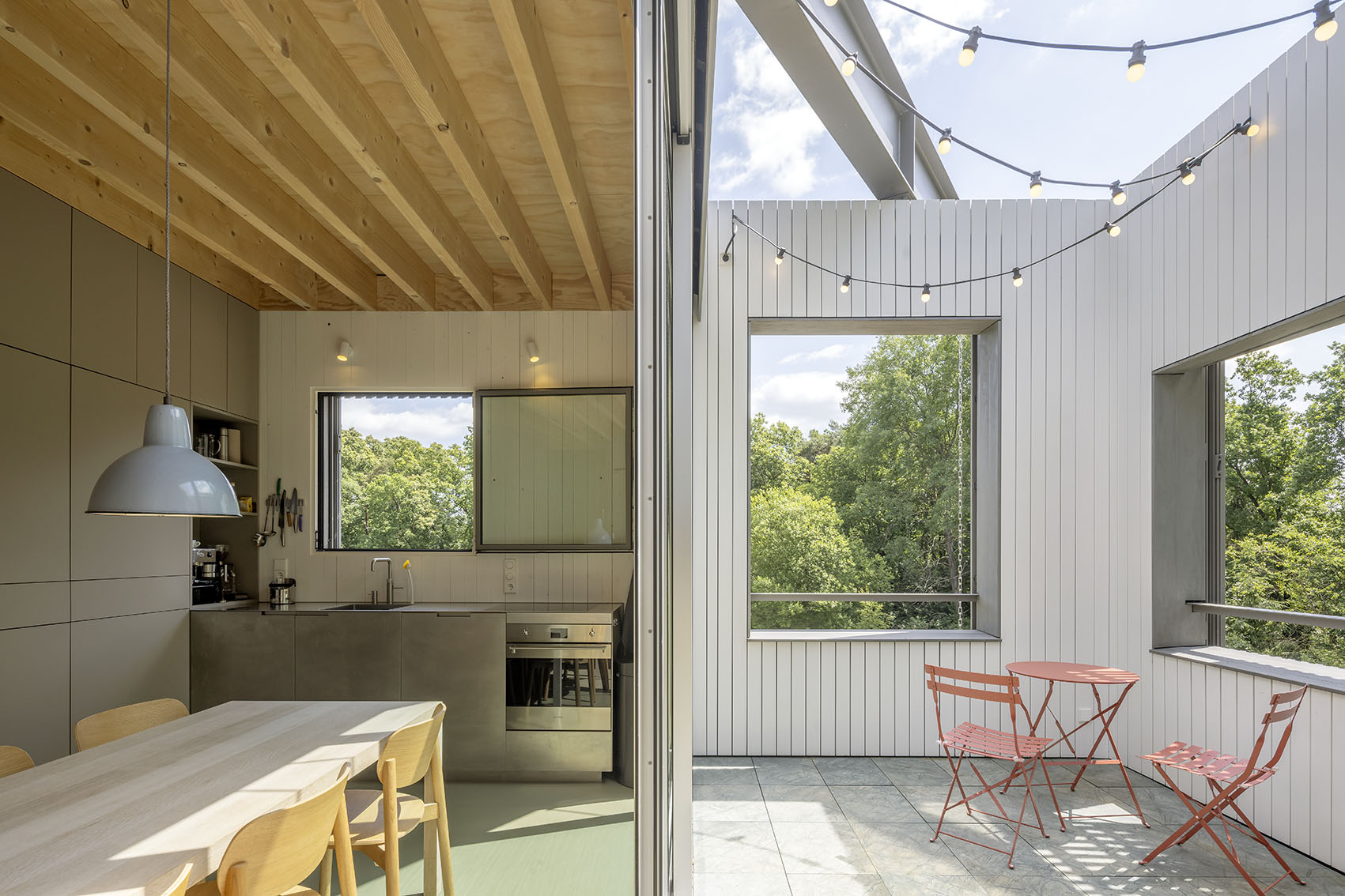 “Dit is een jongensdroom … op professionele wijze een hut in het bos bouwen”, zegt Gijs Baks. “We gingen zelfs zover om aan de inschrijving een zwart-witfoto van onszelf als jeugdige huttenbouwers toe te voegen.” En het kostte ook weinig brainstormsessies om te bepalen dat ze de hoogte in wilden. Daardoor ontstaat er namelijk een mooi contrast met de twee andere follies op het open veld, die zich onder de grond en in een ruïne van een schuur bevinden. “Maar dat was niet de enige reden. We willen hier ook genieten van de privacy en het groen van de bomen. En we hadden de ambitie om de grond zo min mogelijk te beroeren”, zegt Gijs, die met zijn broer tevens eigenaar is van Dolmen. “De aarde loopt daarom - behalve onder het huis - ook gewoon door in de drie poten.”