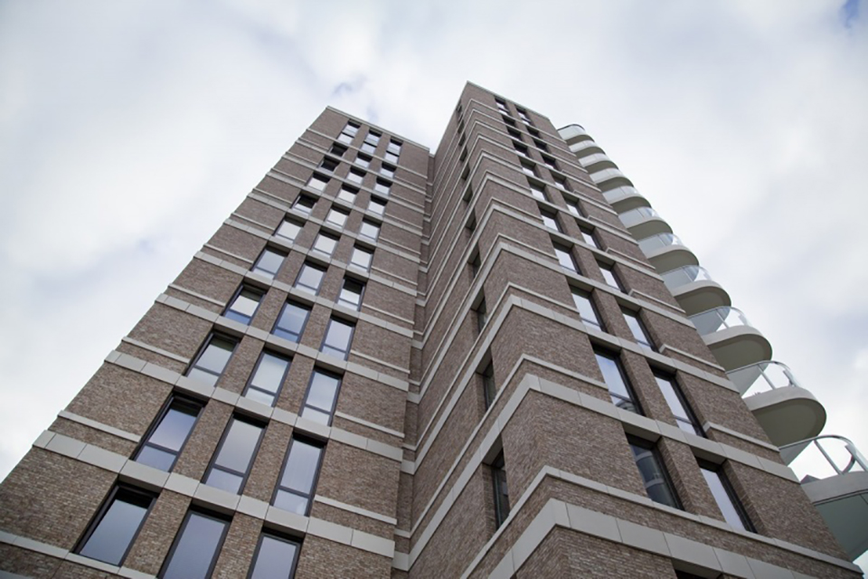 Wie de gebouwen nu goed bekijkt, ziet dat de kozijnen in de gevels inderdaad verspringen. Die plaatsing was een belangrijk aandachtspunt voor Van der Pol: “We wilden de kozijnen in de noordgevel gelijk met de buitenkant van de gevel hebben, zodat de lucht in de ramen wordt gereflecteerd”, vertelt van der Pol. “De donkere noordgevels worden hierdoor lichter en zijn echt spiegels van de hemel geworden.” In de zuidgevels werden de kozijnen juist in een diepe neg geplaatst, voor meer schaduwwerking en schaduw in de woningen zelf. De kozijnen hebben verschillende kleuren gekregen: de terugliggende kozijnen in de zuidgevel zijn donker van kleur, de naar voren liggende exemplaren in de noordgevel zijn juist lichter en benaderen de beige kleur van de bakstenen. De bovenste en onderste kozijnen in de noordkant liggen juist wel weer dieper in de gevel om een subtiele plint en kroon te creëren. De gevel werd uitgevoerd door P. van Hoesel.
