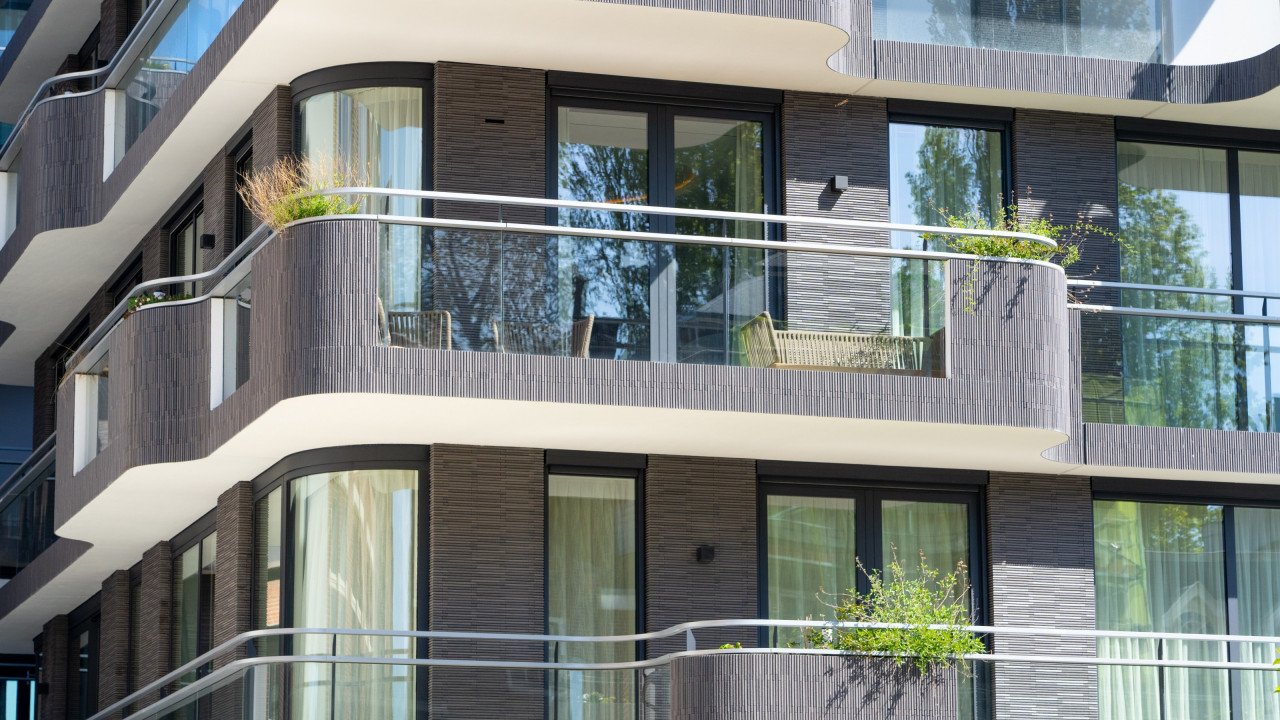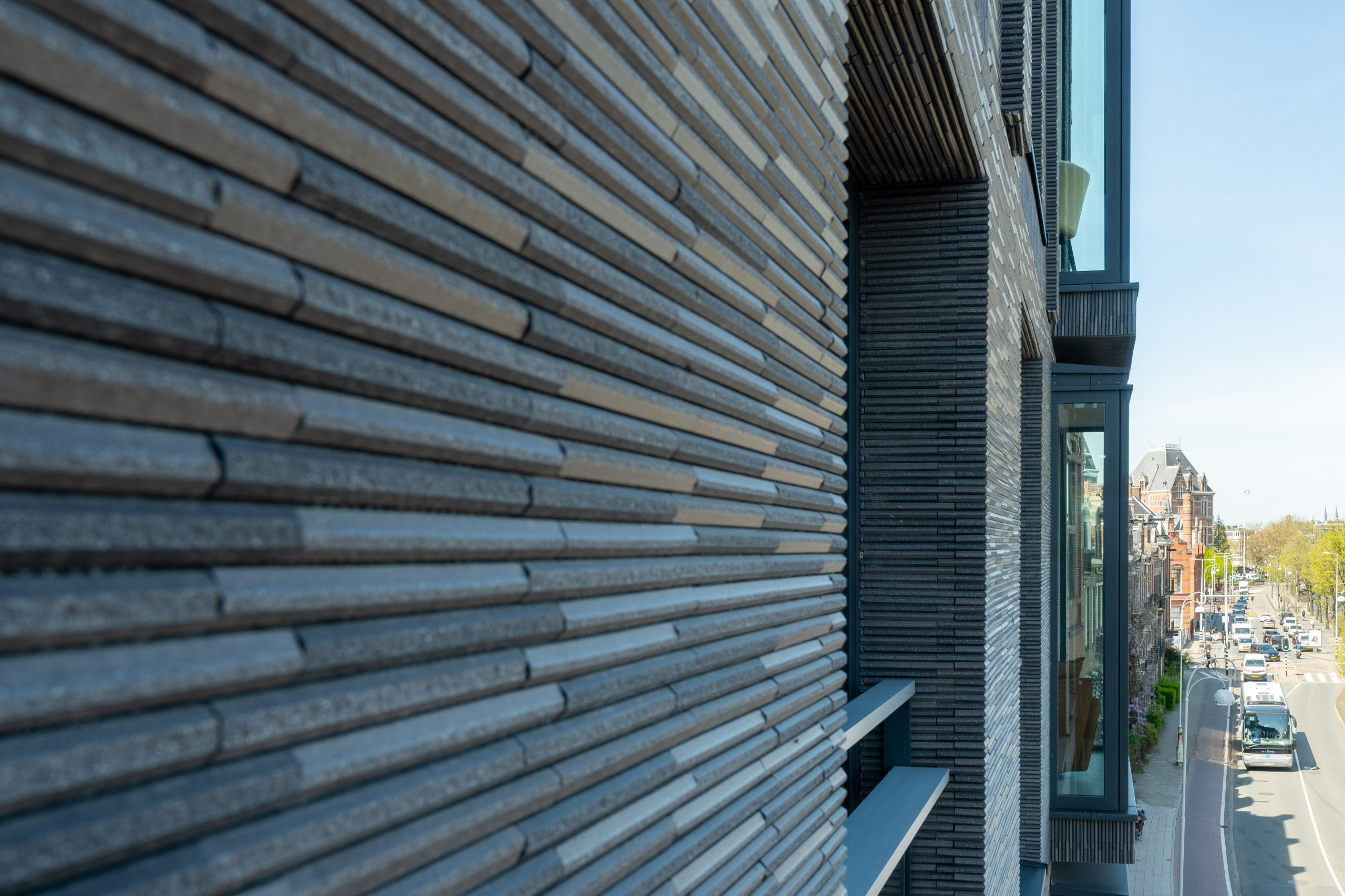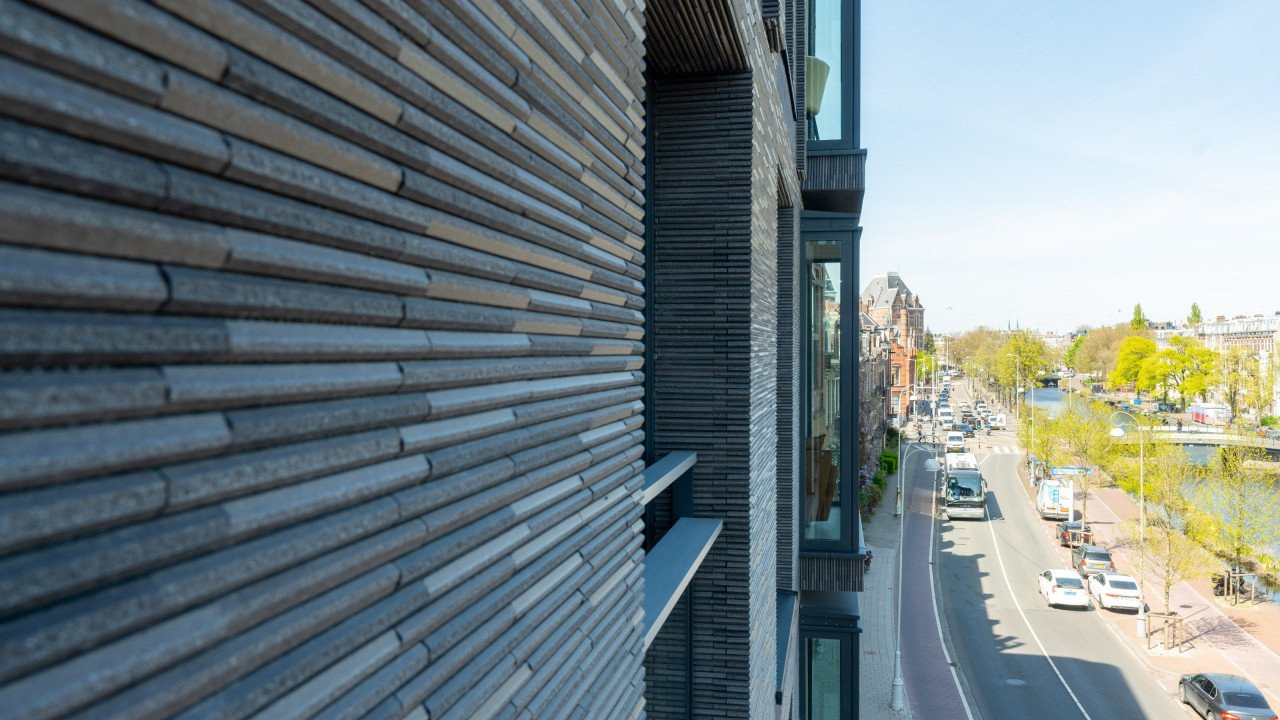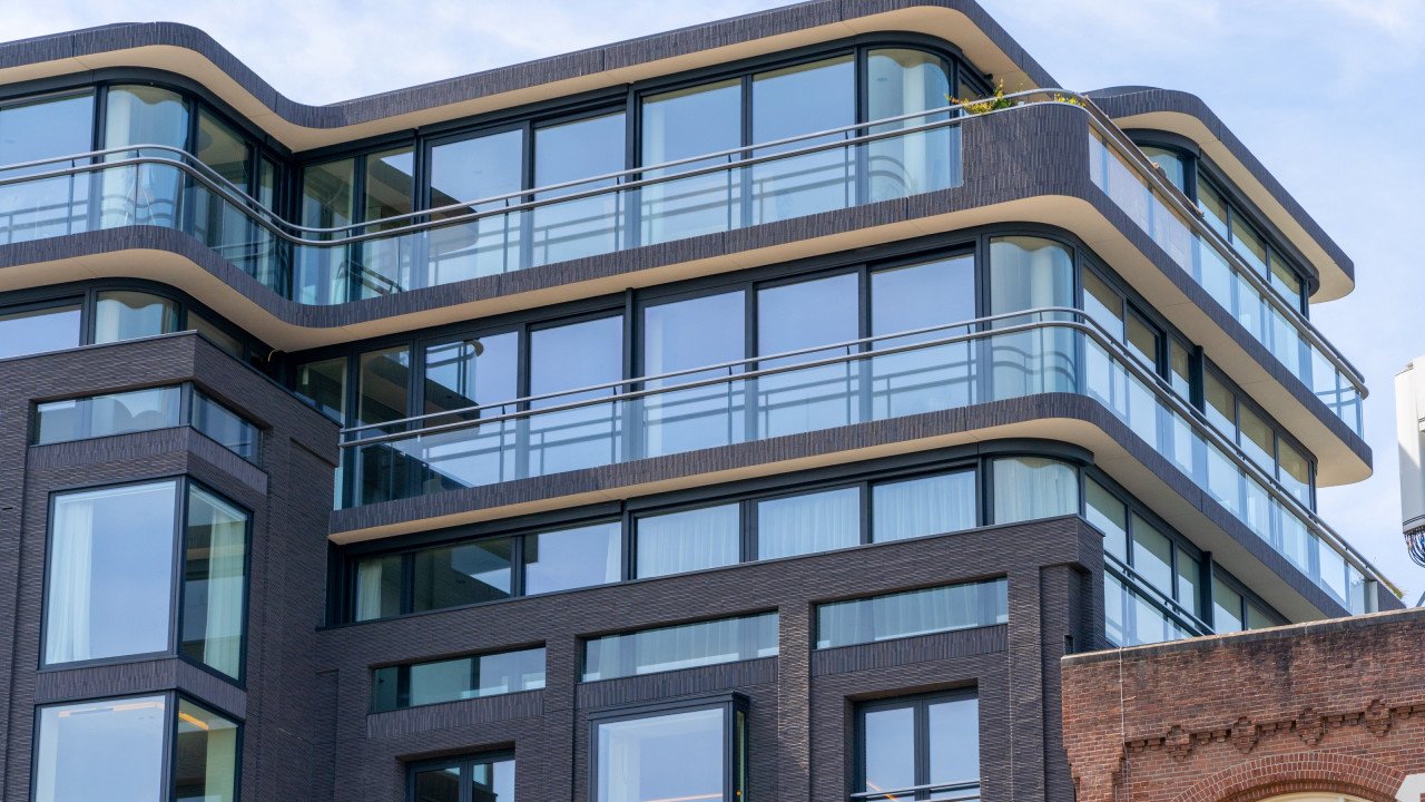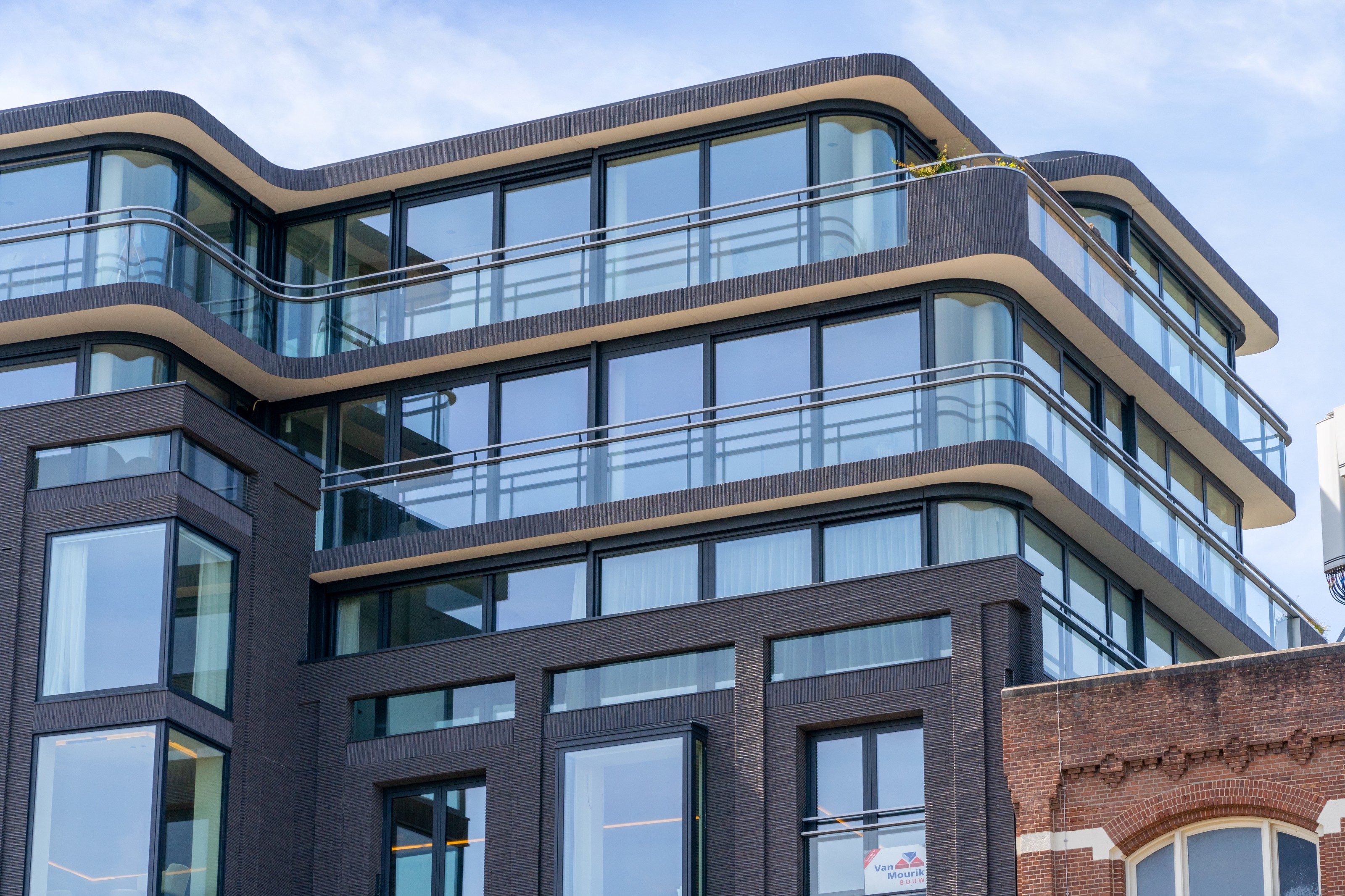 In plaats van een stevig hard bouwblok neerzetten, waren Schilder en Griffioen juist op zoek naar een vorm van elegantie. Dat vonden ze in de afgeronde hoeken van de balkons. “Met die speelsheid die je daarmee inbrengt, laat je de dynamiek van de stad goed zien,” beargumenteert Schilder. “Er is een prachtig uitzicht op het Museumplein maar daarnaast wil je ook de privacy van bewoners én omwonenden waarborgen. Je hebt altijd te maken met een bestaande context. Dat betekent dat je niet alle ramen zo kunt positioneren zoals je ze wilt hebben. Dat is het spel dat we hebben gespeeld met de terug getrapte balkons. Ook door op strategische plekken plantenbakken te plaatsen, zorgen we dat bewoners een mooi uitzicht hebben zonder dat ze inboeten op hun privacy.” Om de transparantie te behouden, bevat De Hooch veel kozijnen en grote raampartijen. Schilder legt uit: “We waren op zoek naar een leverancier die in dit project geloofde. Dat bleek gevelbouwer Facédo in combinatie met Reynaers Aluminium. Het is immers een groot gebouw van wel 25 meter hoog. We hadden dus grote volumes nodig. Maar ook nog eens met een grote diversiteit aan puien. Ronde puien, tweedelige en driedelige puien en deuren.