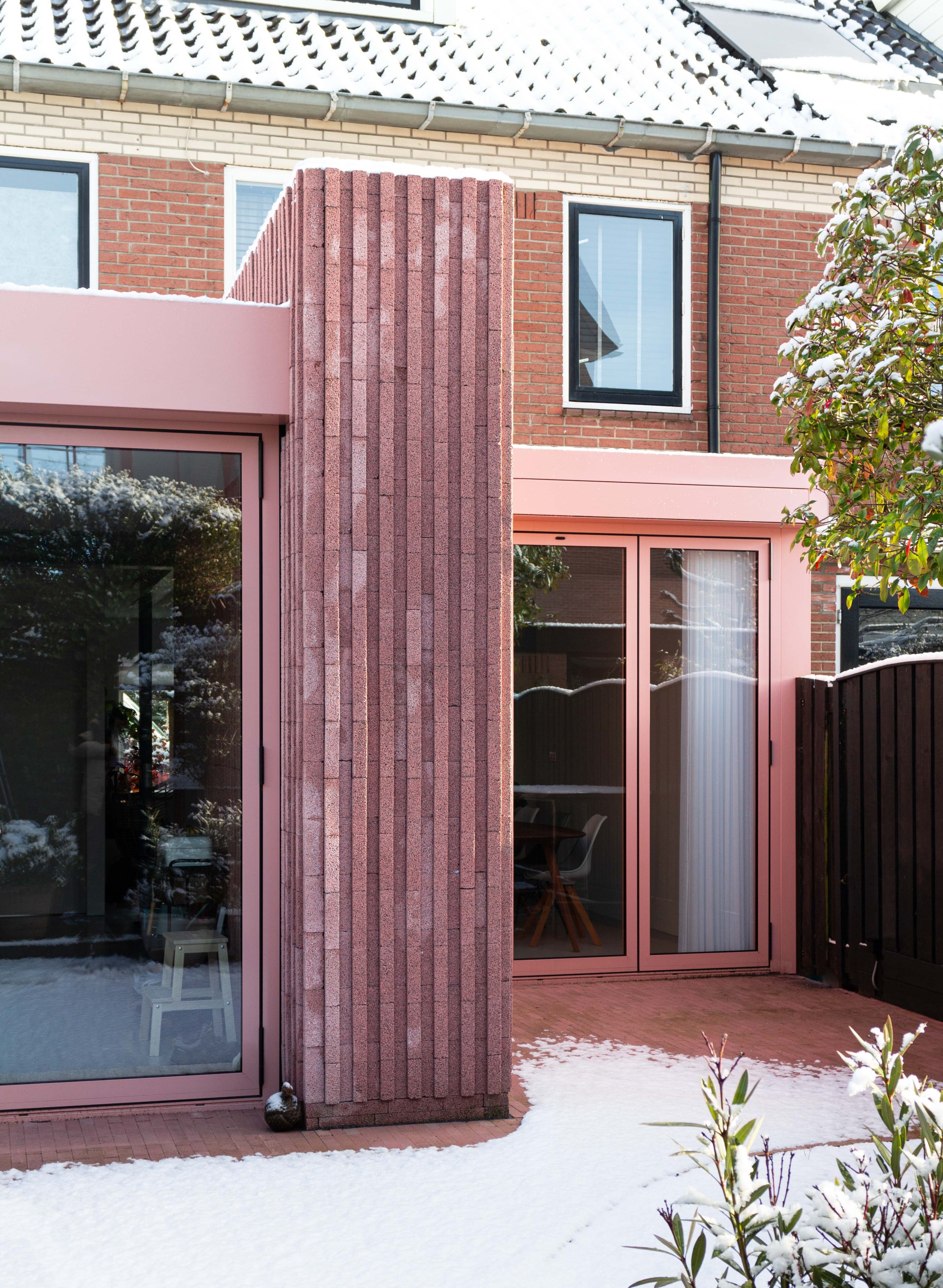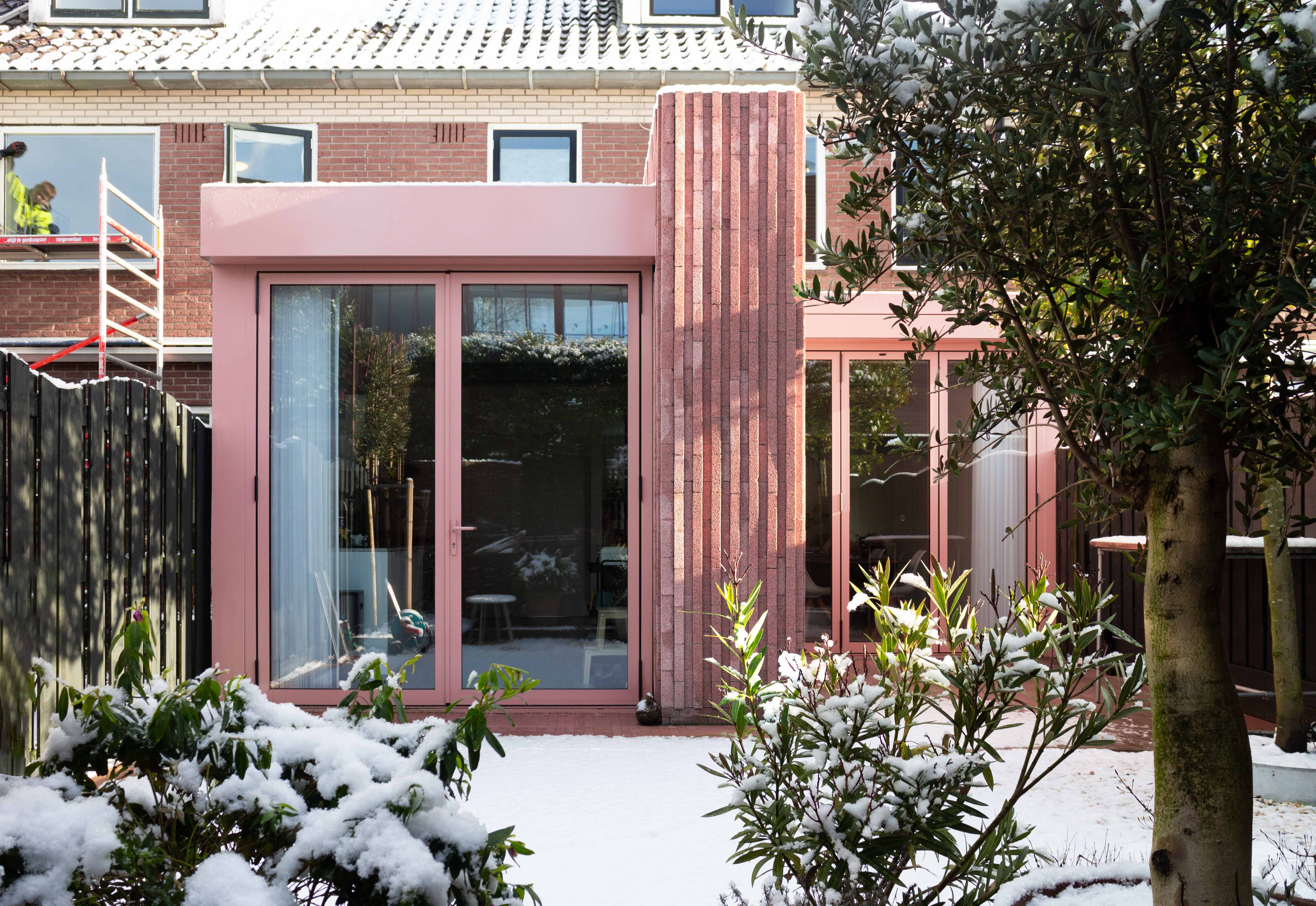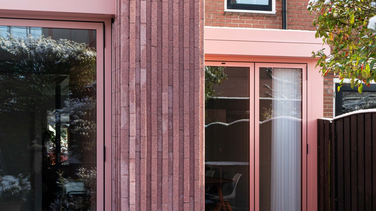Een kleurenpalet in zachtroze is zorgvuldig gekozen om harmonieus aan te sluiten bij de aardetinten van de omgeving. Het veelzijdige element, vervaardigd uit ruwe betonblokken, vormt een naadloze verbinding tussen het interieur en exterieur. Bij het openen van de aluminium puien ontstaat een uitgestrekte leefruimte die de grenzen tussen binnen en buiten vervaagt.