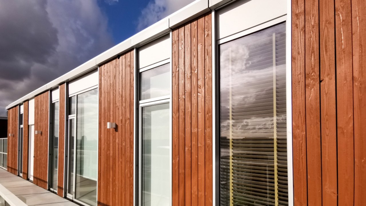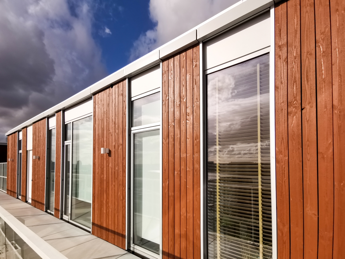 Op het constructieve ‘tafelblad’ boven de loods is een grote binnentuin aangelegd waar bewoners elkaar kunnen ontmoeten. Hier ontvouwt de Fenix Lofts zich tot een intiem wooncomplex. Door de lofts te stapelen van zes verdiepingen aan de landzijde naar negen aan de noordkant aan de Rijnhaven, valt de zon genereus in deze gedeelde buitenruimte. De gevels zijn vervaardigd van hout, dat op elke onderliggende verdieping een lichtere tint heeft, zodat de lager gelegen woonlagen optisch lichter ogen. De subtiele aluminium kozijnen zijn net als de trappen en balustrades uitgevoerd in gebroken wit.