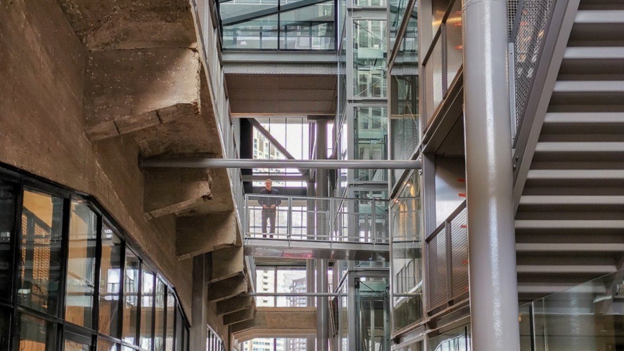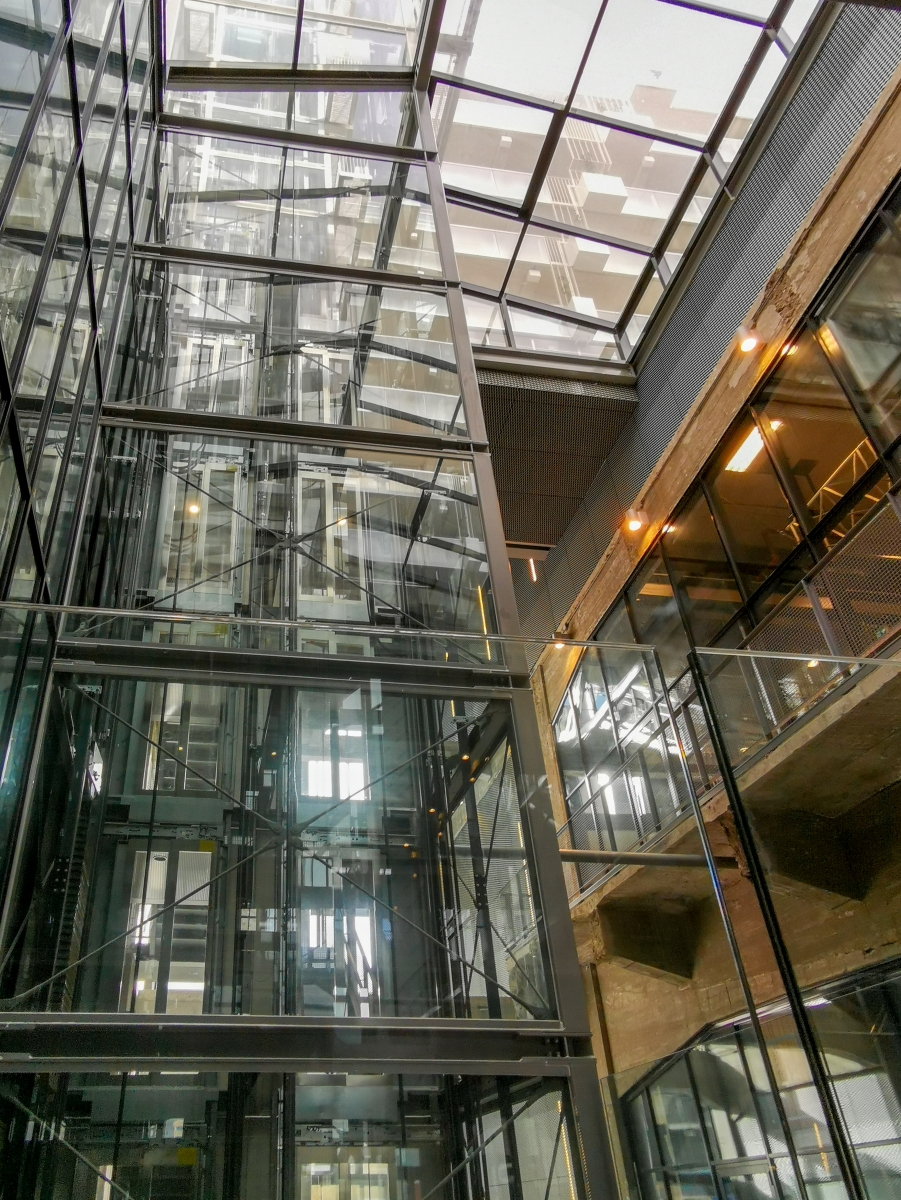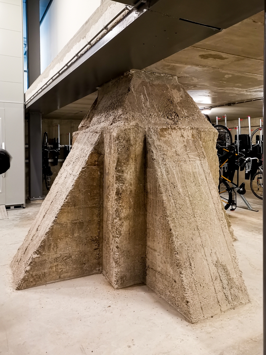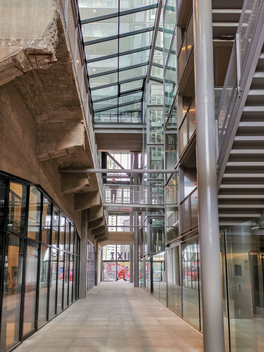 Het constructieve vernuft van Fenix I is ongekend qua schaal en complexiteit. “Voor de fundering van de Fenix Lofts moest plek worden gevonden tussen de bestaande betonnen funderingspoeren.” Deze botsing tussen oud en nieuw is zichtbaar gehouden; in de passage staan de nieuwe stalen kolommen naast de bestaande betonnen kolommen en draagbalken waarop het oude gebouw is gestut. In de historische straatgevel van de loods zijn de originele openingen behouden en voorzien van eigentijdse puien, die hinten naar de bovengelegen nieuwbouw. Tegelijkertijd is het historische treinspoor langs de gevels weer zichtbaar gemaakt. “Ooit reden er gewoon treinen dóór het gebouw. Die grootsheid hebben we zichtbaar gehouden.” De paradox is dat dit gebouw van superlatieven gemaakt kon worden dankzij een crisis. “In de huidige tijd van stijgende materiaal- en bouwkosten had het waarschijnlijk niet gerealiseerd kunnen worden.”