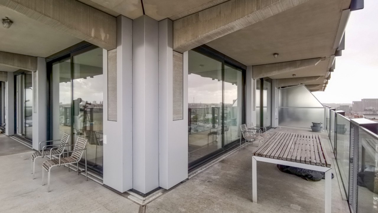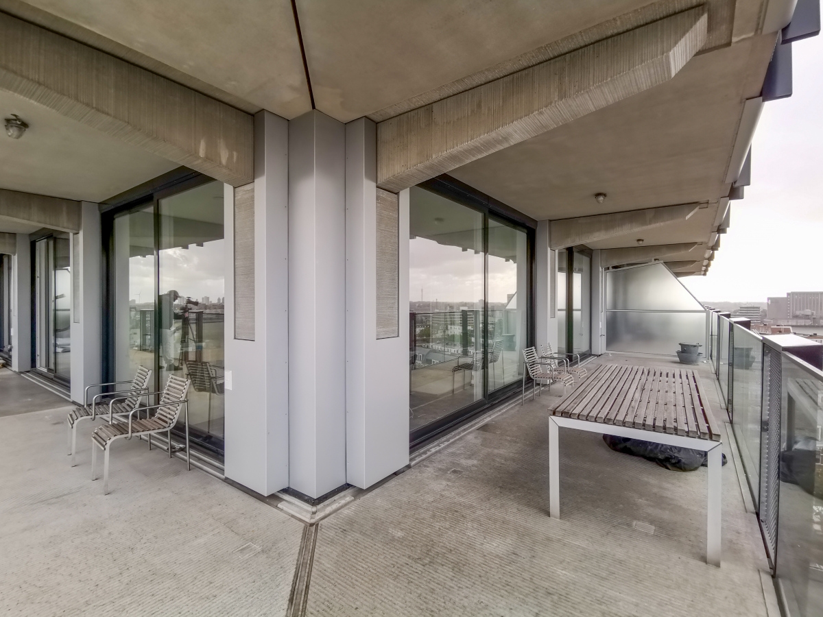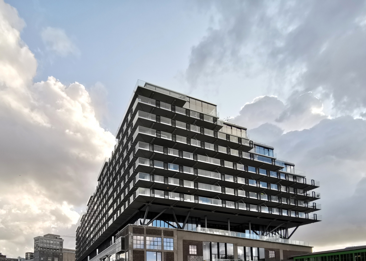 De lofts hebben glasgevels met een lichtgewicht aluminium schuifpui, wat de aanblik transparant en de interieurs licht maakt. Elke loftgevel kan met één soepele handbeweging voor de helft worden geopend naar het balkon. De zwevende balkons zorgen voor een ranke horizontale belijning van de gevel. In de glazen begrenzing van de balkons staan forse stalen U-profielen die door de krachtige repetitie de geometrie van de gevel benadrukken. “Door de bovenkant van deze speciaal ontwikkelde U-profielen breder te maken, zijn deze ‘mijmerbeugels’ heerlijke staplekken. De balkons zijn riant, en rondom 2,5 meter diep, zodat zelfs op twintig meter hoogte een enorm buitengevoel wordt ervaren, mét riant uitzicht over de Maas of Katendrecht.”