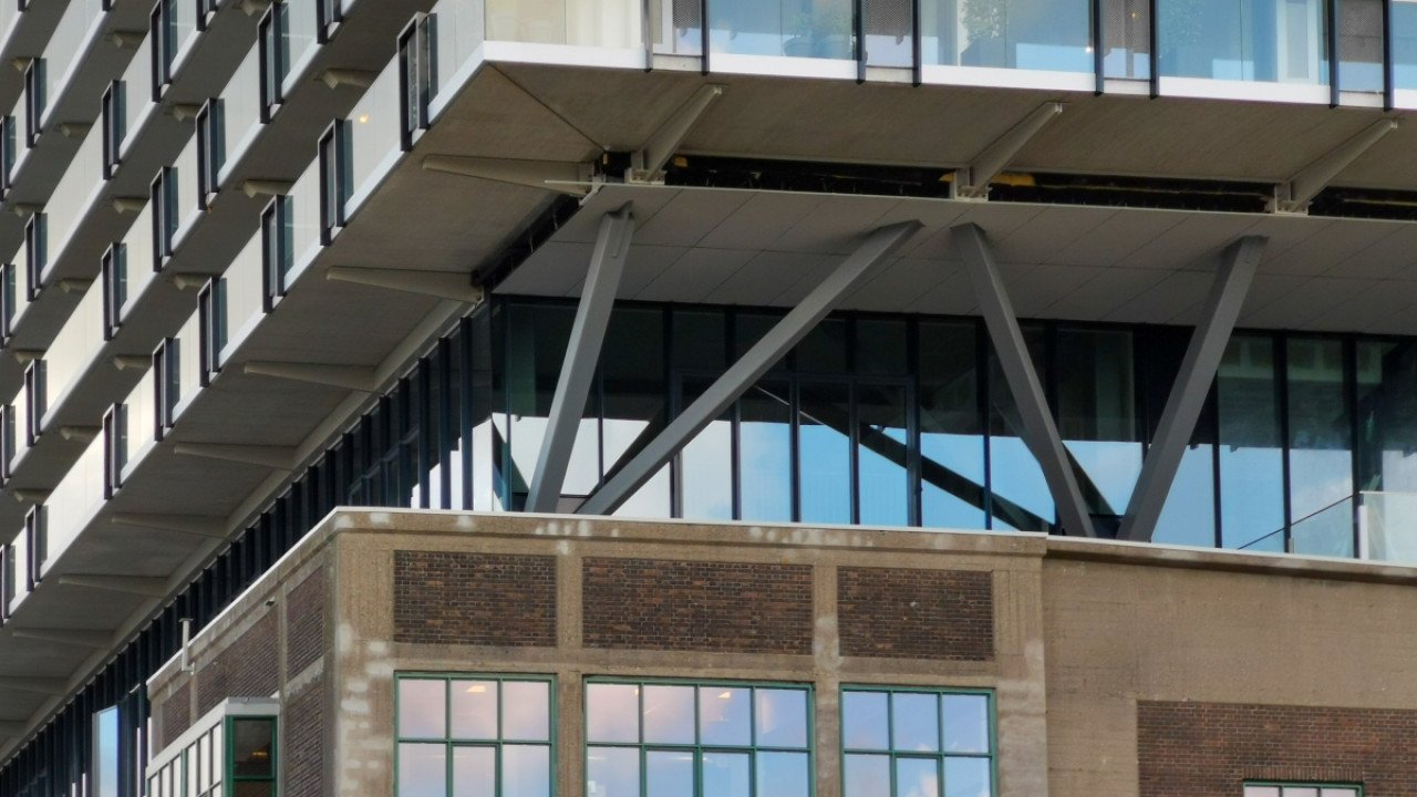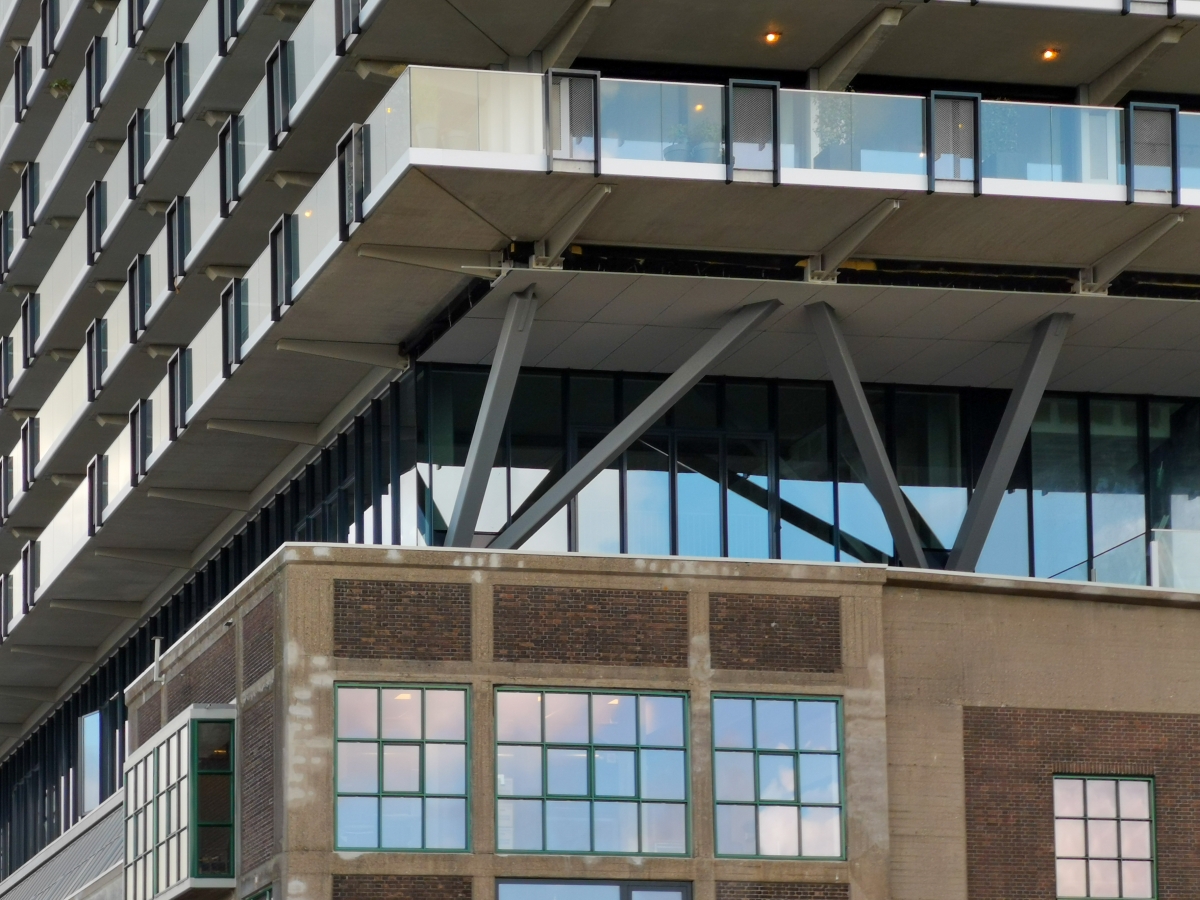 Gezien vanaf de Kop van Zuid is Fenix I een intrigerend bouwwerk: hoe kan op die eeuw-oude havenloods zo’n kolos van glas, staal en beton rusten? De baksteen muren van dit monumentale gebouw kunnen dit gewicht onmogelijk dragen. Toch sluit de nieuwbouw van maar liefst negen woonlagen zonder zichtbare draagconstructie naadloos aan op de loods. “Door de oudbouw zijn bijna veertig stalen kolommen geslagen”, verduidelijkt Robert Winkel van Mei Architects & Planners. “Op deze staalconstructie is als het ware een tafelblad gelegd, waarop de nieuwbouw van beton is gebouwd met vakwerkliggers. Constructief zijn het twee afzonderlijke gebouwen. In totaal is in deze constructie anderhalf miljoen kilo staal verwerkt.”