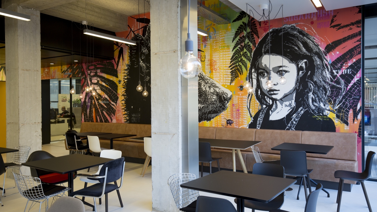 Bij de vier kantoorentrees zijn vides gemaakt, met rondom ontmoetings- en ontspanningsruimtes over de volle diepte van het pand, zoals de receptie, bezoekerslounge, een koffiebar, een ruimte voor sport en een restaurant. Minstens zo belangrijk voor een fijne werkomgeving zijn uitstekende akoestische prestaties, verzekert Haumann: “Om de ruimte gevoelsmatig en akoestisch niet te hard te maken hebben we diverse stofferingen aangebracht. Natuurlijke materialen zoals hout, touw, leer en stof zorgen voor de zachtheid, die nodig is om je thuis te voelen. De warme kleuren van zon, zand en aarde ondersteunen dit.”