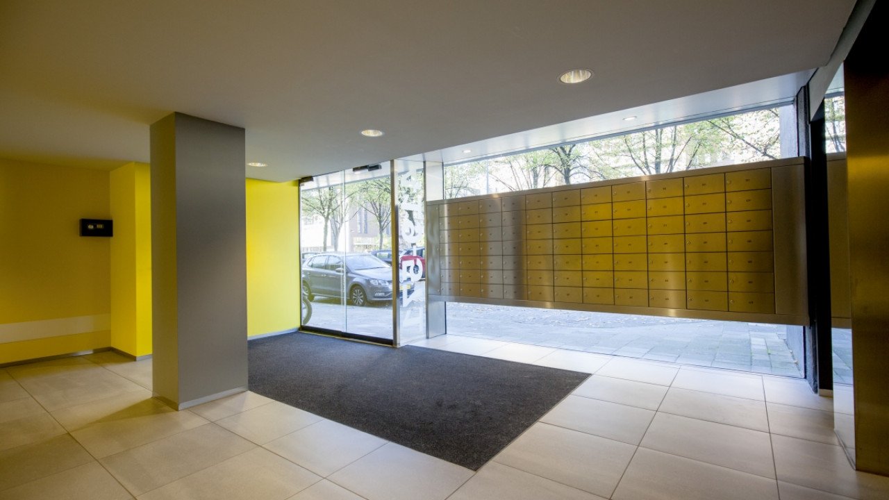 De Gunst: “Met vrij goedkope middelen zoals schilderwerk, kunnen we ondanks het beperkte budget toch een hele frisse uitstraling geven aan deze ruim 50 jaar oude flat. De entreehallen en trappenhuizen zijn fel geel geschilderd, dat contrasteert mooi met de zwarte traphekken. Aan de buitenzijde zijn de twee trappenhuizen in een donkergrijze tint geschilderd met in glans de naam De Boel erop. De assen van de uitwendige wenteltrappen zijn eveneens in een donkere kleur geschilderd, en de treden in wit, zo versterken we de sierlijke vorm ervan.”