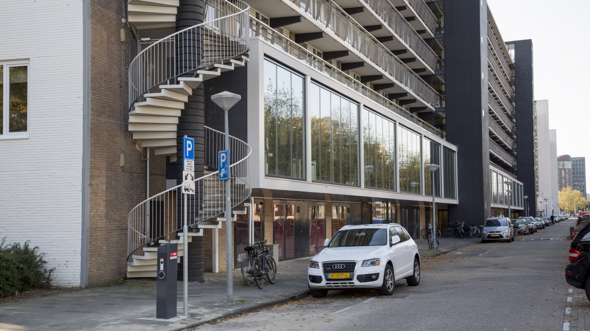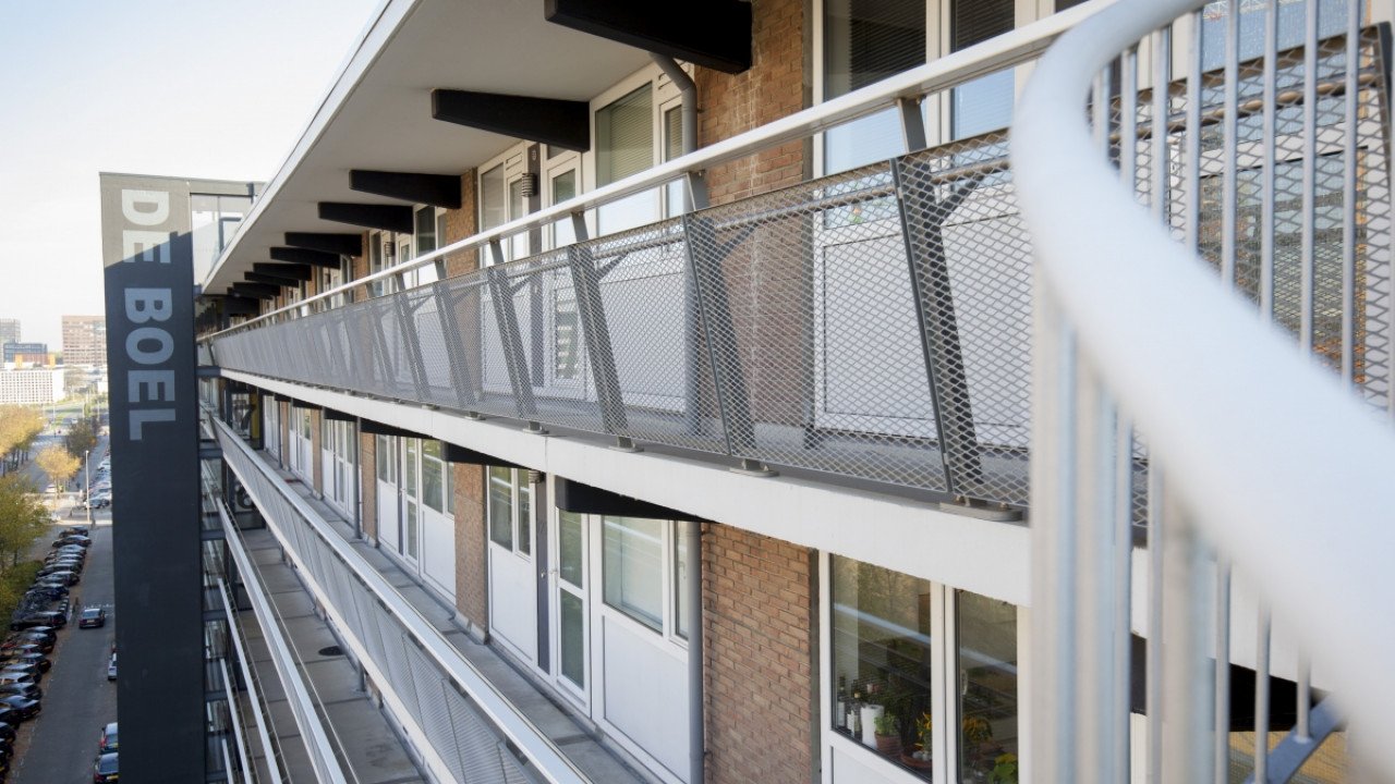 Dick de Gunst, architect bij Hans van Heeswijk architecten, licht de transformatie toe: “Voor hetzelfde budget als de buurflat hebben we De Boel gerenoveerd, maar de uitstraling is totaal anders. Het belangrijkste verschil is de transparantie. Zo hebben we door toepassing van strekstaal balustrades de balkons en galerijen veel transparanter gemaakt. De schuine plaatsing van de hekken doet de galerijen breder en balkons groter lijken.” Ook de begane grond en eerste verdieping hebben een metamorfose ondergaan. De Gunst legt uit hoe: “Glazen deuren maken de voorheen zeer gesloten begane grond opener. Een groot deel van deze laag bestaat nu uit in felle kleuren geschilderde parkeerplaatsen voor elektrische BMW’s, die bewoners en medewerkers van Vesteda samen delen.” Overdag gebruiken de medewerkers veelal de auto’s, terwijl ’s avonds en in het weekend de bewoners meer gebruik maken van de deelauto’s. Het systeem moet medewerkers van Vesteda ertoe verleiden om met openbaar vervoer of fiets naar het werk te komen.