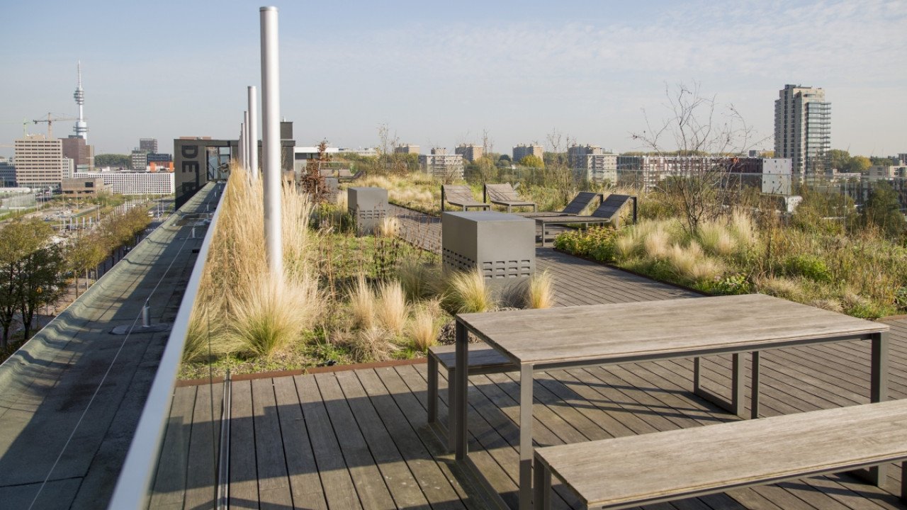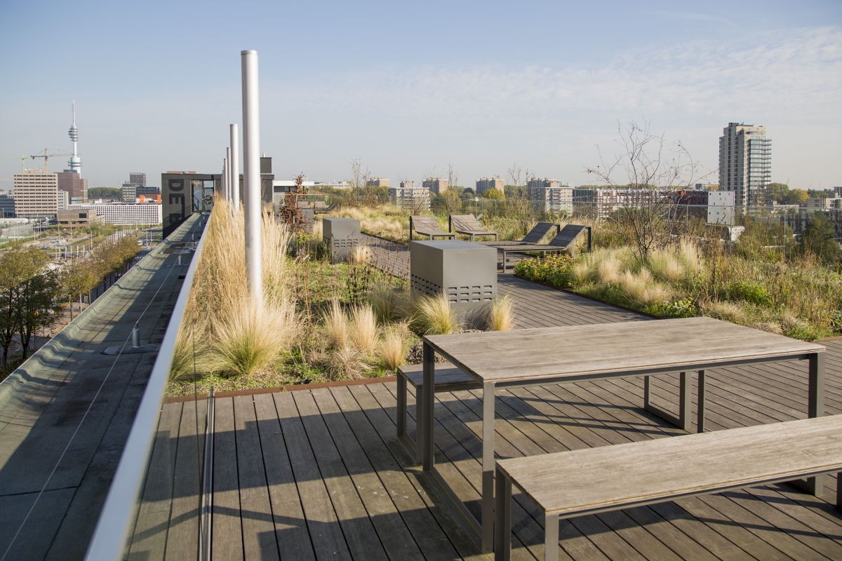 De gemeenschappelijke daktuin (750 m2) biedt een spectaculair uitzicht. Ook deze ruimte hebben de architecten zorgvuldig ontworpen. Die zorgvuldigheid is af te lezen aan de slanke glazen balustrades met elegante rvs grepen, glanzende ontluchtingspijpen, strak meubilair in hetzelfde hout als het terras. De installaties van de onderliggende woningen zijn geïntegreerd in metalen kubusvormige elementen waarin ook verlichting en stekkerdozen zijn opgenomen.