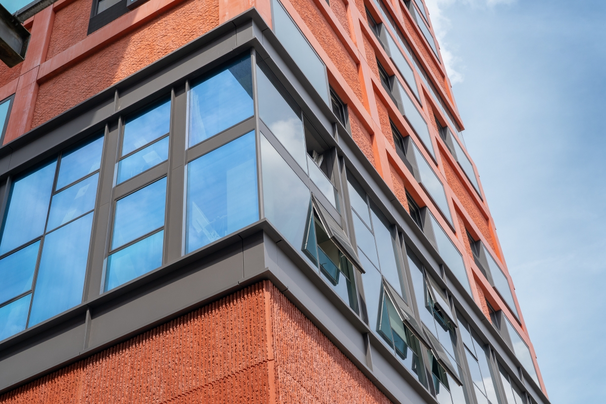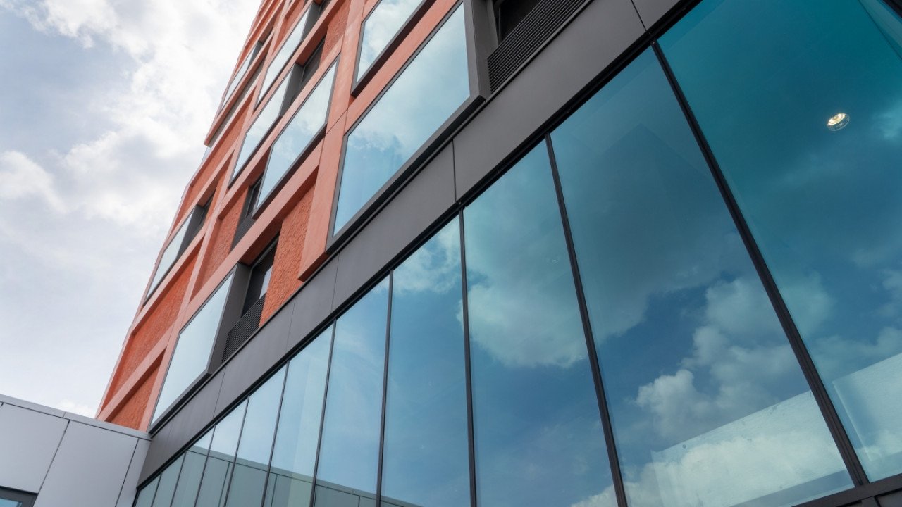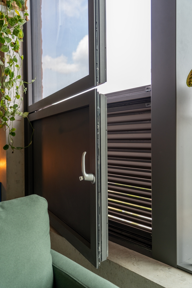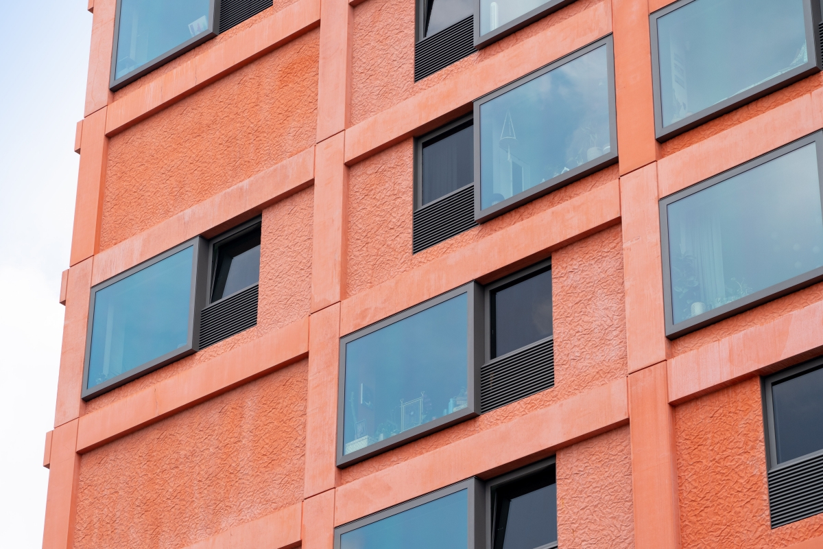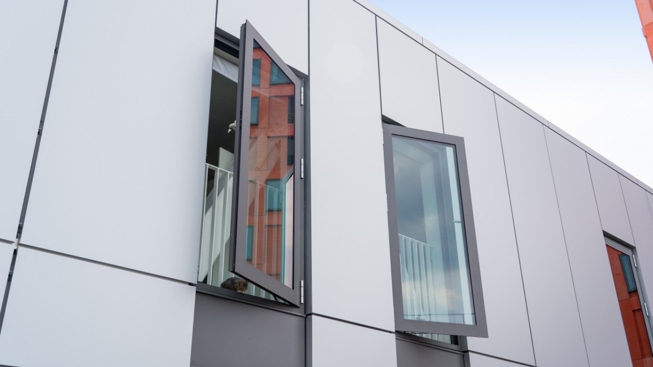 Vanuit de gemeente moest het gebouw voldoen aan de geldende geluidseisen. Hierdoor moest de raamindeling worden aangepast. VMX Architects hierover: “Het raam is nu opgebouwd uit drie delen. Een groot raam met daarnaast een filter dat het geluid absorbeert. Boven dit filter zit nog een kleiner raam dat open kan. Dit raam hebben we donker gemaakt zodat alle aandacht naar het grote raam gaat. Die beleving van zo’n groot kozijn vonden wij erg belangrijk. Je ervaart de natuur en de omgeving op die manier optimaal. De invloed van daglicht heeft een positief effect op je gemoedstoestand en leefruimte. Dat zijn zaken die voor mij als architect zwaar wegen. We zijn echt trots op het eindresultaat. Het gebouw is genomineerd voor meerdere prijzen. Dat is een mooie erkenning.”