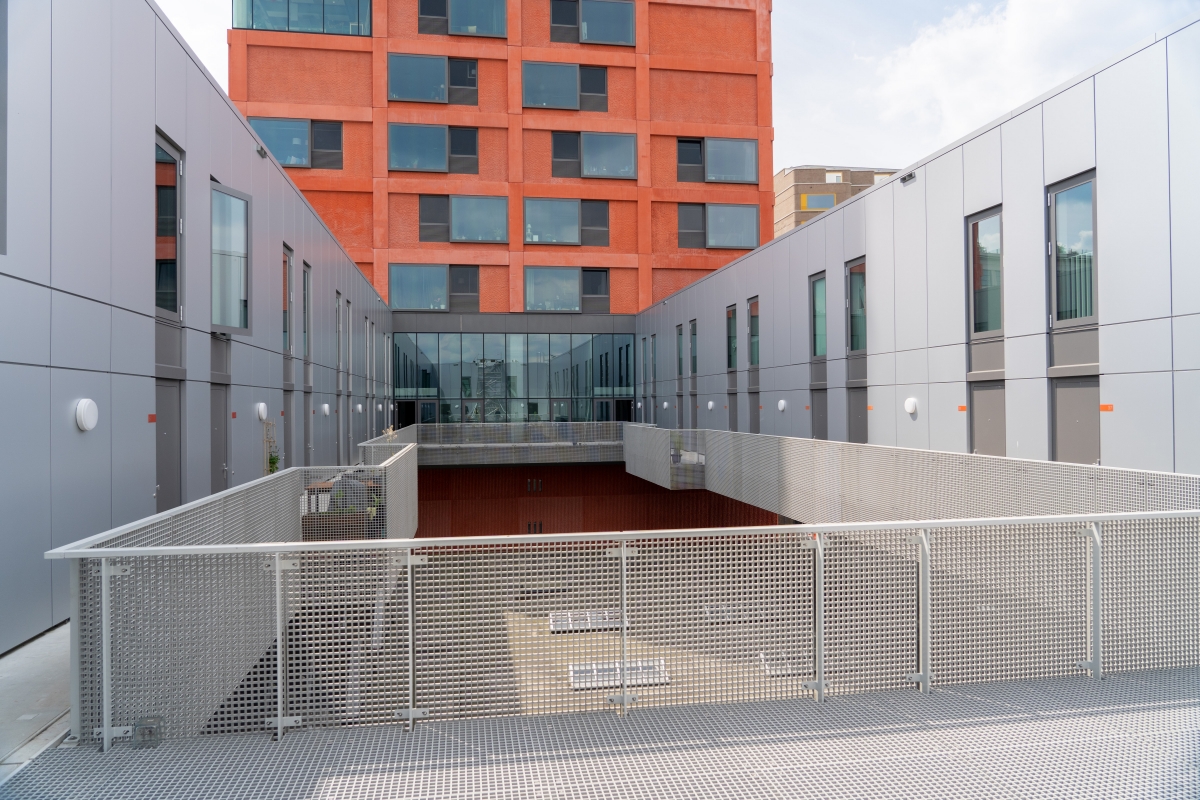 Als een groot oranje baken torent Haasje Over boven Strijp-S uit. De kenmerkende kleur en het tweelaagse bruggebouw vormen een schril contrast met de andere bebouwing in de omgeving. VMX Architects stond voor een pittige klus. Opdrachtgever Trudo wilde een toren creëren met tweehonderd starterswoningen van minder dan vijftig vierkante meter. Daarbij moest er rekening gehouden worden met een skatehal die niet mocht wijken. “De locatie op Strijp-S was prachtig maar wel te klein,” memoreert VMX Architects. “Dat betekende dat je nog verder de hoogte in moest. Dit was volgens het stedenbouwkundig plan niet toegestaan. We hebben verschillende studies gedaan naar oplossingen. De opdrachtgever kwam met de ingeving om boven de skatehal op het plein zogeheten brugwoningen te bouwen. Door de luchtruimte te verdichten, blijft er meer ruimte over rondom het plein. Het gebouw en de inwoners maken op deze manier een verbinding met de omgeving.”