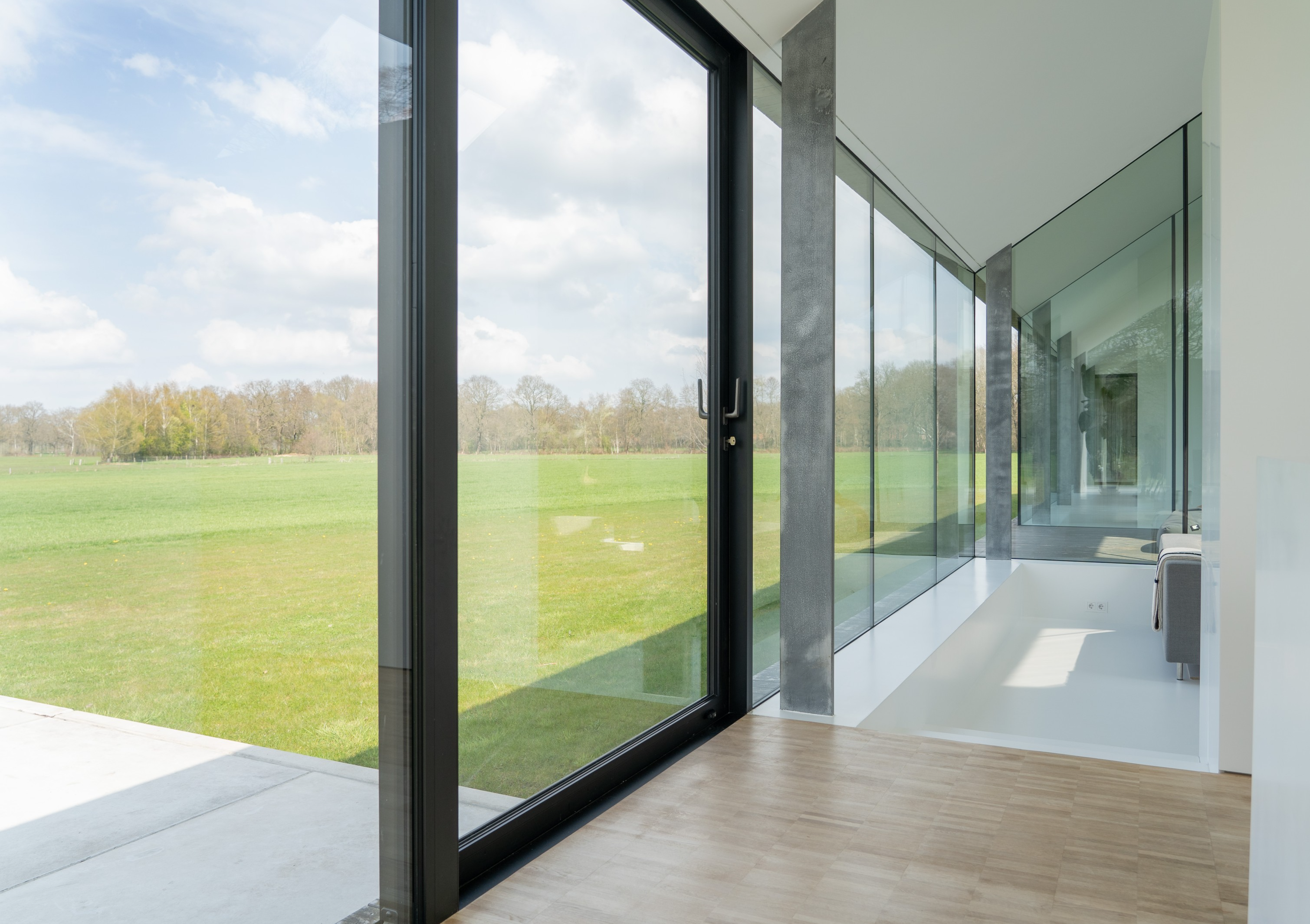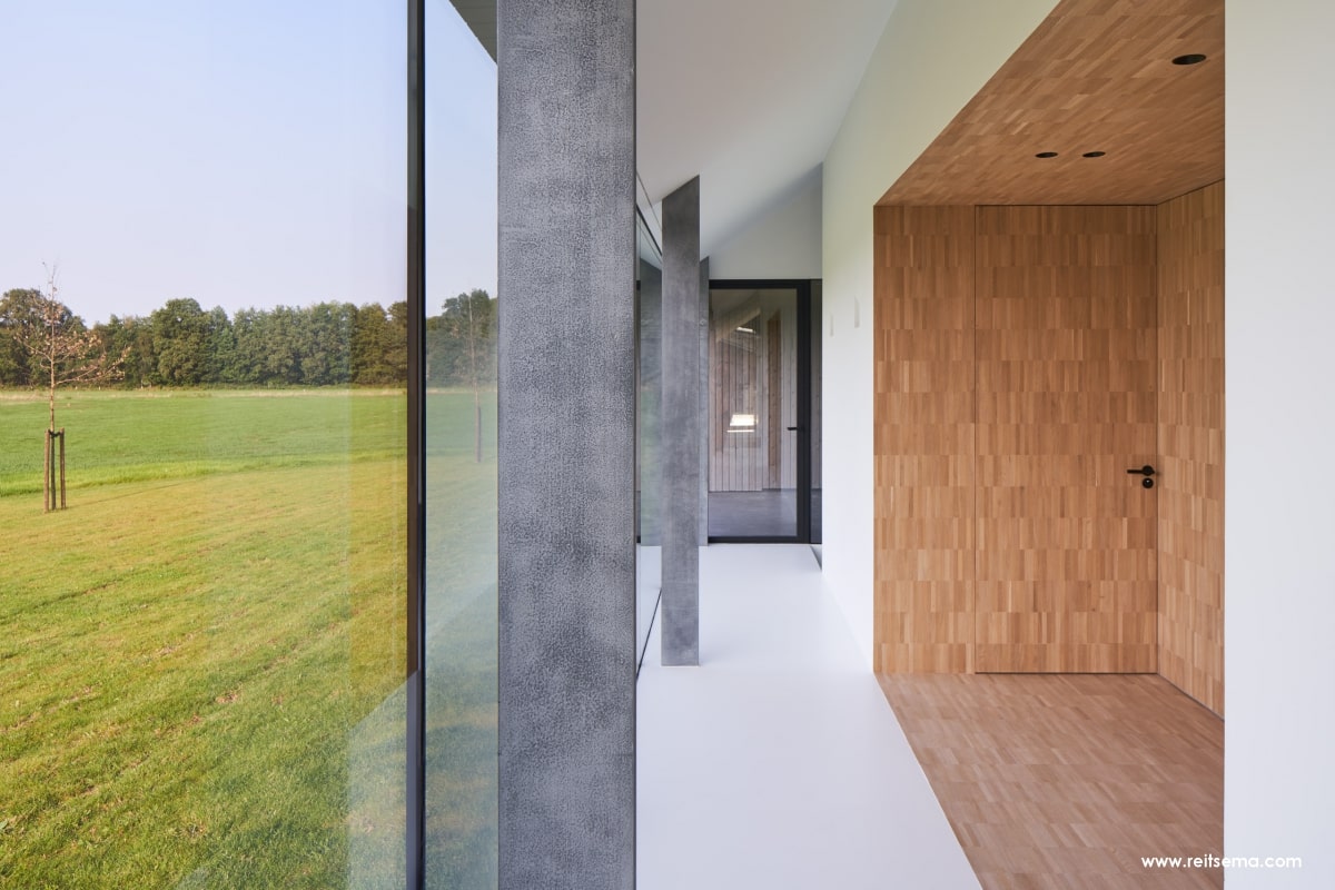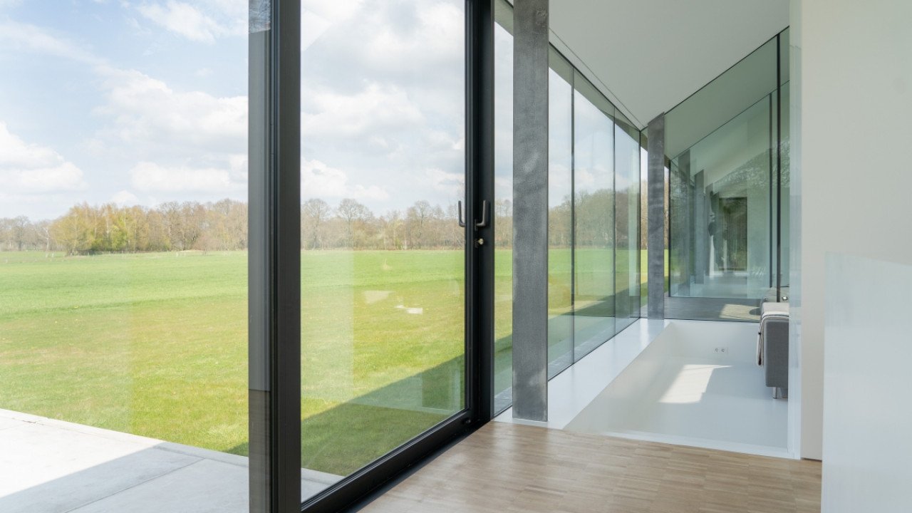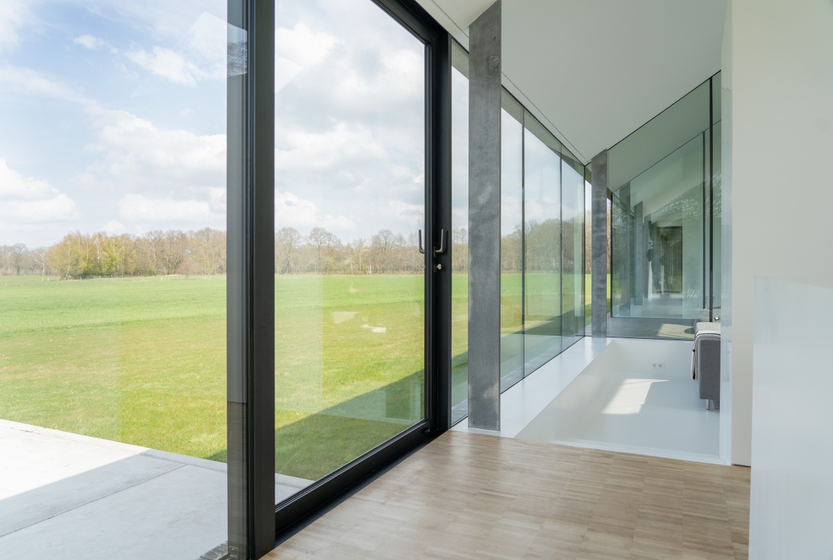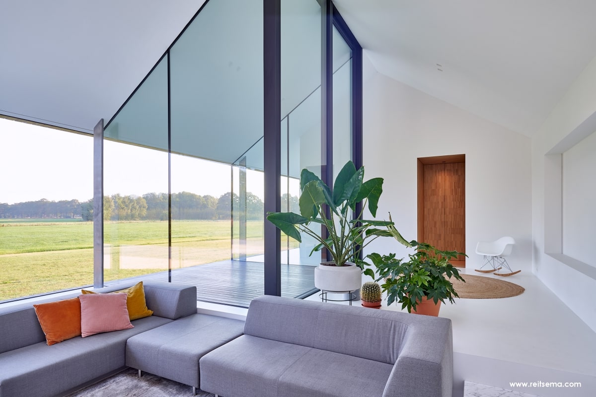 Koeien, konijnen, herten, eindeloze weilanden en bospartijen. Het zou volgens Weerink zonde zijn om de kracht van dit landschap niet te benutten. Hij droomde van een grote glazen schuifpui maar vroeg zich af of dit überhaupt mogelijk was. “Een schuifpui van 4,5 meter is een niet alledaagse maat,” vertelt Weerink. “Dit is een echt statement in de woning. De plek die buiten en binnen met een inpandig terras verbindt. Het leek een utopie maar gelukkig konden we hiervoor terecht bij Reynaers Aluminium. Zij konden een aluminium schuifpui leveren die ook qua grootte en esthetisch oogpunt aansloot bij onze wensen. De aansluiting van constructie, kozijn en dakgoot luistert nauw. Samen met de gevelbouwer OWK en hun enginering is het idee verder uitgewerkt. Ze hebben echt prachtwerk geleverd.”