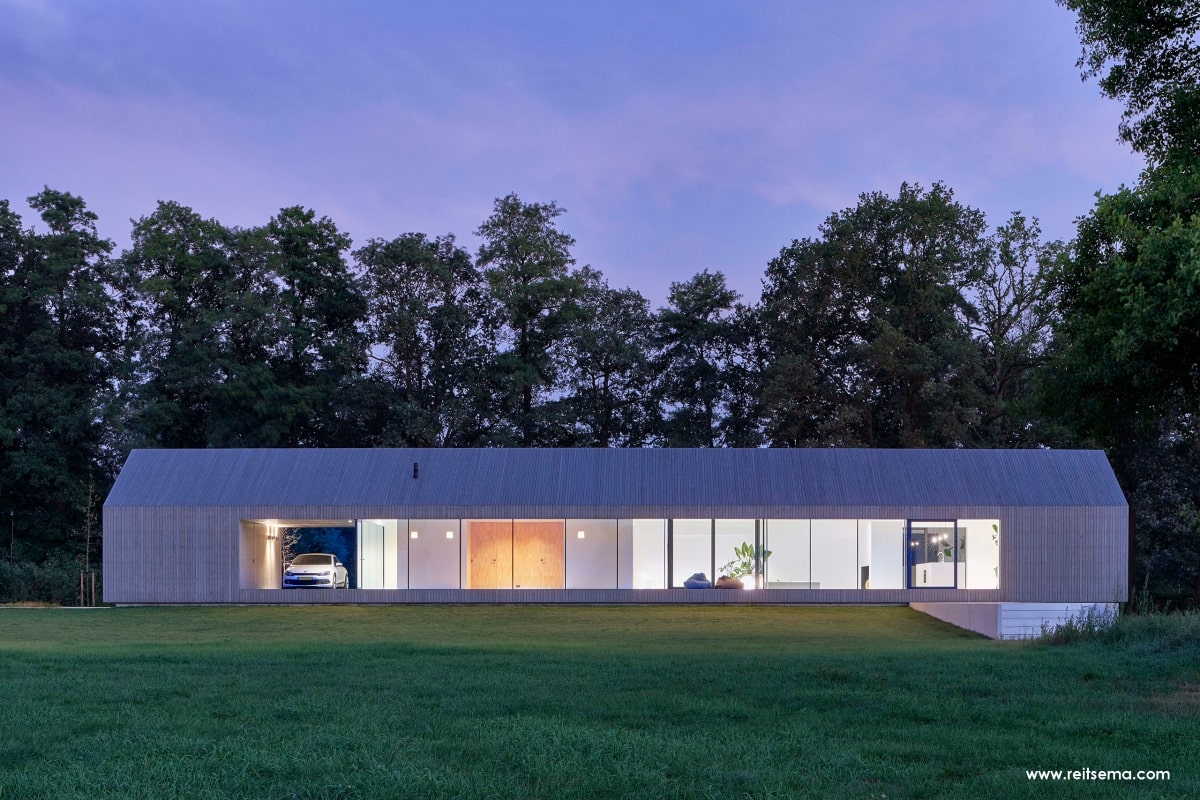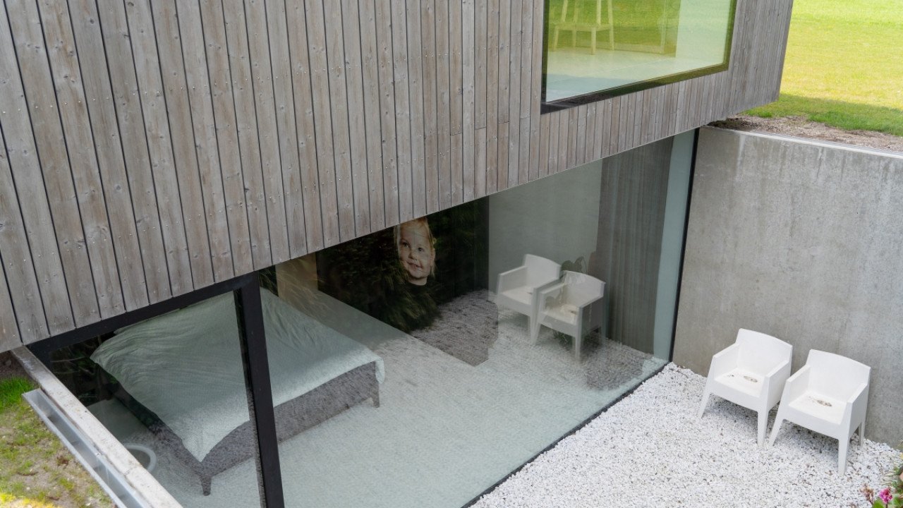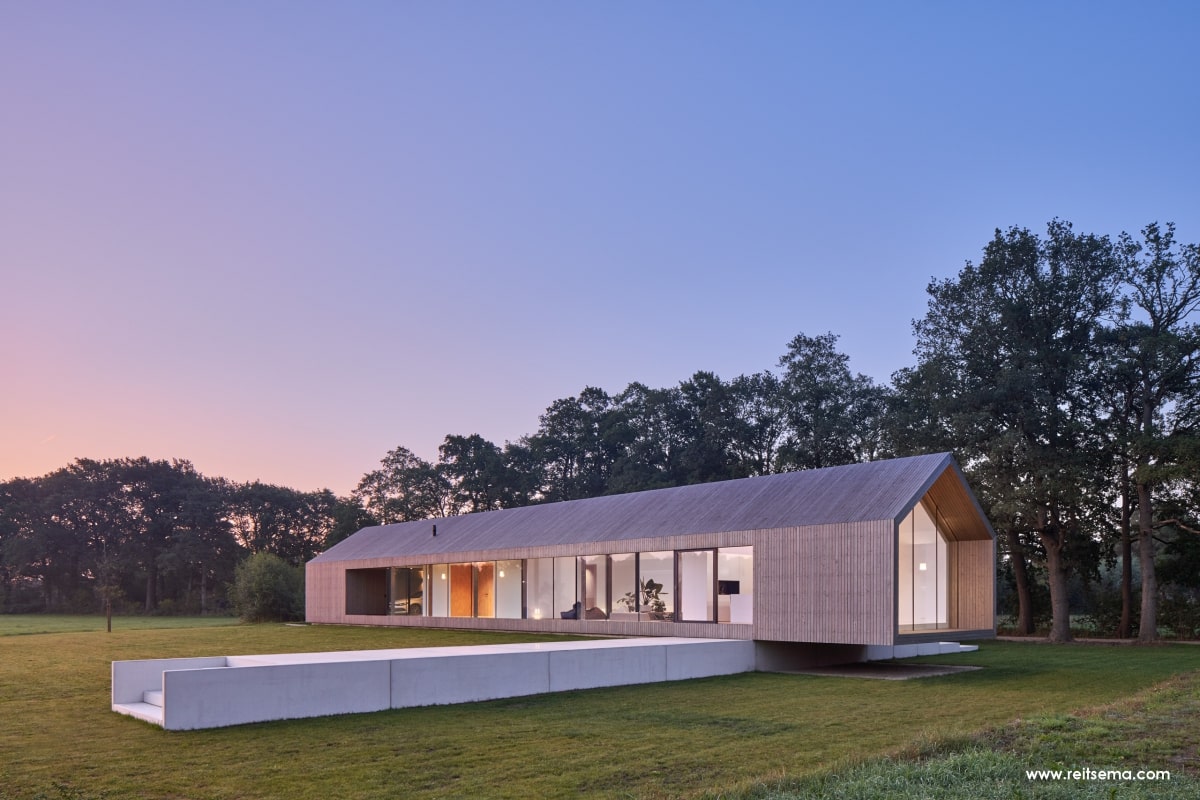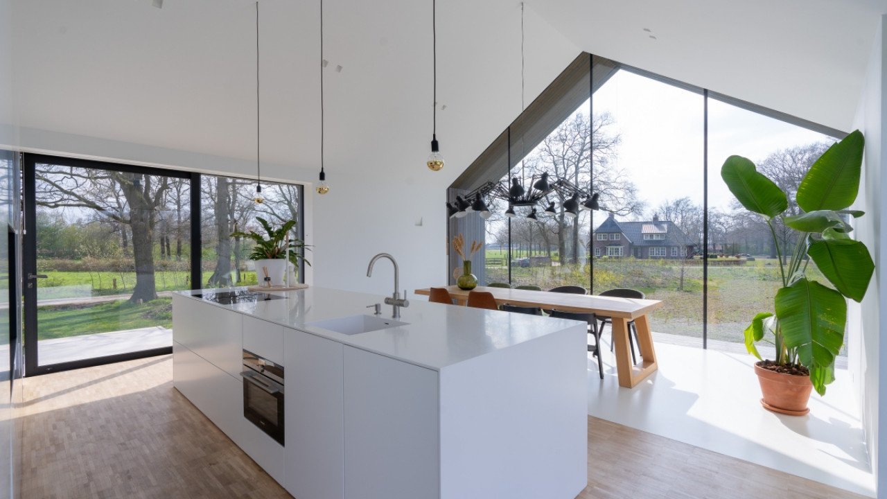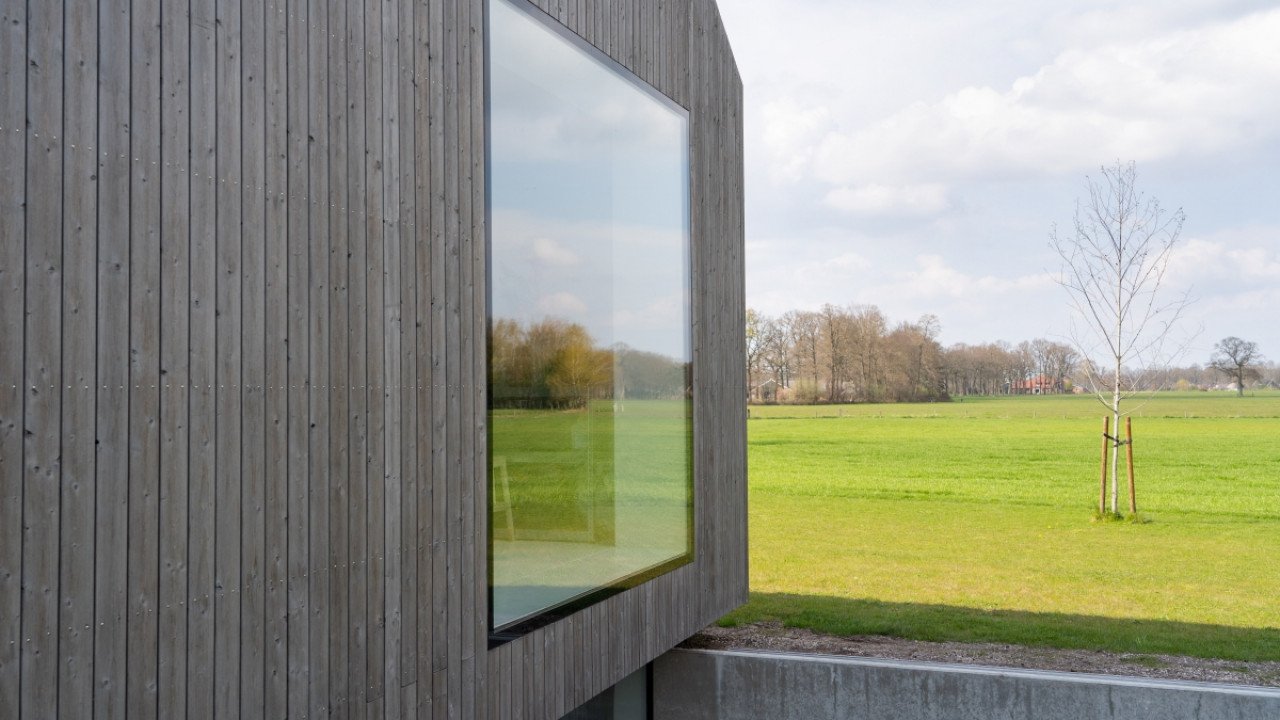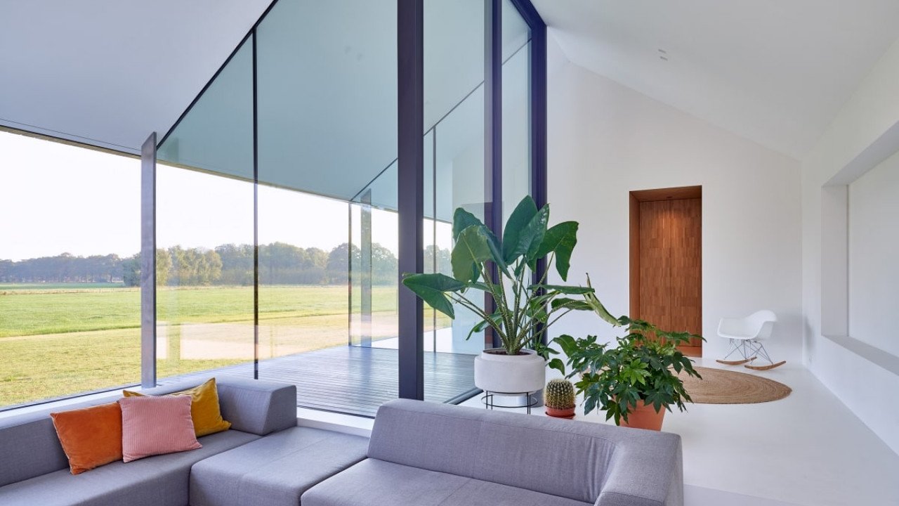 Koeien, konijnen, herten, eindeloze weilanden en bospartijen. Het zou volgens Weerink zonde zijn om de kracht van dit landschap niet te benutten. Hij droomde van een grote glazen schuifpui maar vroeg zich af of dit überhaupt mogelijk was. “Een schuifpui van 4,5 meter is een niet alledaagse maat,” vertelt Weerink. “Dit is een echt statement in de woning. De plek die buiten en binnen met een inpandig terras verbindt. Het leek een utopie maar gelukkig konden we hiervoor terecht bij Reynaers Aluminium. Zij konden een aluminium schuifpui leveren die ook qua grootte en esthetisch oogpunt aansloot bij onze wensen. De aansluiting van constructie, kozijn en dakgoot luistert nauw. Samen met de gevelbouwer OWK en hun enginering is het idee verder uitgewerkt. Ze hebben echt prachtwerk geleverd.”
