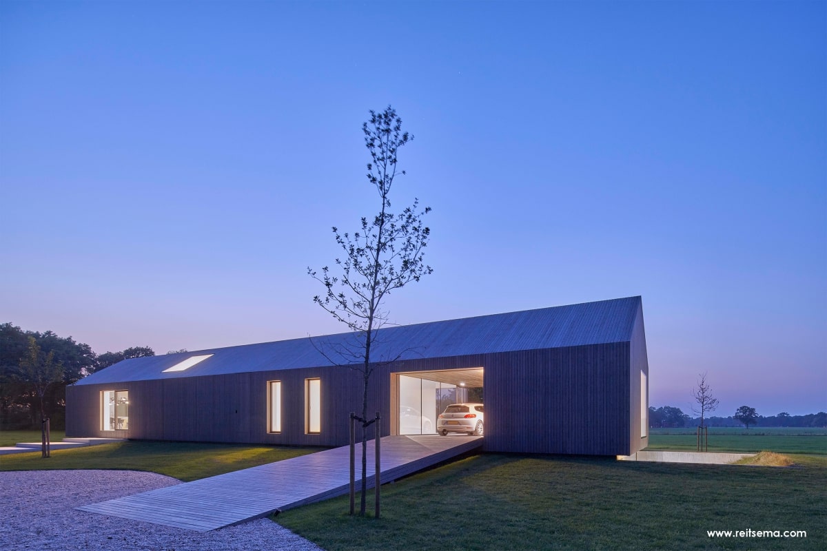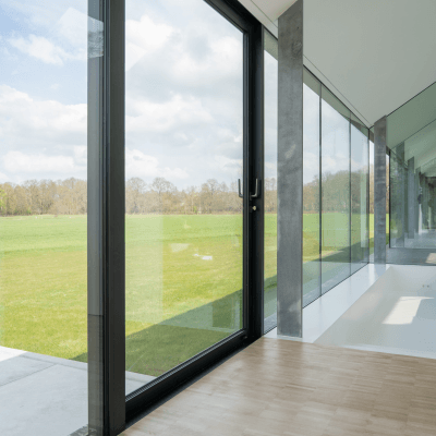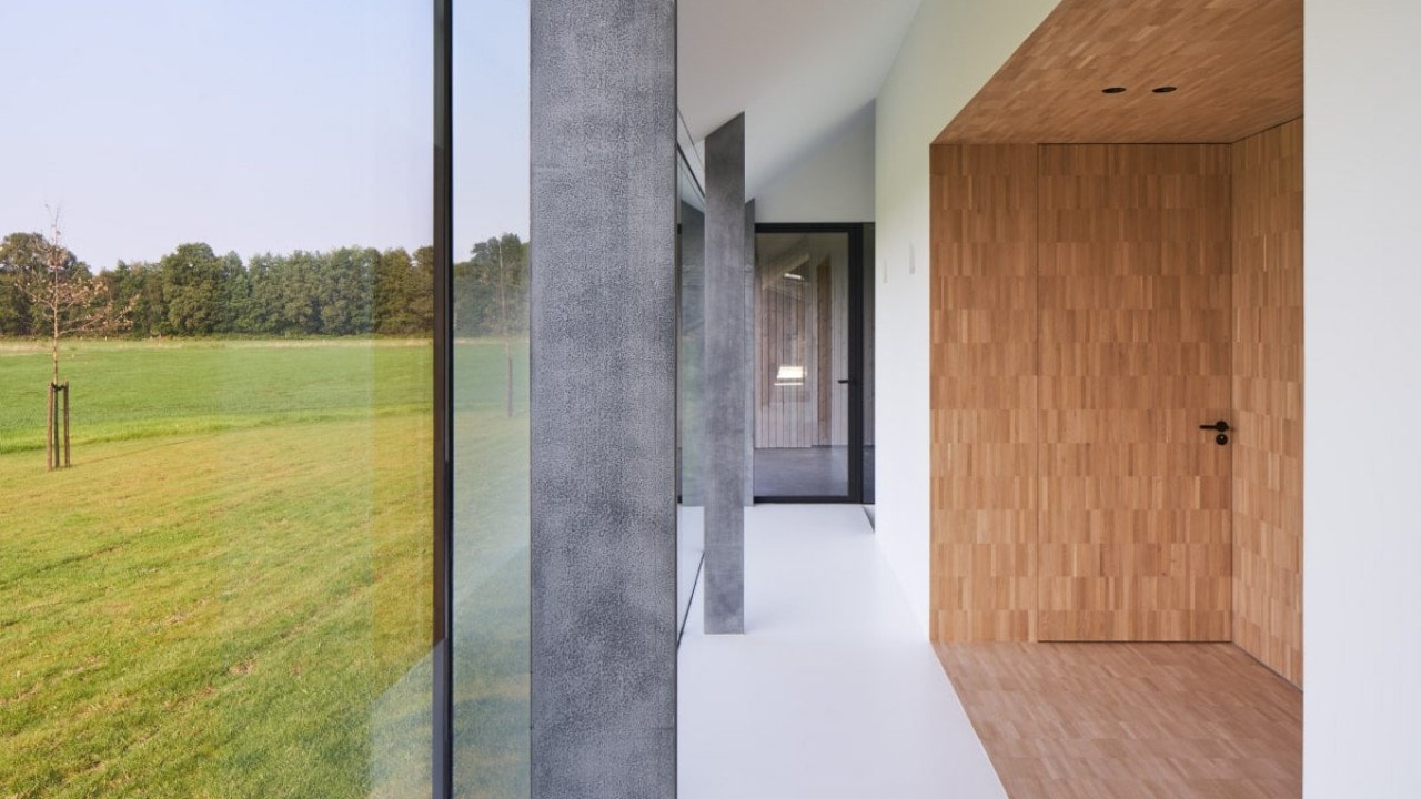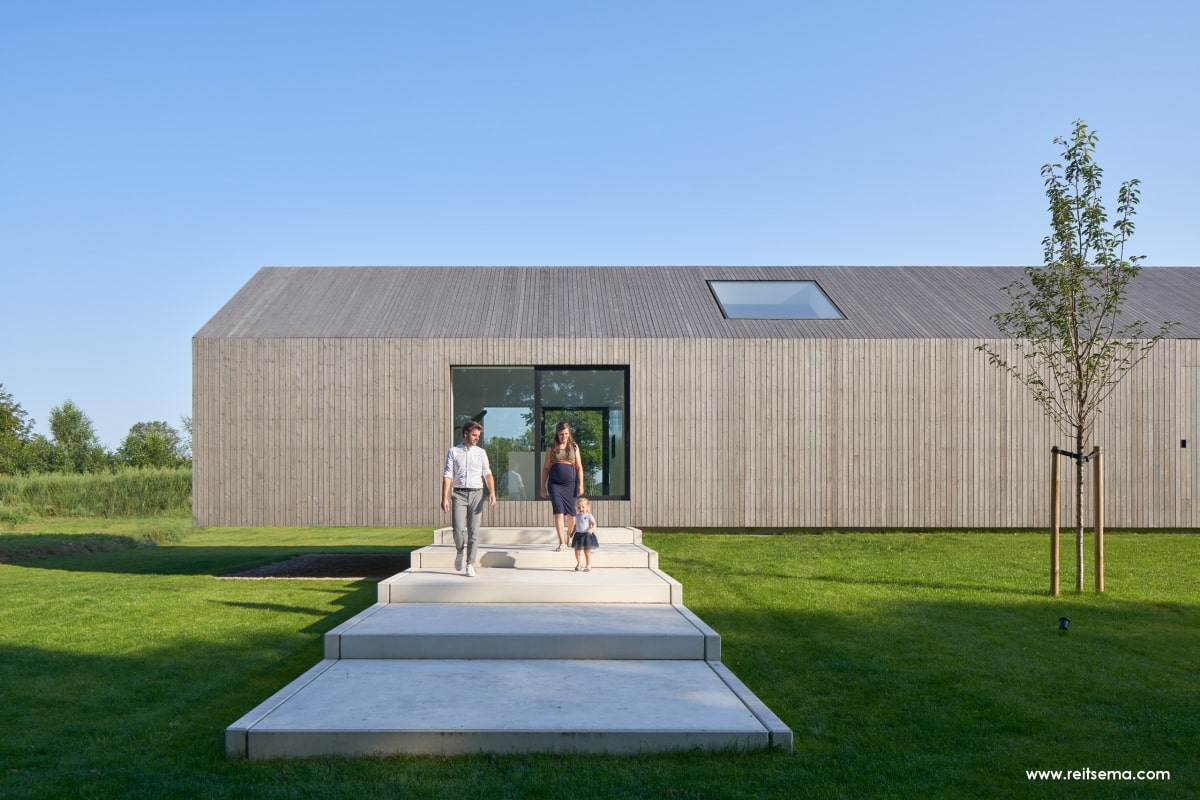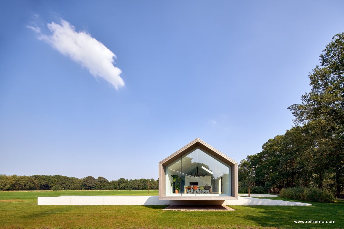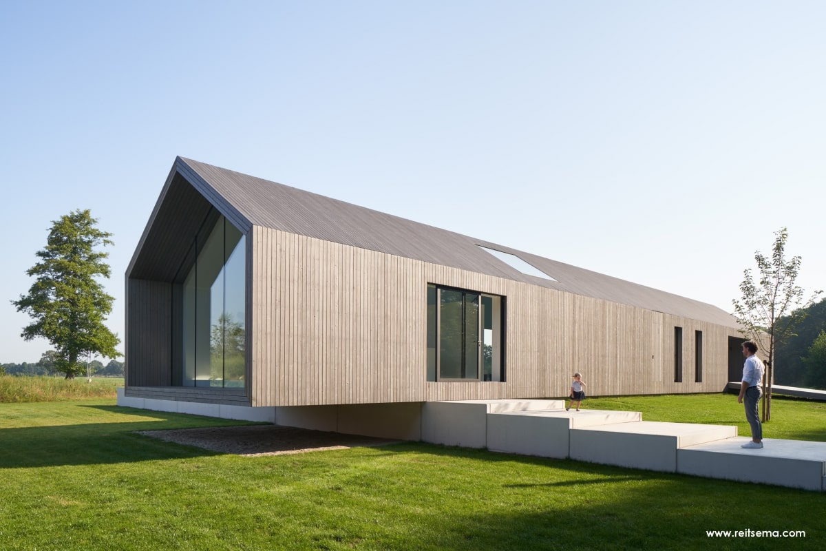 Koeien, konijnen, herten, eindeloze weilanden en bospartijen. Het zou volgens Weerink zonde zijn om de kracht van dit landschap niet te benutten. Hij droomde van een grote glazen schuifpui maar vroeg zich af of dit überhaupt mogelijk was. “Een schuifpui van 4,5 meter is een niet alledaagse maat,” vertelt Weerink. “Dit is een echt statement in de woning. De plek die buiten en binnen met een inpandig terras verbindt. Het leek een utopie maar gelukkig konden we hiervoor terecht bij Reynaers Aluminium. Zij konden een aluminium schuifpui leveren die ook qua grootte en esthetisch oogpunt aansloot bij onze wensen. De aansluiting van constructie, kozijn en dakgoot luistert nauw. Samen met de gevelbouwer OWK en hun enginering is het idee verder uitgewerkt. Ze hebben echt prachtwerk geleverd.”