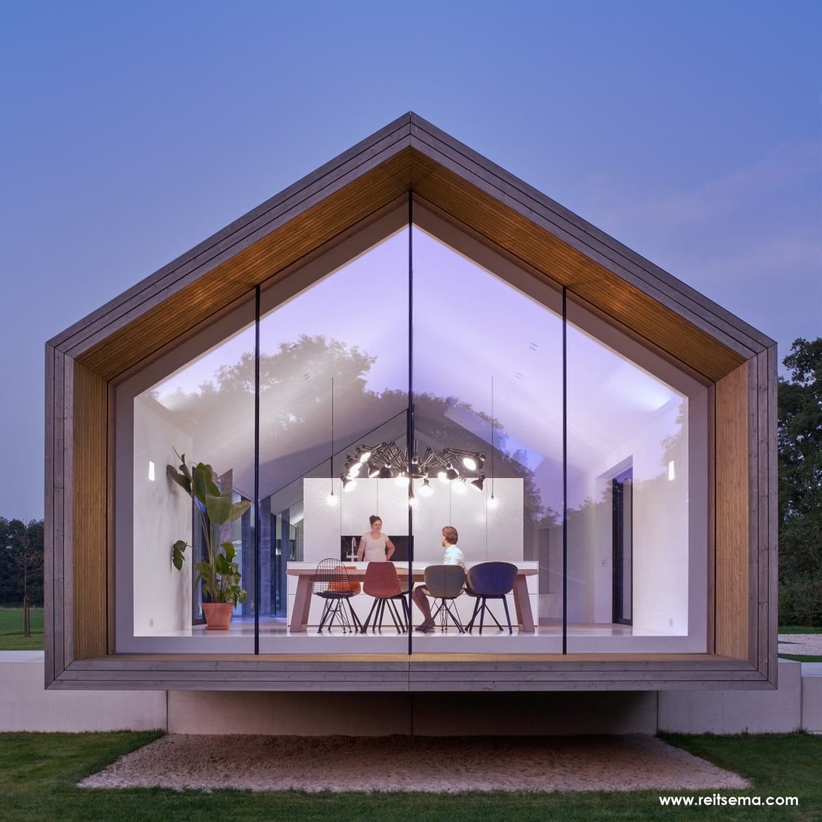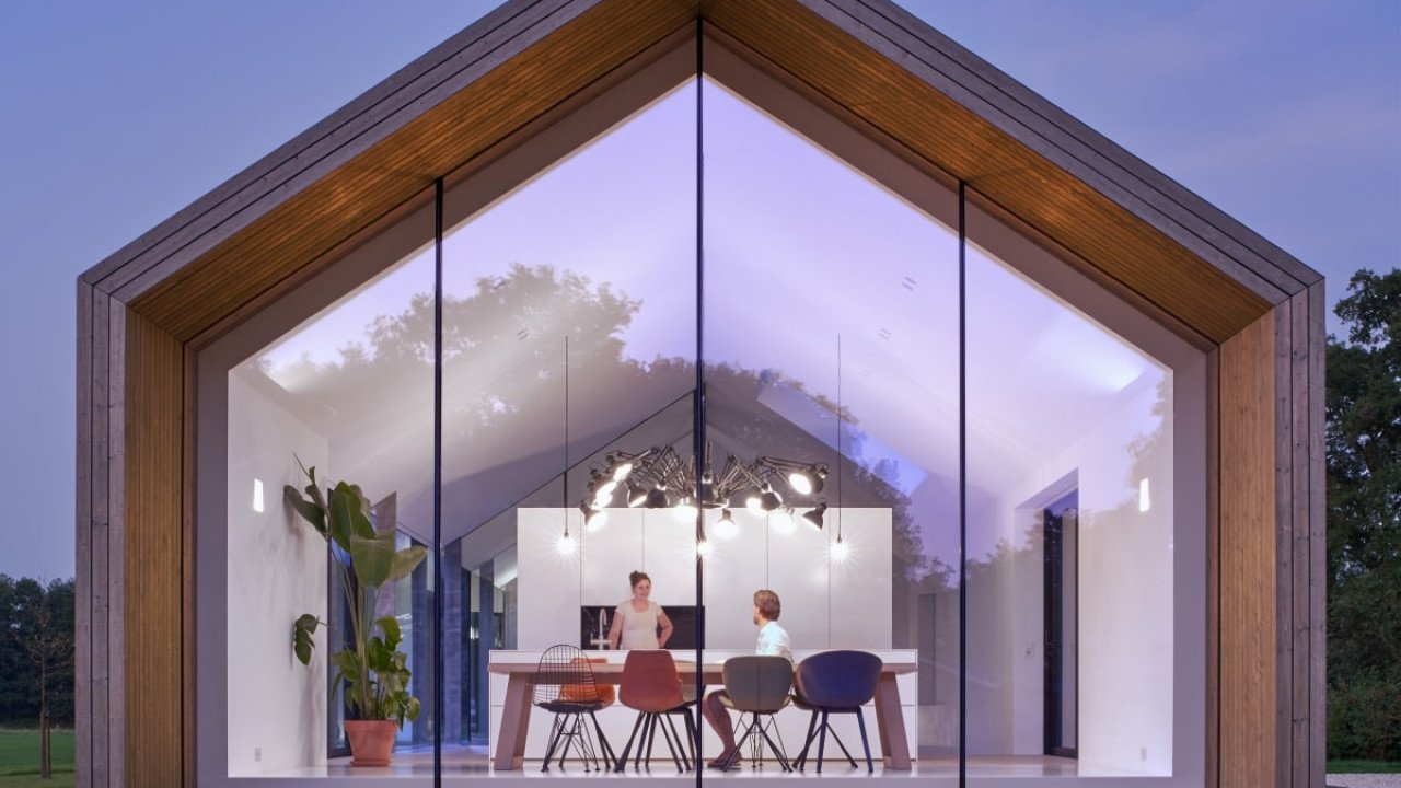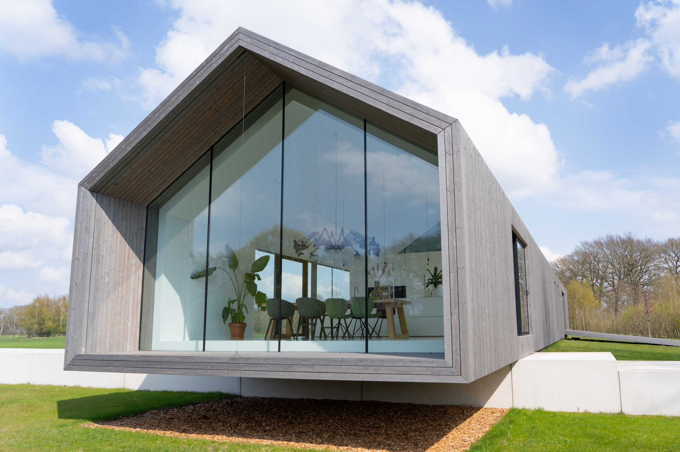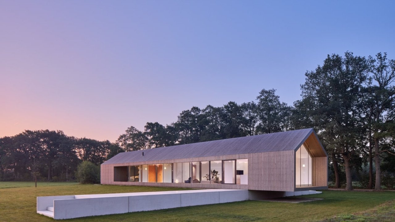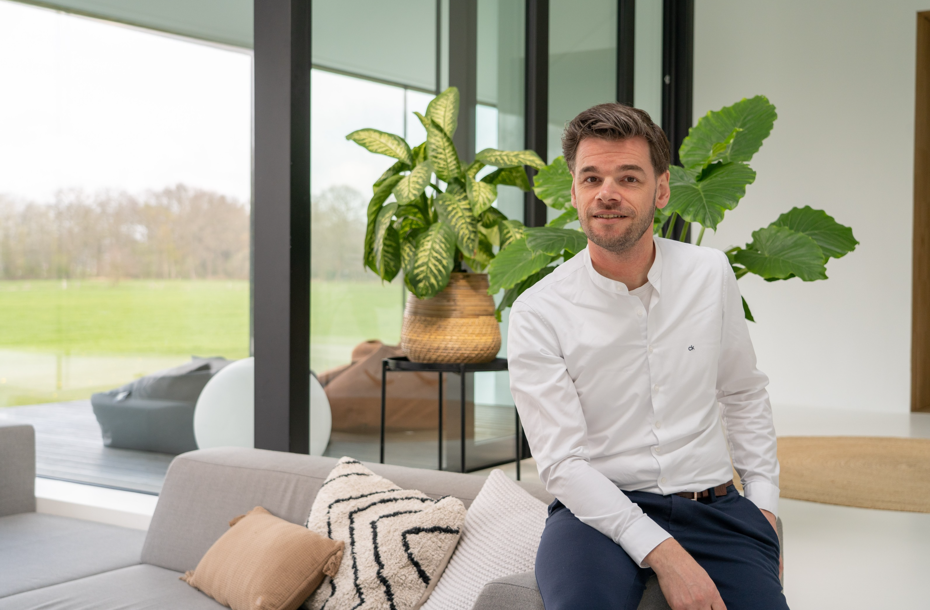 Koeien, konijnen, herten, eindeloze weilanden en bospartijen. Het zou volgens Weerink zonde zijn om de kracht van dit landschap niet te benutten. Hij droomde van een grote glazen schuifpui maar vroeg zich af of dit überhaupt mogelijk was. “Een schuifpui van 4,5 meter is een niet alledaagse maat,” vertelt Weerink. “Dit is een echt statement in de woning. De plek die buiten en binnen met een inpandig terras verbindt. Het leek een utopie maar gelukkig konden we hiervoor terecht bij Reynaers Aluminium. Zij konden een aluminium schuifpui leveren die ook qua grootte en esthetisch oogpunt aansloot bij onze wensen. De aansluiting van constructie, kozijn en dakgoot luistert nauw. Samen met de gevelbouwer OWK en hun enginering is het idee verder uitgewerkt. Ze hebben echt prachtwerk geleverd.”