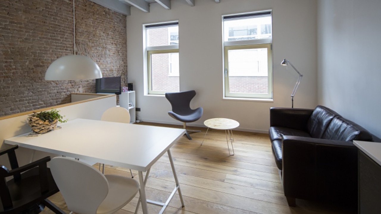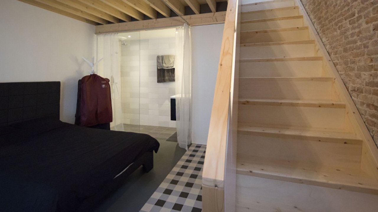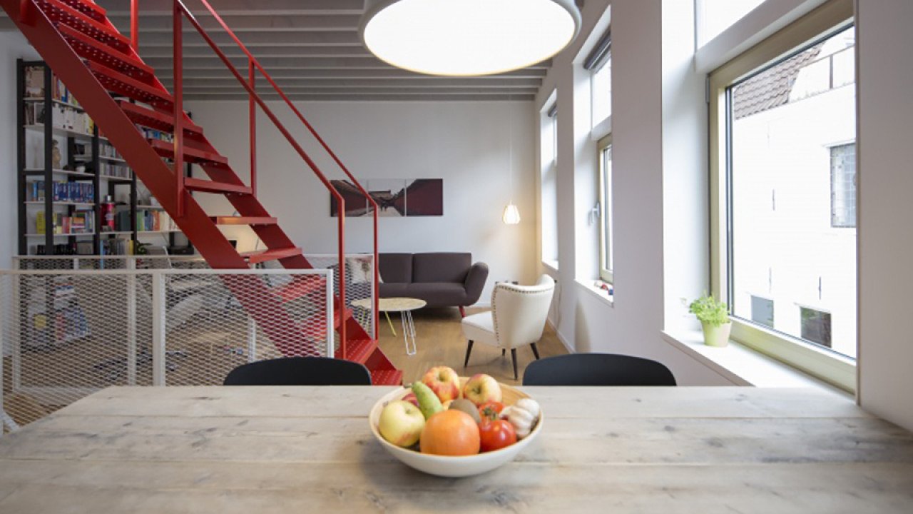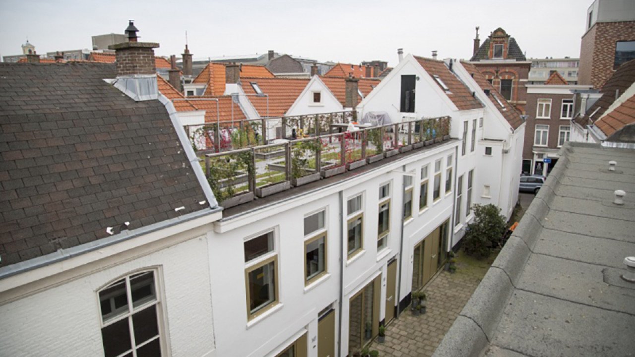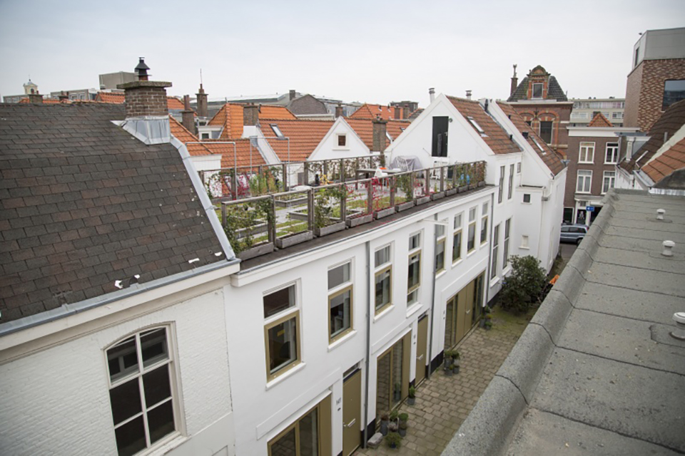 De rechterwoning is de grootste (80 m2) en hier woont Koenraadt zelf met zijn vrouw en zoon. Vanuit deze woning biedt een knalrode metalen trap toegang tot het riante dakterras met moestuin. Dit terras strekt zich uit boven de drie woningen en biedt zicht op oude daken in de omgeving. De andere twee woningen verhuurt de architect gemeubileerd aan expats. Die hebben dus geen buitenruimte.
