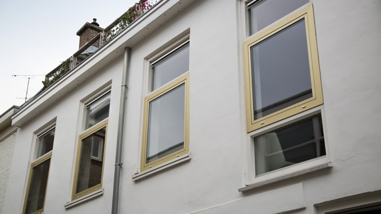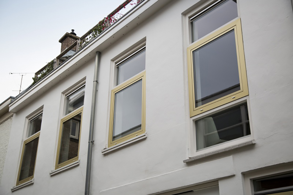Op de begane grond zijn puien met voordeuren en vaste verdiepingshoge ramen geplaatst, op de verdieping draaikiepramen. Koenraadt koos voor aluminium ramen. Het strakke aluminium contrasteert mooi met het ruwe pleisterwerk. “We gebruiken lichte en moderne materialen en technieken in de oude, ruwe stenen schil. De champagnetint van de aluminium kozijnen is warm en zacht, en past heel mooi bij de witte gevel”, oordeelt de architect. Gevelbouwer Schouten Kozijnen heeft de puien en ramen vakkundig geconstrueerd met de CS 68 profielen van Reynaers.
