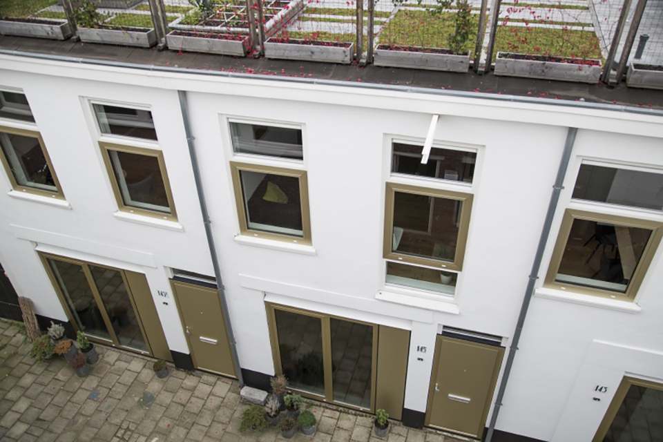Hiertoe is het complex tot op de gevel en woningscheidende muren gestript. Er zijn nieuwe vloeren, wanden, trappen en een nieuw dak aangebracht. Over de gevel zegt Koenraadt: “Zonder de gebouwstructuur te wijzigen, hebben we de gevel geordend. Met de nieuwe kozijnen hebben we horizontale lijnen aangebracht en woningindeling weer leesbaar gemaakt.”