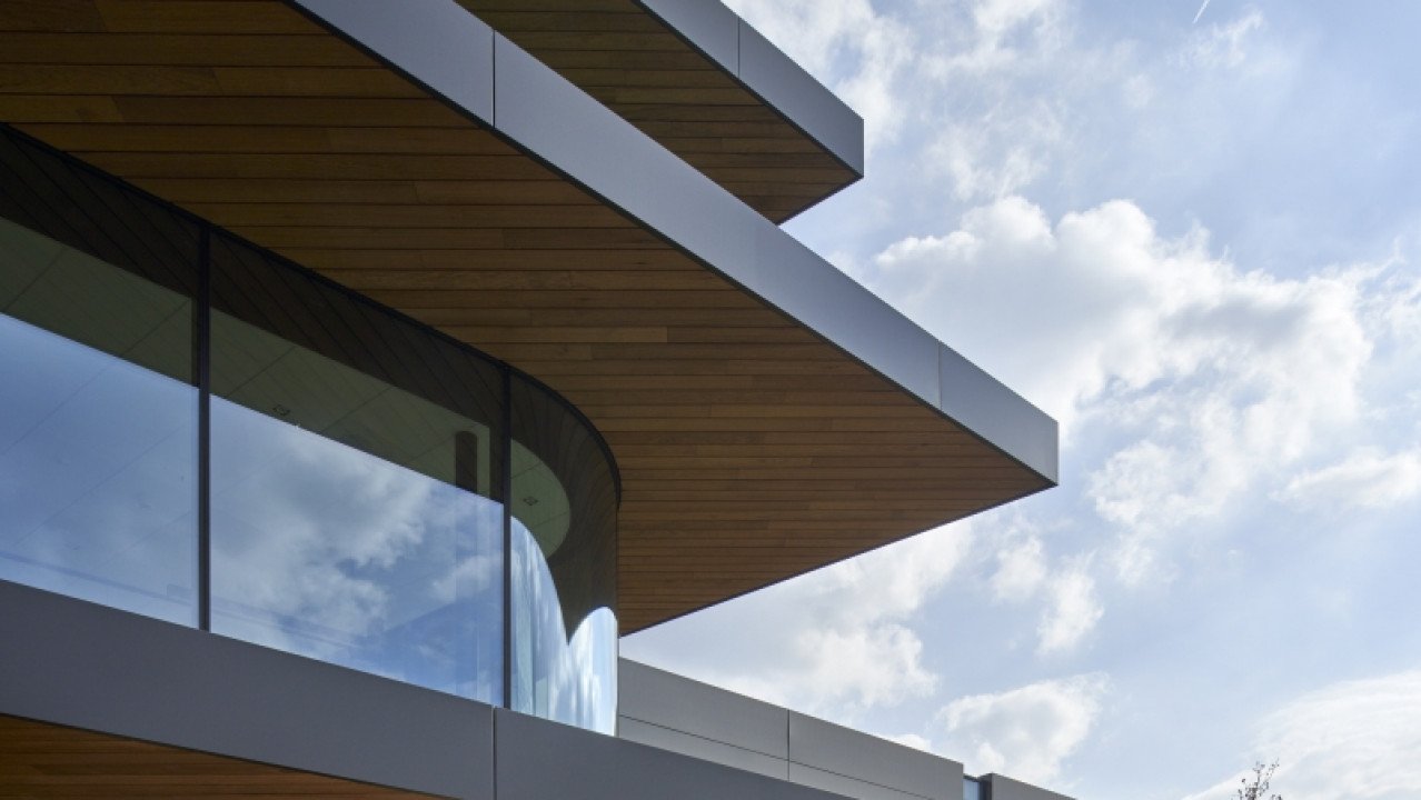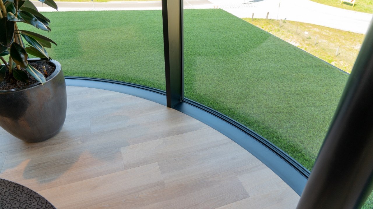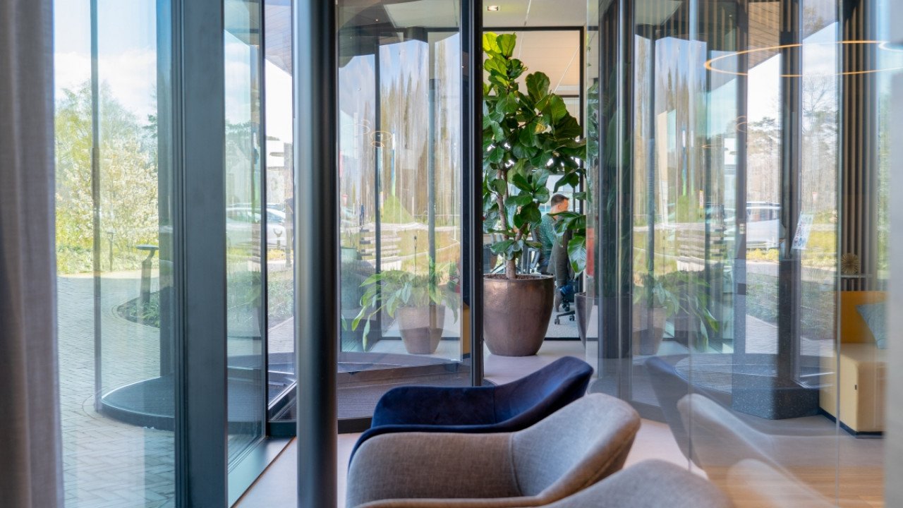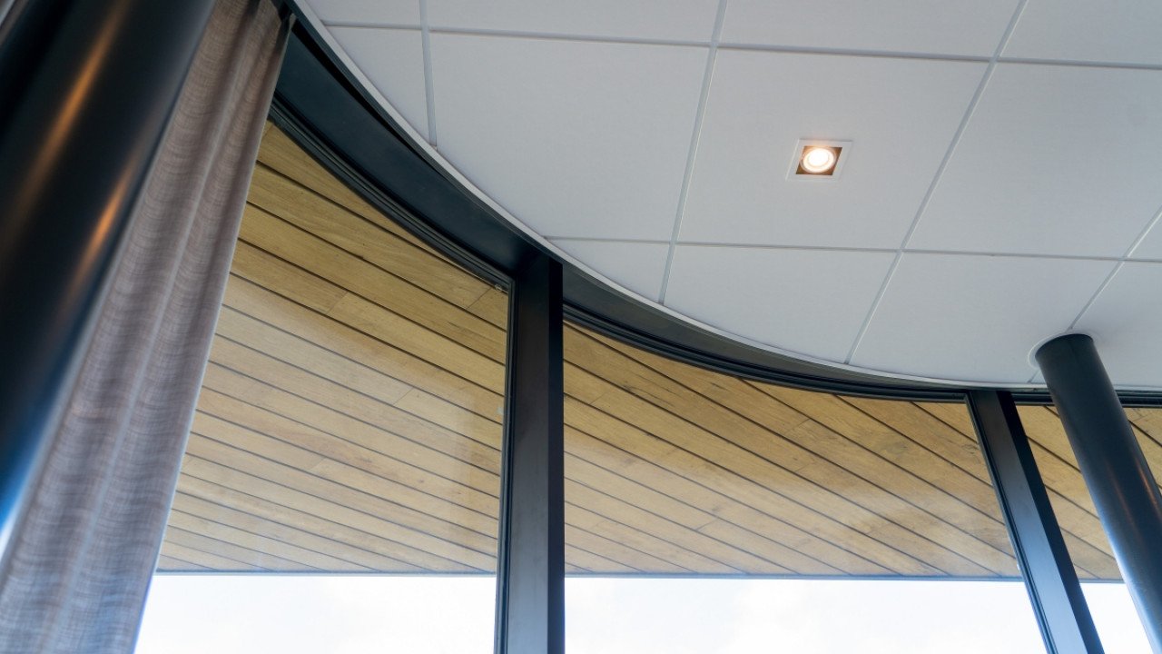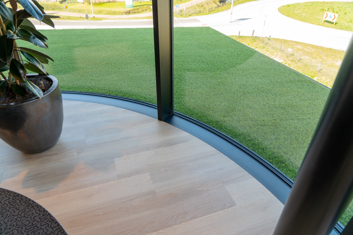 Het resulteerde in een volledige transparante gevel met aluminium kozijnen van Reynaers Aluminium, die tot in de kleinste details zijn doordacht. “De kozijnen zijn heel belangrijk geweest in dit project,” vertelt Verschuren. “Je maakt bijna geen gevel omdat de hoeveelheid glas zo groot is. Simpel gezegd zijn het in dit ontwerp een paar plaatjes die met ronde kolommen op elkaar zijn gestapeld. Het kozijn en het profiel zijn dan eigenlijk nog de enige dichte delen die je hebt. Daarnaast zijn de kenmerkende ronde ruiten enorm kostbaar. Door de introductie van een tussenstijl kon de ronding gegarandeerd mooi doorlopen. Er is veel ruggespraak geweest met gevelbouwer Aluberg en Reynaers Aluminium; die samenwerking is heel goed geweest.”