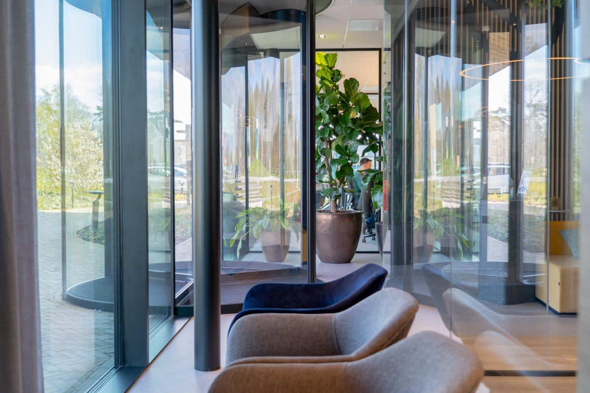 Bij de vertaling van de wensen, ambities en doelstellingen naar een ontwerp, stond het gevoel van gemeenschap centraal. Belangrijk hierbij was dat iedereen op dezelfde plek naar binnen gaat. Architect Peter Verschuren: “Het zijn losse bedrijven, maar ze vullen elkaar aan. Ze zijn complementair aan elkaar en dat wil je in het gebouw zo georganiseerd hebben. Dat is een heel belangrijk aspect geweest in het ontwerpproces.” Door de vorm van het gebouw en de meanderende paden in de tuin aan de voorzijde, lopen bezoekers automatisch naar de langste gevel. Met een tourniquet werd een extra accent aangebracht. “Zo’n element herken je als entree van een gebouw. Je loopt daar heel vloeiend en vanzelfsprekend naartoe,” legt Van de Rijdt uit. Eenmaal binnen functioneert de centrale zone als hart van het gebouw. “Het is geen atrium, maar een informele en gastvrije ruimte die de maat heeft om elkaar te ontmoeten in verschillende samenstellingen. Dat past precies bij de Van Dijk Groep en de personen die erachter zitten.”