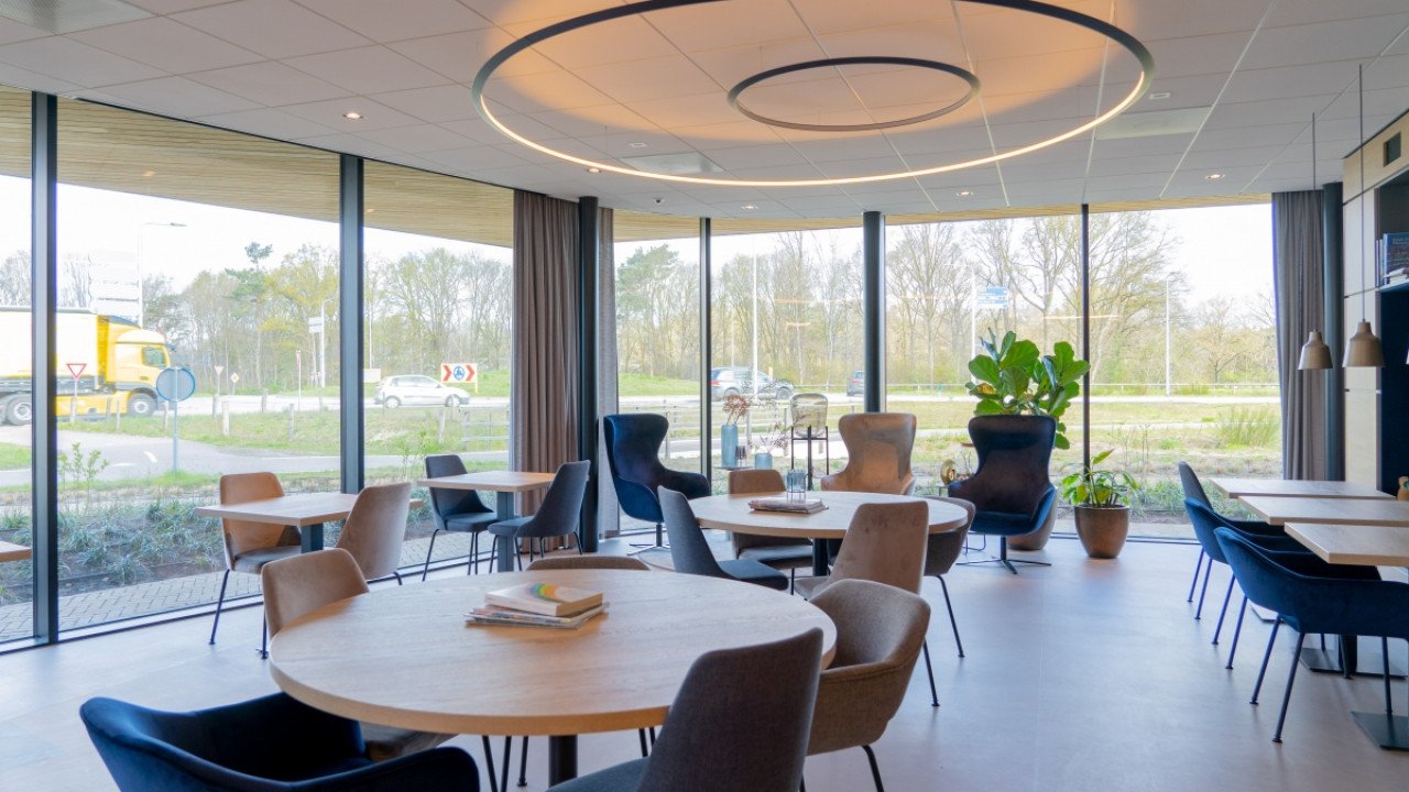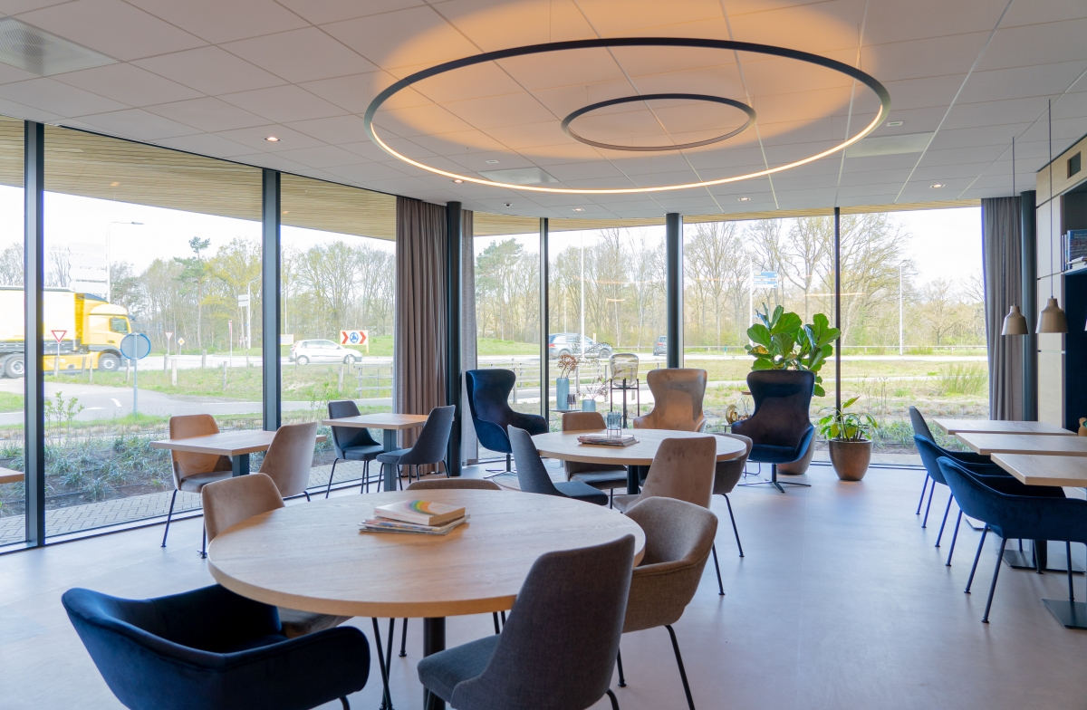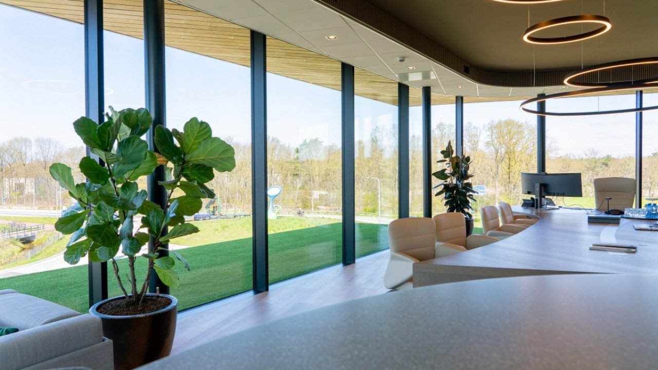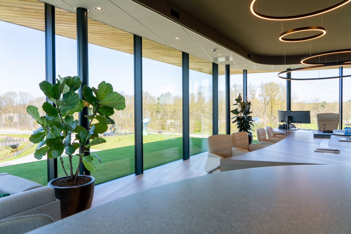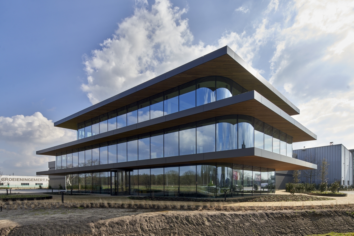 Wie langs de Gemertse Industrieweg rijdt, kan niet om het hoofdkantoor van de Van Dijk Groep heen. De gebolde beglazing op de hoekpunten doet eerder denken aan de rand van een ipad-scherm. Een grote welteverstaan, want het kantoorgedeelte beslaat 1000 m2. De transparante façade, die horizontaal gestapeld is, markeert de entree naar het achterliggende bedrijvenpark. Eenmaal binnen ervaren werknemers en bezoekers een panoramisch uitzicht op het omliggende groen. Ruimtegebrek, dat was de initiële vraag; een vraag die Denkkamer vaker krijgt van ondernemers die op een gegeven moment aan een groter pand toe zijn. “Wij scherpten die vraag aan door te onderzoeken ‘hoe wil je graag werken?’,” blikt architect Dennis van de Rijdt terug. “Als je naar een heel nieuwe omgeving gaat, kun je daarover nadenken. Dat leidde tot heel dynamische gesprekken.”