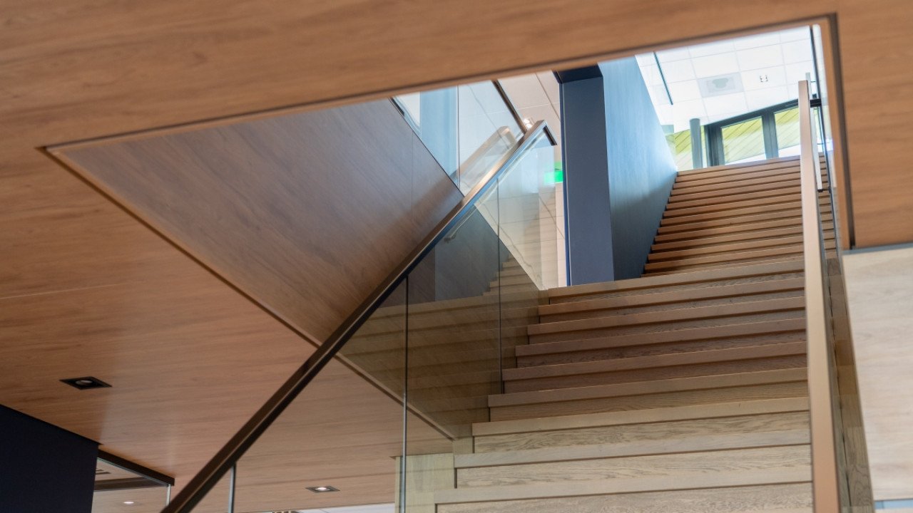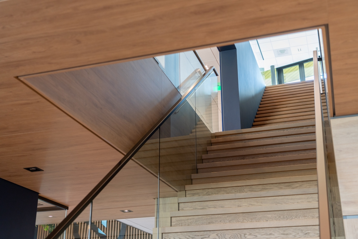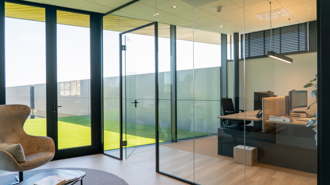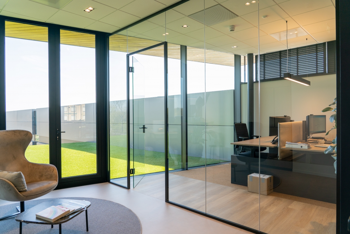 Wat het de opdracht nog unieker maakte, was dat Unibouw - onderdeel van de Van Dijk Groep - het pand zelf zou bouwen. Verschuren: “De gedachte van Unibouw was ‘wij willen laten zien wat wij kunnen. Daarom moeten we een heel goed gebouw neerzetten, zodat we ons bouwsysteem kunnen uitleggen’. Ons ontwerp lag behoorlijk buiten hun comfortzone.” Veel glas typeert de ontwerpen van Denkkamer. “In het begin gingen we vrij conservatief met de gevel om. Wel raamstroken over de gehele breedte, maar vanaf een meter hoogte, zoals Unibouw dat zelf vaak toepast. Wij zagen liever meer transparantie in die gevel. Deze locatie heeft een heel mooi groen zicht naar buiten; dat wilden we optimaal naar binnen halen. Met getint glas, waardoor je binnen niet het gevoel hebt dat je open en bloot zit. Veel daglicht en openheid maar toch afstand met buiten. De omgeving is als een decor in het interieur aanwezig.”