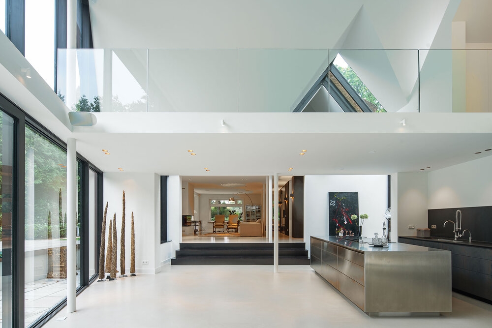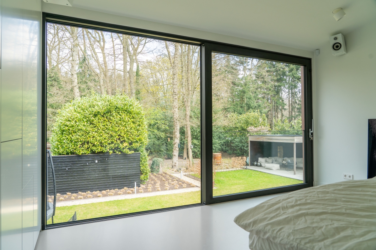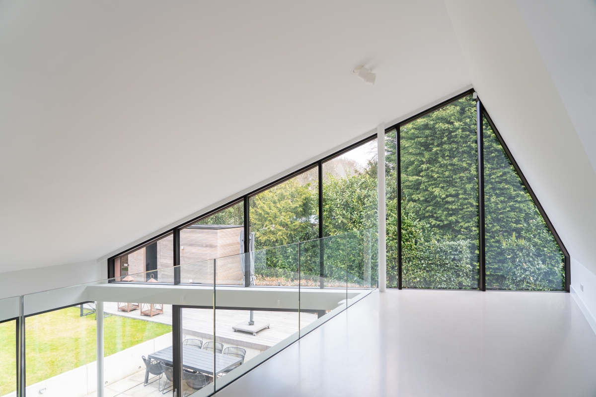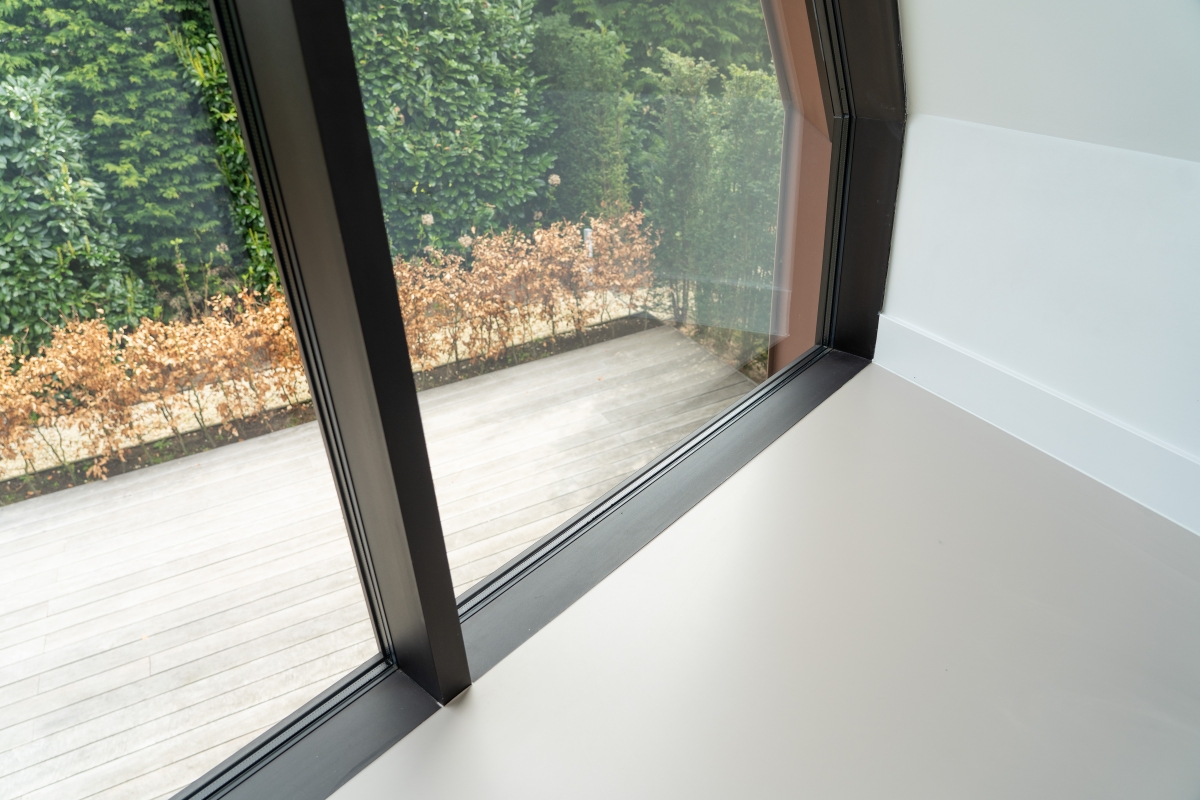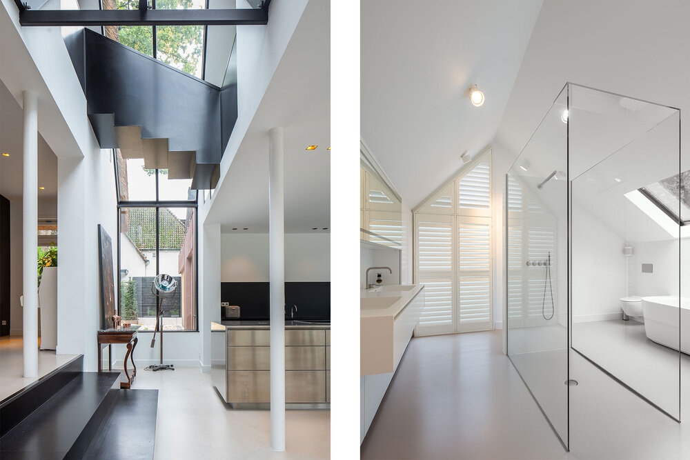 Als een sluis verbindt een glazen corridor de villa met de uitbouw. Beneden bevindt zich een ruime woonkeuken. Boven is een vide gesitueerd met slaap- en badkamer. Door de kleine ramen in de oudbouw was er weinig lichtinval. Hierdoor oogde de woning van binnen relatief klein. Van Leeuwen koos ervoor om de woning open te knippen voor een optimale verbinding naar de tuin toe. “Het plaatsen van grote, schuin afgesneden raampartijen met aluminium kozijnen aan de achtergevel was hét middel om een goede transparantie te verkrijgen. Met een ligging op het oosten heb je hier altijd optimaal ochtendlicht in alle vertrekken. De achtergevel bevat een grote glazen schuifpui op het rechte deel. In de glazen delen daarnaast zitten afwijkende hoeken. Dat zorgt voor complexe detaillering. Als architect weet je niet precies wat er technisch mogelijk is. Hier hebben Reynaers Aluminium en gevelbouwer Boeters Alubo ons goed geadviseerd. Wanneer je in de technische details duikt, is het wel fijn en leerzaam dat er een projectadviseur meekijkt. Alleen dan kun je samen echt iets moois maken.”