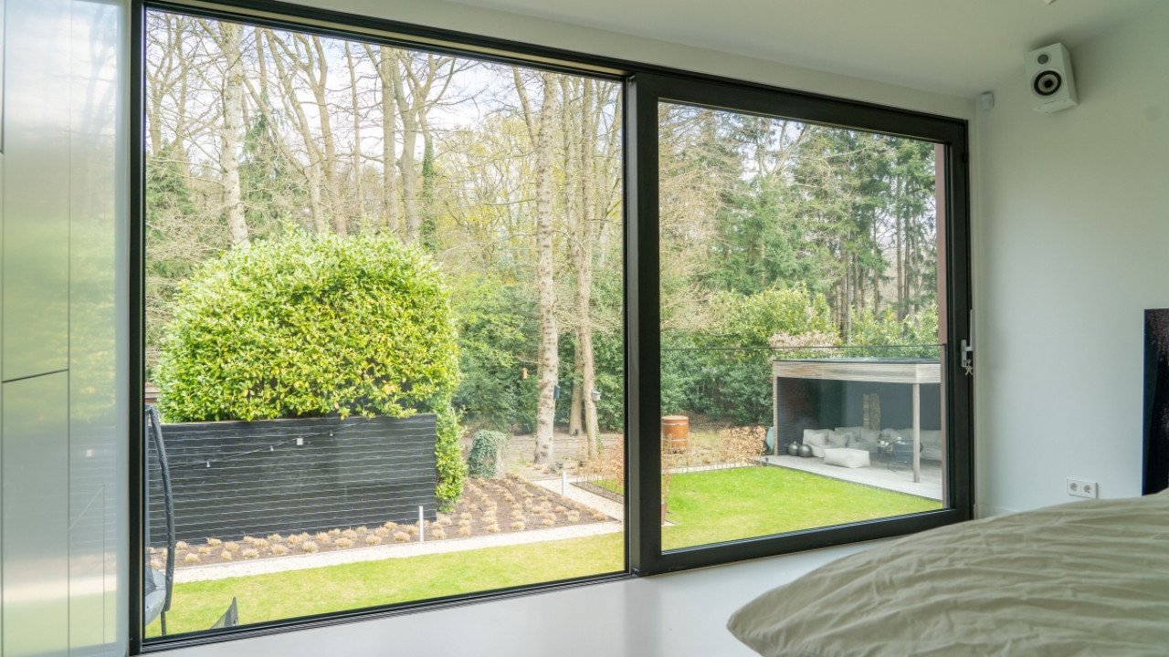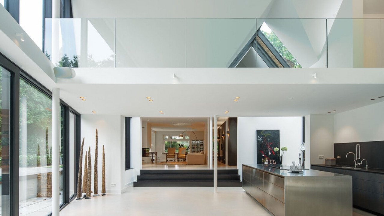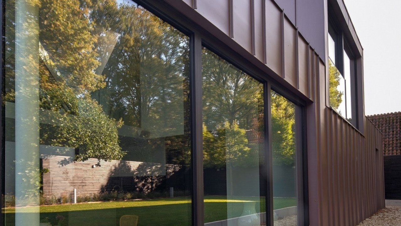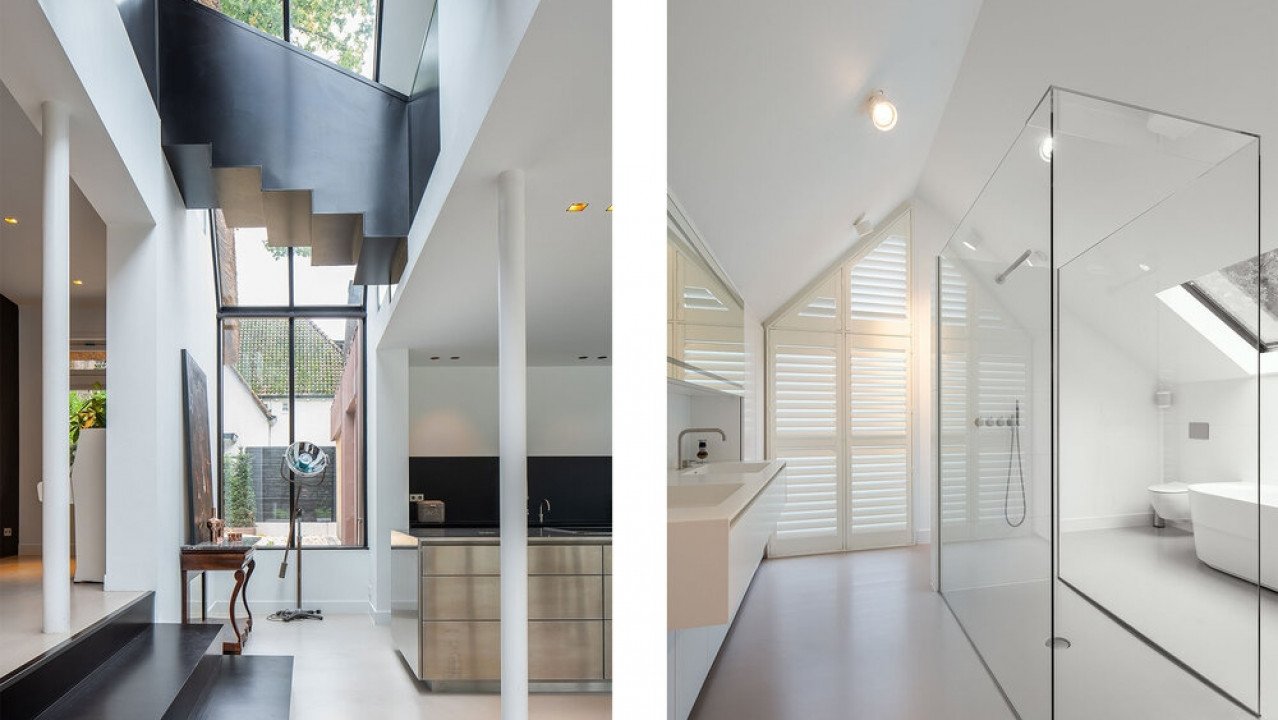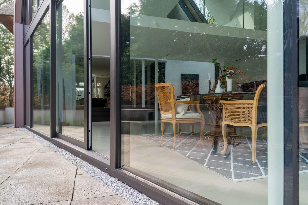 Als een sluis verbindt een glazen corridor de villa met de uitbouw. Beneden bevindt zich een ruime woonkeuken. Boven is een vide gesitueerd met slaap- en badkamer. Door de kleine ramen in de oudbouw was er weinig lichtinval. Hierdoor oogde de woning van binnen relatief klein. Van Leeuwen koos ervoor om de woning open te knippen voor een optimale verbinding naar de tuin toe. “Het plaatsen van grote, schuin afgesneden raampartijen met aluminium kozijnen aan de achtergevel was hét middel om een goede transparantie te verkrijgen. Met een ligging op het oosten heb je hier altijd optimaal ochtendlicht in alle vertrekken. De achtergevel bevat een grote glazen schuifpui op het rechte deel. In de glazen delen daarnaast zitten afwijkende hoeken. Dat zorgt voor complexe detaillering. Als architect weet je niet precies wat er technisch mogelijk is. Hier hebben Reynaers Aluminium en gevelbouwer Boeters Alubo ons goed geadviseerd. Wanneer je in de technische details duikt, is het wel fijn en leerzaam dat er een projectadviseur meekijkt. Alleen dan kun je samen echt iets moois maken.”