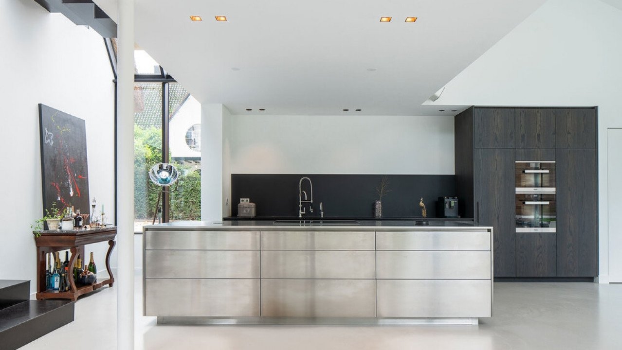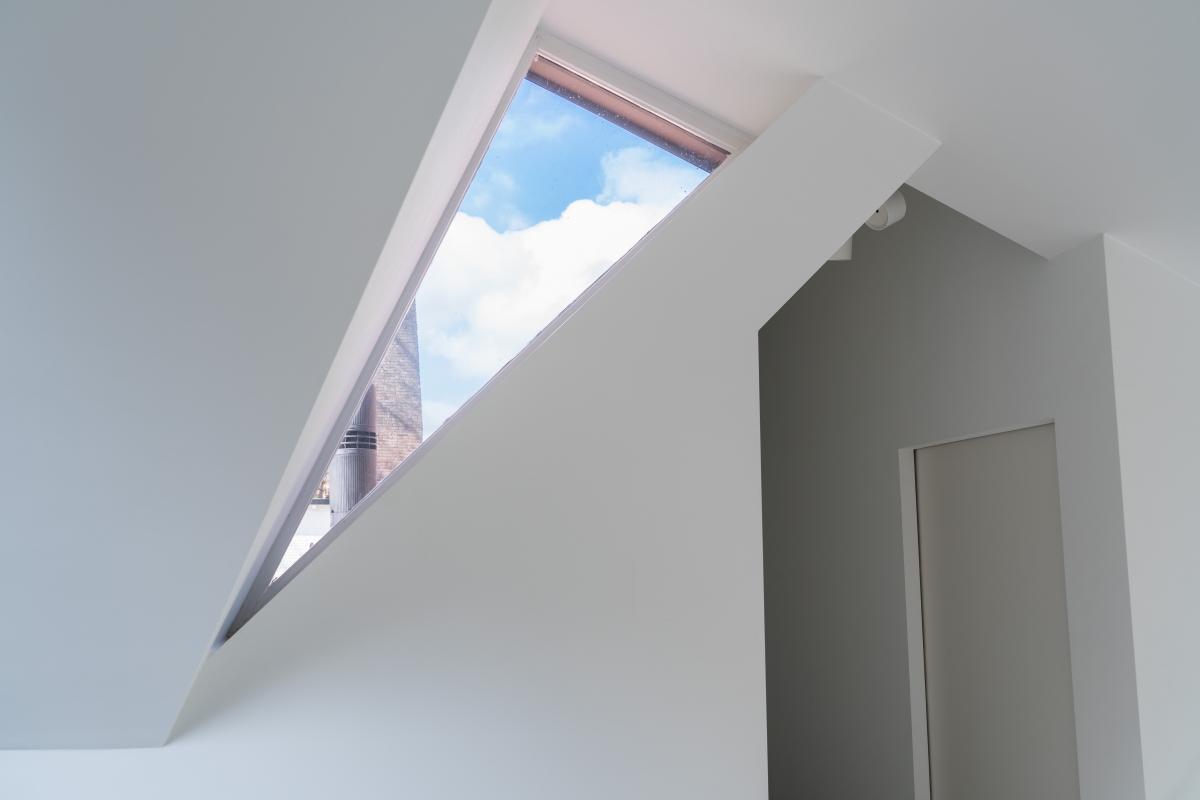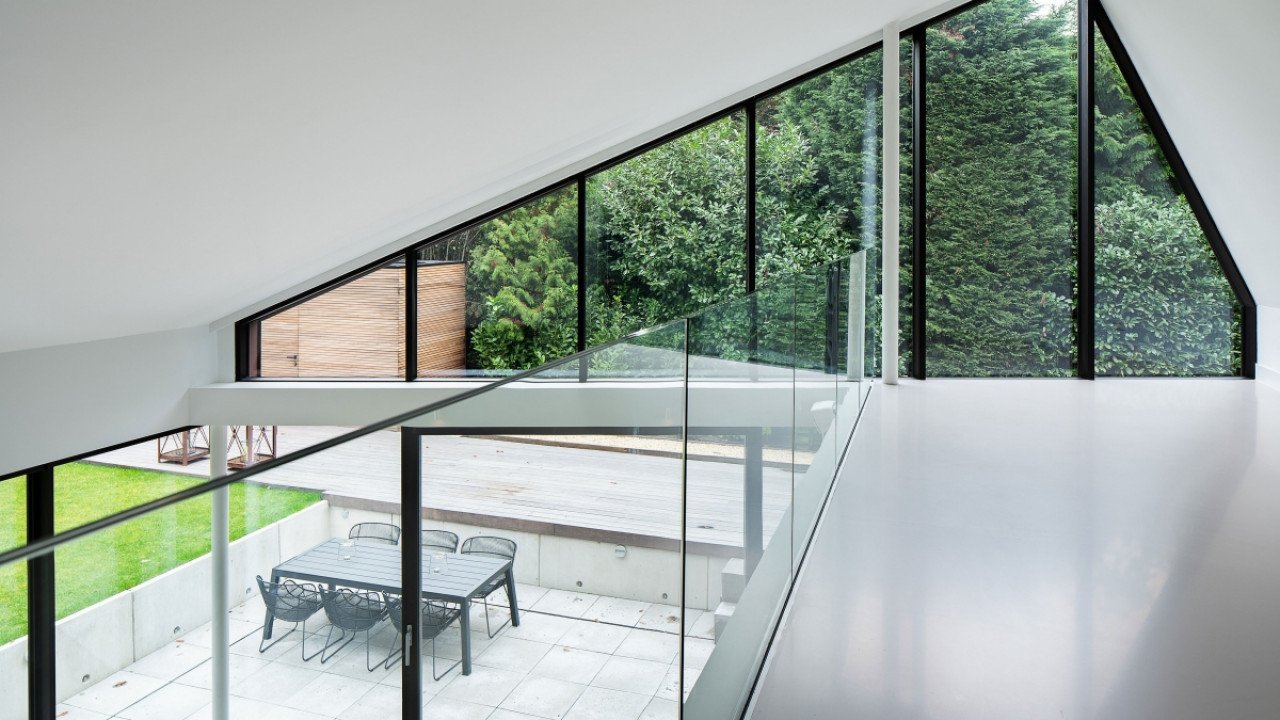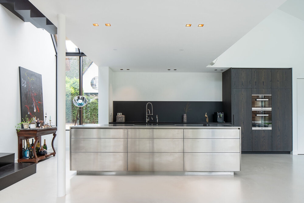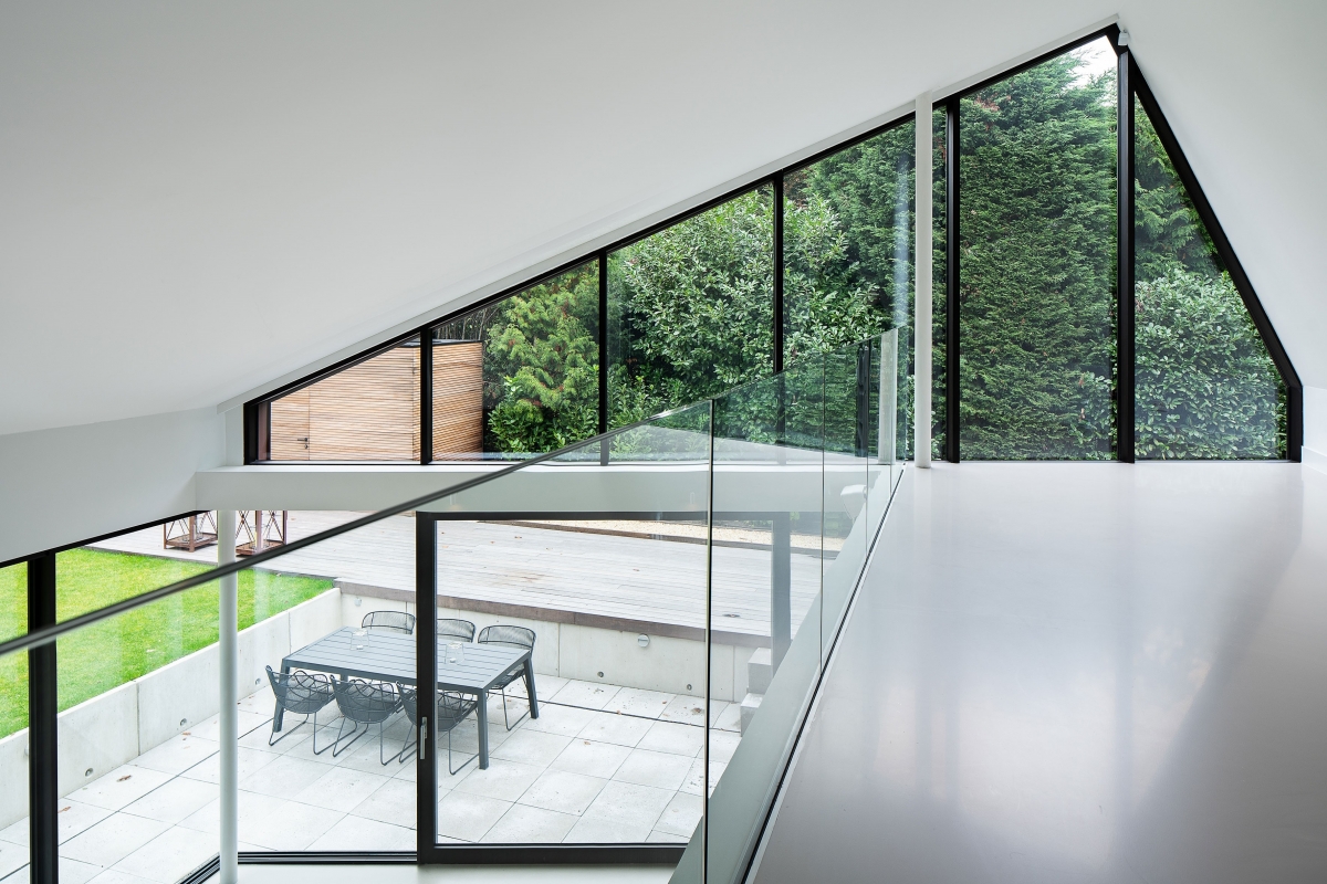 Als een sluis verbindt een glazen corridor de villa met de uitbouw. Beneden bevindt zich een ruime woonkeuken. Boven is een vide gesitueerd met slaap- en badkamer. Door de kleine ramen in de oudbouw was er weinig lichtinval. Hierdoor oogde de woning van binnen relatief klein. Van Leeuwen koos ervoor om de woning open te knippen voor een optimale verbinding naar de tuin toe. “Het plaatsen van grote, schuin afgesneden raampartijen met aluminium kozijnen aan de achtergevel was hét middel om een goede transparantie te verkrijgen. Met een ligging op het oosten heb je hier altijd optimaal ochtendlicht in alle vertrekken. De achtergevel bevat een grote glazen schuifpui op het rechte deel. In de glazen delen daarnaast zitten afwijkende hoeken. Dat zorgt voor complexe detaillering. Als architect weet je niet precies wat er technisch mogelijk is. Hier hebben Reynaers Aluminium en gevelbouwer Boeters Alubo ons goed geadviseerd. Wanneer je in de technische details duikt, is het wel fijn en leerzaam dat er een projectadviseur meekijkt. Alleen dan kun je samen echt iets moois maken.”