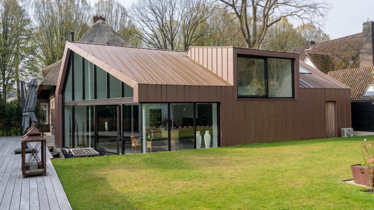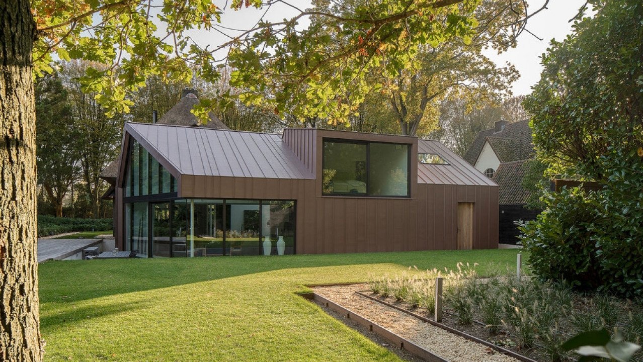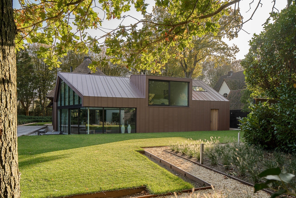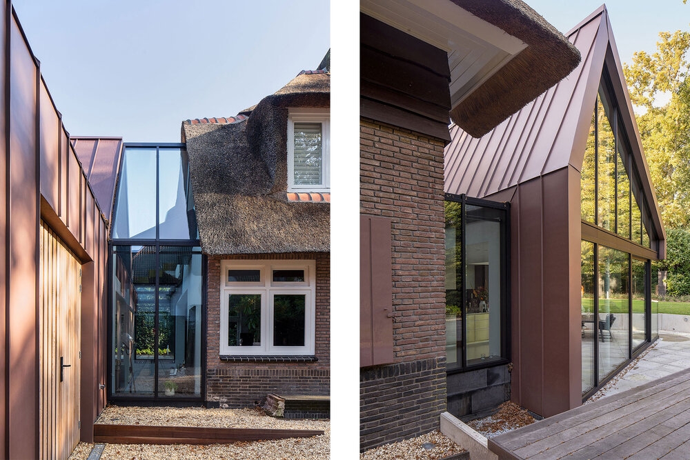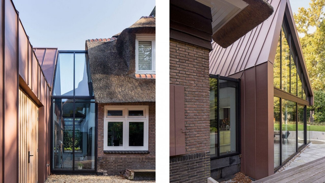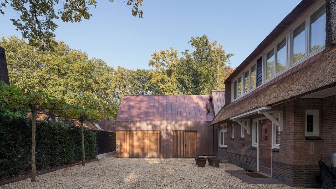 In villadorp Laren vormt één woning een vreemde eend in de bijt. Architect Rodger van Leeuwen van Studio Maak maakte van een klassieke jaren 30-villa een eclectische bouwwerk. Het originele rietdak vormt een contrast met de minimalistische zinken bekleding en glazen uitbouw.