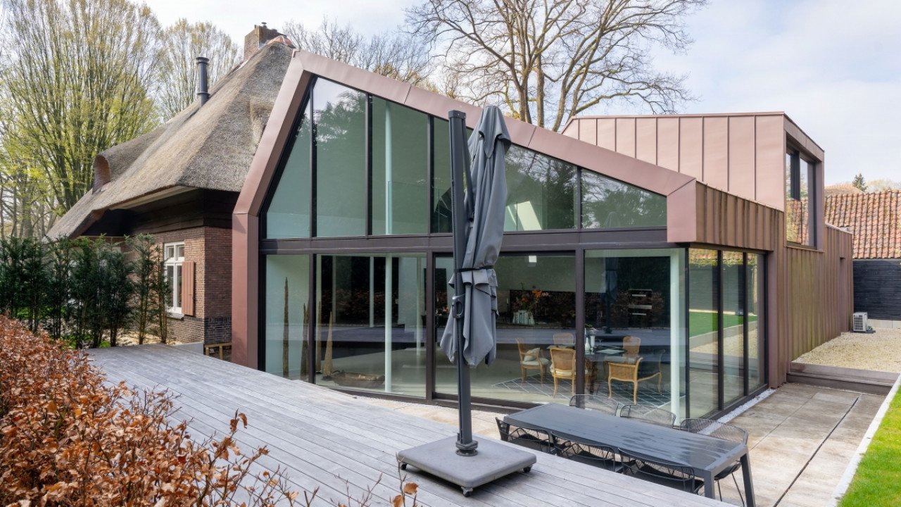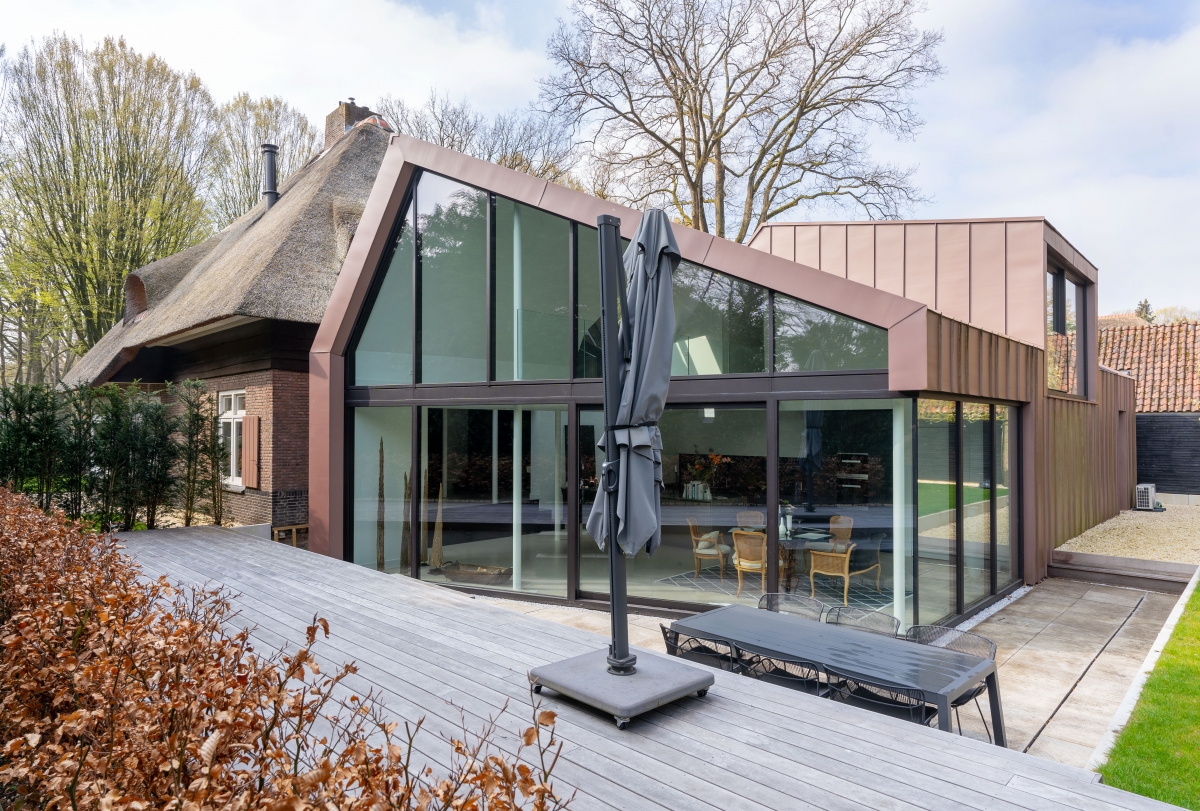Van Leeuwen stond voor een pittige klus. De uitbouw verzorgen van een traditionele villa met rieten kap. Hoe voeg je iets toe dat afwijkt maar tegelijkertijd respectvol is naar het bestaande huis? Dat was de vraag die als een rode draad door het programma liep. De oplossing: Het nieuwe volume optisch los te houden, lager te plaatsen en simpel en onderscheidend ten opzichte van het originele huis te detailleren. Van Leeuwen kwam met deze inventieve oplossing. “Alles wat je aan zo’n karakteristieke woning zet, is vreemd. We wilden alle materialen in harmonie laten zijn met elkaar en het originele bouw daardoor in zijn waarde laten. De nieuwe en bestaande materialen voegen zich heel mooi samen. Mede door de minimalistisch detaillering blijft de uitbreiding ondergeschikt.”
