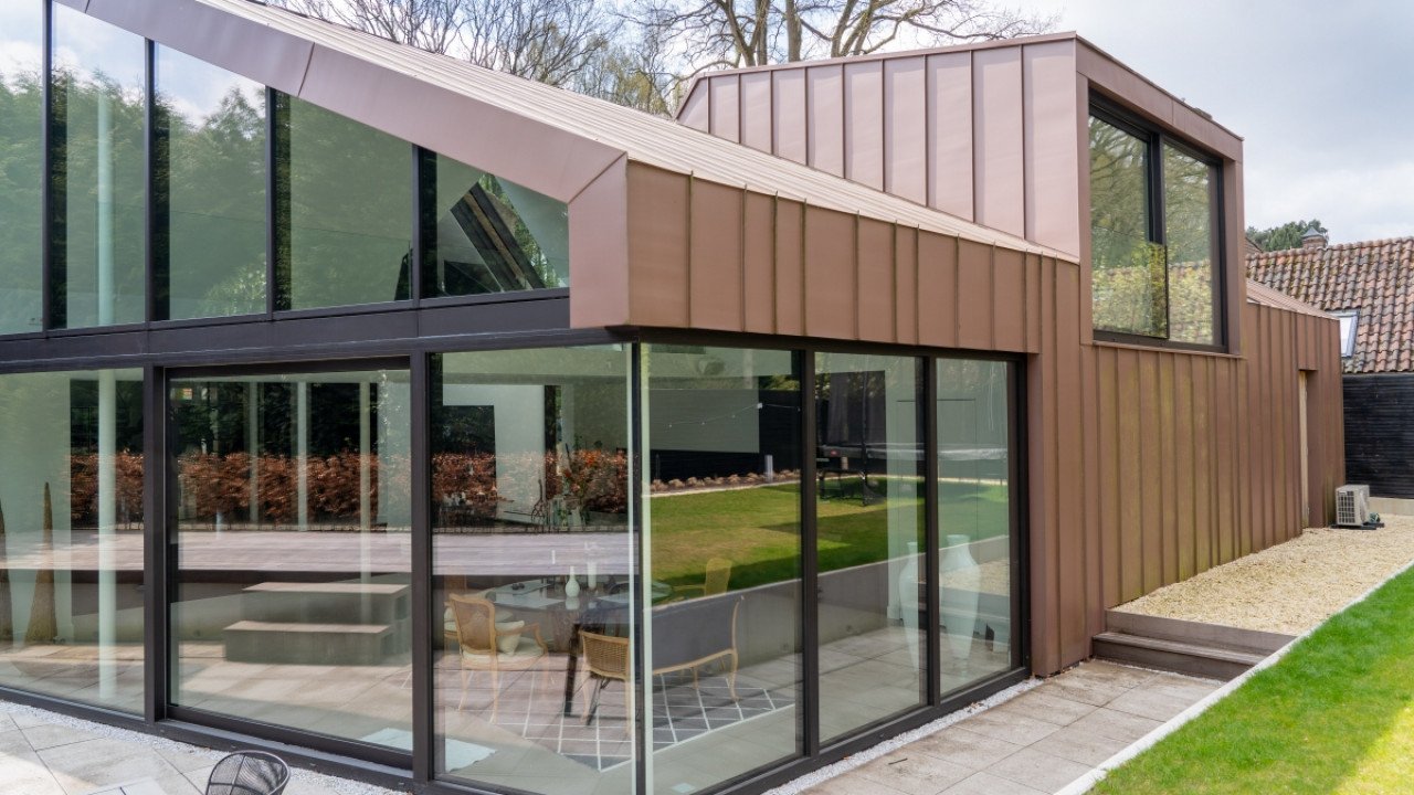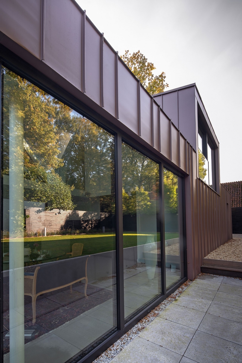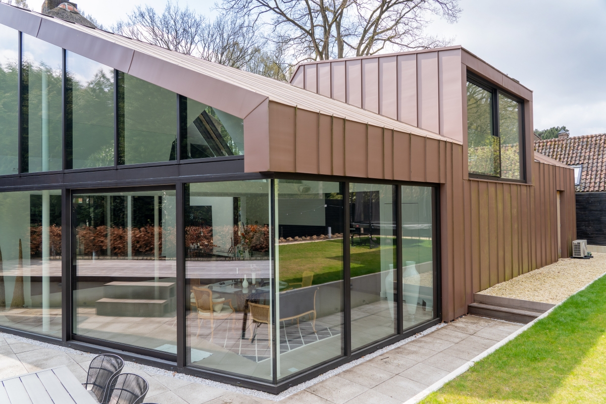 Een woondeel maken dat afwijkt maar tegelijkertijd aansluit bij de originele bouw. Een contradictie die vroeg om een radicale knip. Volgens Van Leeuwen was deze stap niet mogelijk geweest zonder het vertrouwen van de bewoners. “Zonder een goede opdrachtgever, kun je nooit een mooi project maken. Het is als architect jouw taak om hen mee te nemen in je verhaal. Er was een nadrukkelijke wens dat de nieuwbouw moest aansluiten bij de originele villa. Het ontwerp is eigentijds en sterk afwijkend van de originele vorm. Dat kostte dus wat overtuigingskracht. Met de materialisatie van de zinken bekleding, het hout en de aluminium kozijnen is juist die harmonie bereikt. Uiteindelijk schonken de bewoners ons al het vertrouwen. Ze wonen hier nu met heel veel plezier. Dan is mijn doel als architect bereikt.”