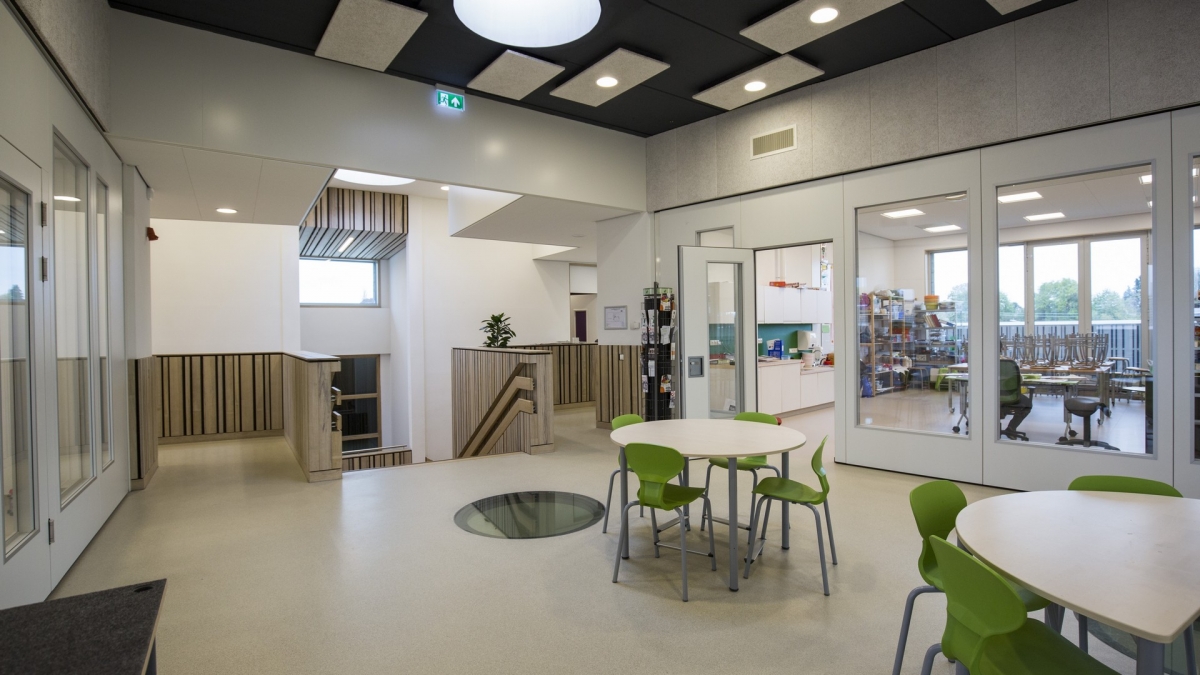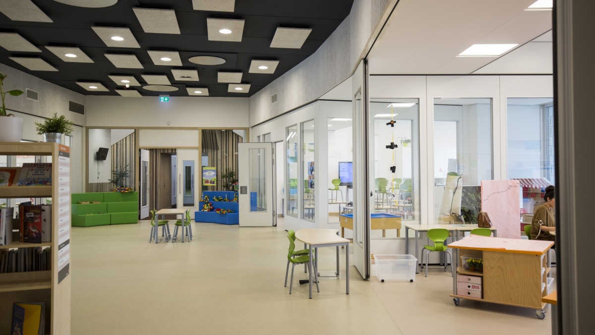 Spelenderwijs leren staat ook binnen centraal. Op beide verdiepingen staan vier lokalen als losse volumes via vouwwanden in open verbinding met een centrale ruimte. Wanneer de vouwwanden volledig geopend zijn, lopen de lesruimtes ook fysiek vloeiend in elkaar over.