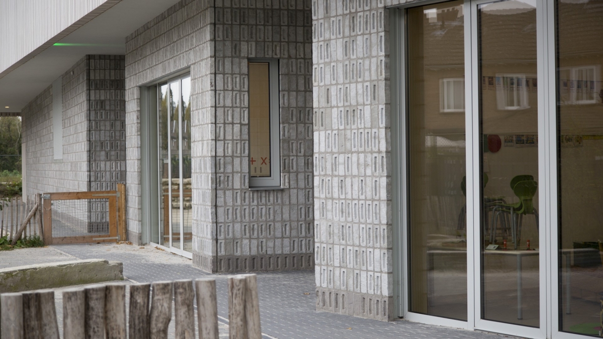 De gevels zijn bekleed met gecementeerde handvorm bakstenen in lichte grijsnuances. De stenen zijn in stapelverband gemetseld met staande strekken, waarbij een deel van de stenen op klamp staan. “Dit patroon verwijst naar nullen en enen in binaire codes en daarmee naar het digitale onderwijs. Naast de entree van de school staat in binaire code de naam van het IKC, maar dat is alleen voor nerds leesbaar. Maar ook wanneer je dit niet weet, verrijkt het reliëf in het metselwerk de gebouwschil”, verklaart architect Terzibasiyan.