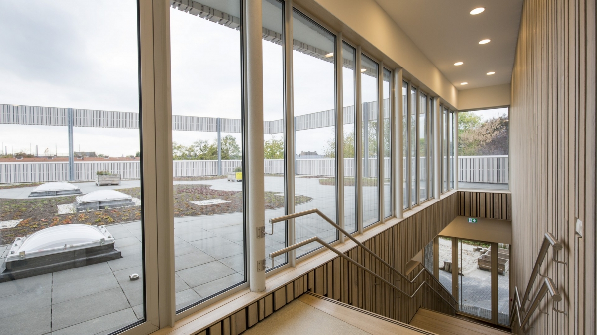 Grote glaspuien van Reynaers Aluminium, alle gemonteerd door P. van Hoesel, laten de buitenruimte visueel het gebouw inkomen. “Ik heb de vensters weggewerkt achter de gevelbekleding, zodat de openingen in de gevel maximaal doorzicht bieden.” Elk lokaal heeft openslaande deuren naar een buitenruimte. Op twee plekken is een lage pui (ca 1 meter hoog) toegepast: op de zuidhoek van de peuterspeelzaal, waar het zicht naar buiten vanuit de ooghoogte van de peuters prima is, maar wel de zon wordt geweerd. En in de gang naar de kleedkamers en de gymzaal, daar zijn van buitenaf alleen benen te zien van de mensen die er lopen.