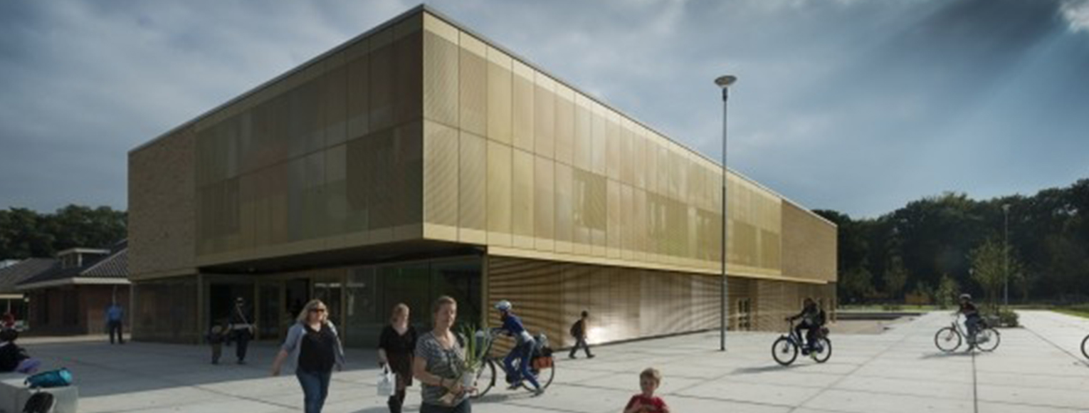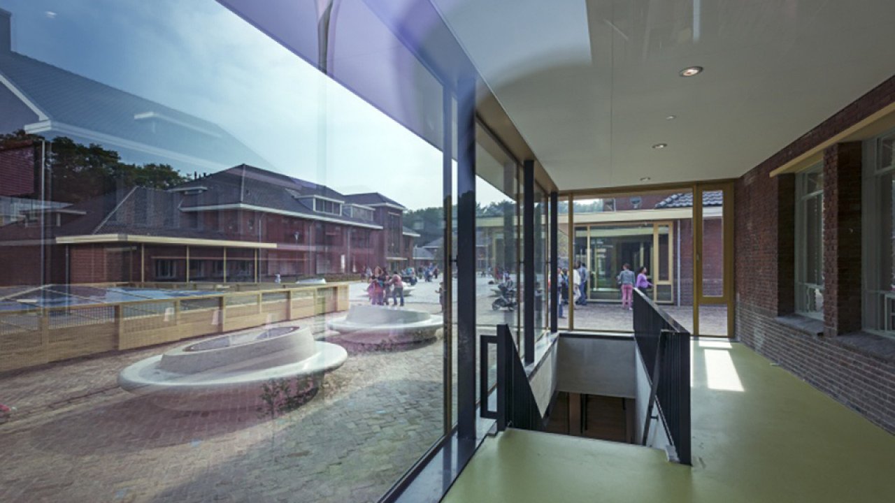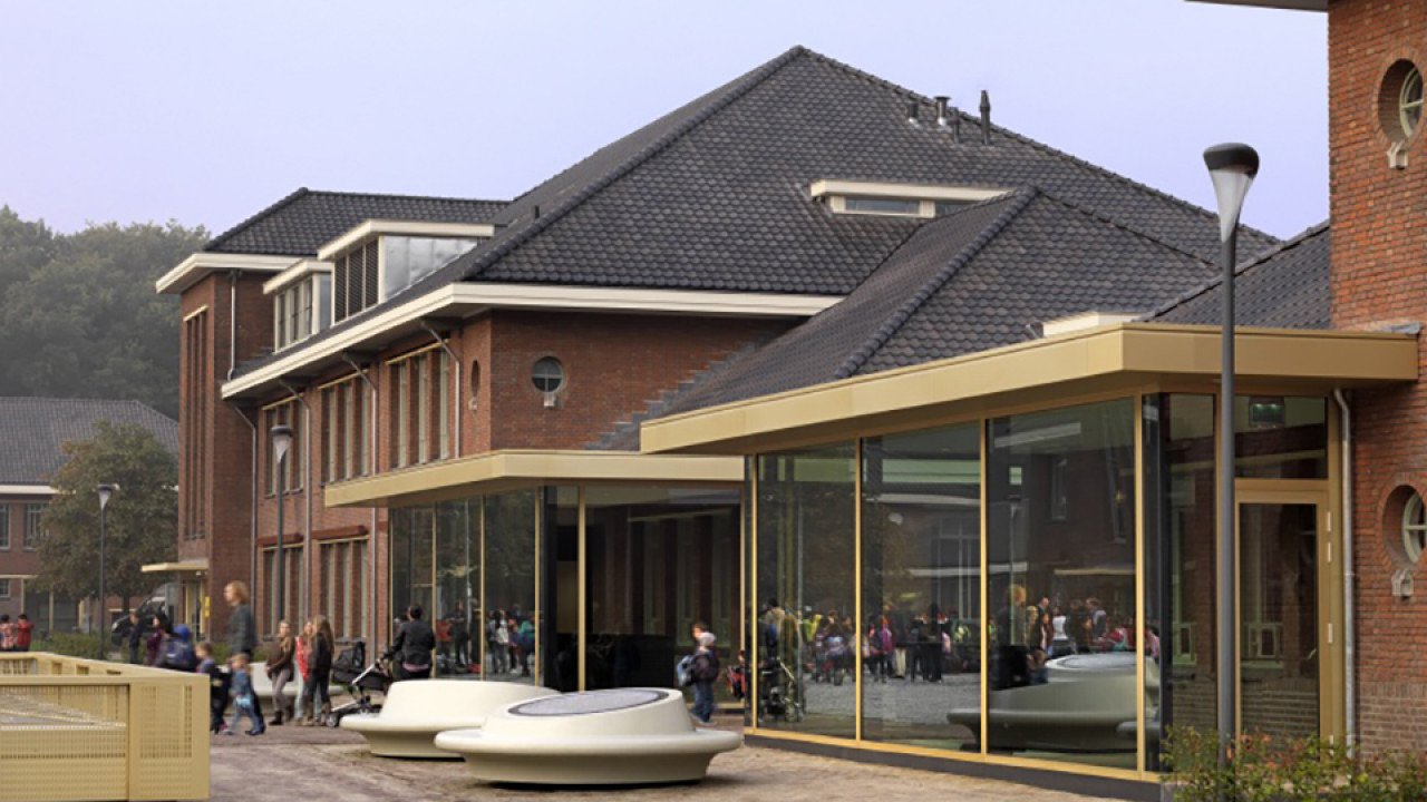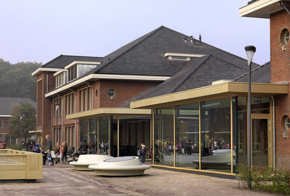Goudkleurige, aluminium accenten vormen tegelijkertijd de verbindende factor als het contrast tussen de bestaande gebouwen en de nieuwbouw van dit scholencomplex. Vijf gebouwen vormden de rijksmonumentale context waarbinnen een nieuw programma voor de school moest worden gepast. Een deel van dat programma kreeg plaats in een souterrain en een nieuw entreegebouw.