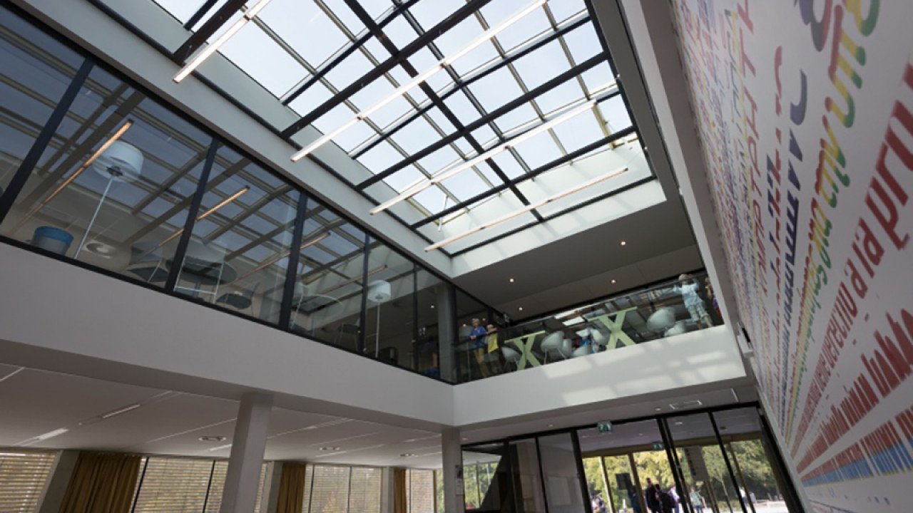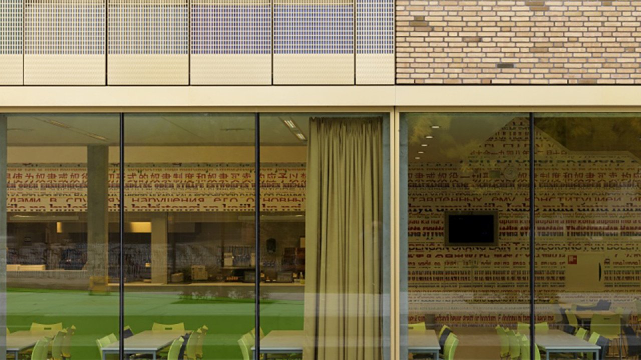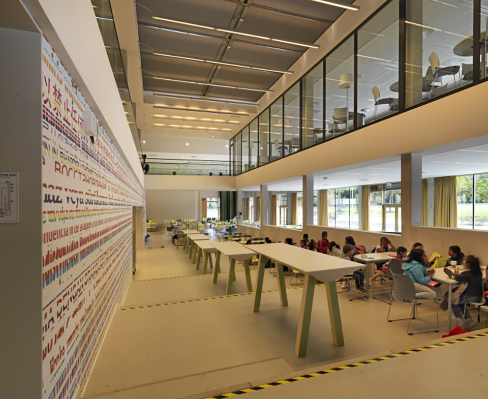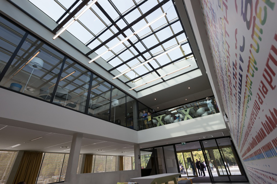 Goudkleurige, aluminium accenten vormen tegelijkertijd de verbindende factor als het contrast tussen de bestaande gebouwen en de nieuwbouw van dit scholencomplex. Vijf gebouwen vormden de rijksmonumentale context waarbinnen een nieuw programma voor de school moest worden gepast. Een deel van dat programma kreeg plaats in een souterrain en een nieuw entreegebouw.