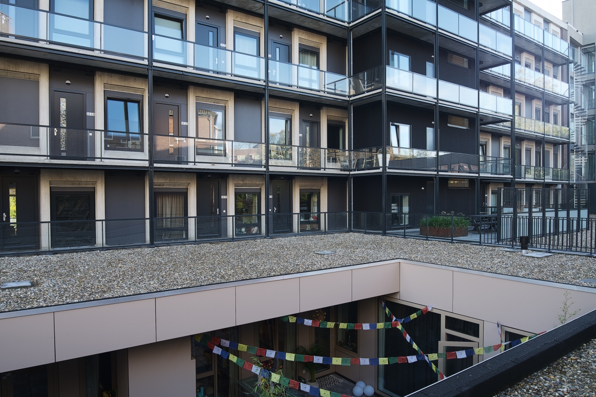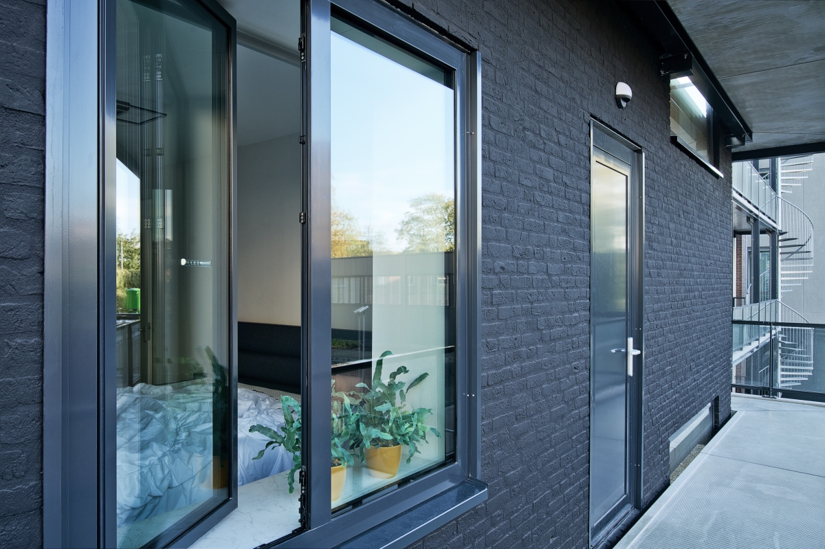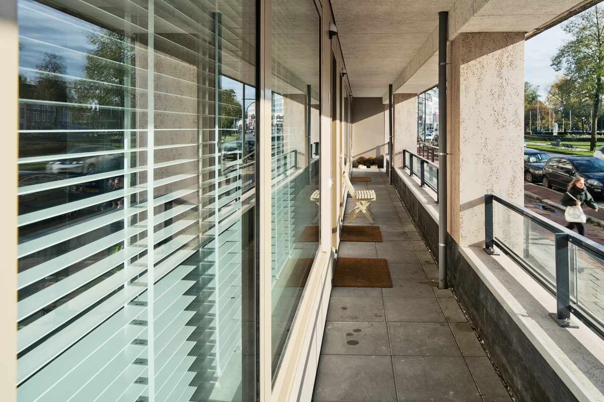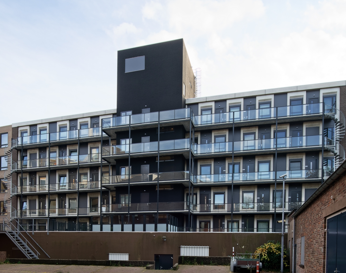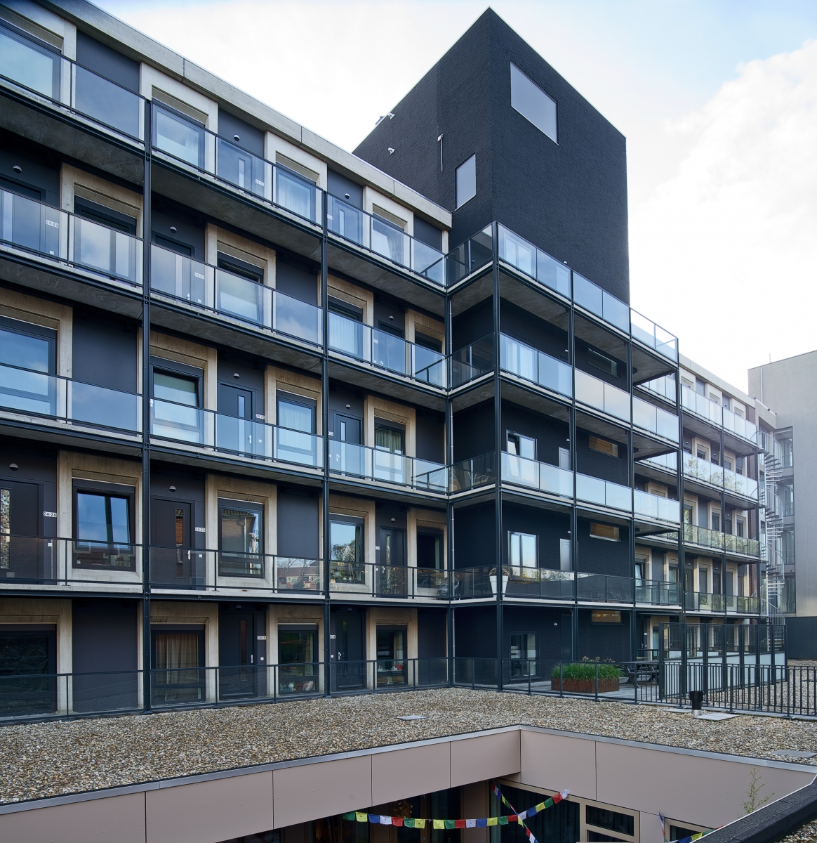 Omdat de ingang van de appartementen aan de achterkant van het gebouw liggen, is een staal- en betonconstructie aan de gevel bevestigd met de trappen en de galerij. “De metaalconstructie heeft ook weer de donkere kleur, terwijl de betonnen vloerdelen licht zijn. De reling is van glas, wat een rustig beeld geeft.”