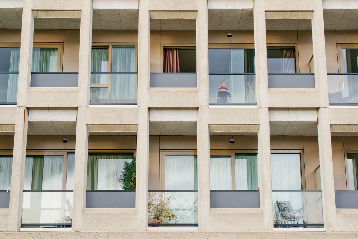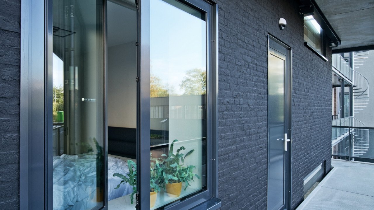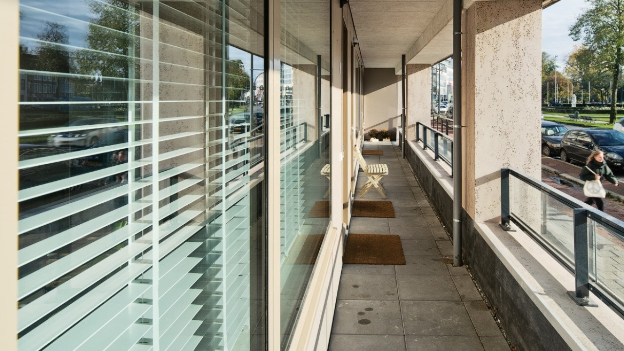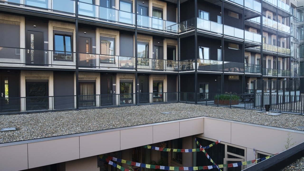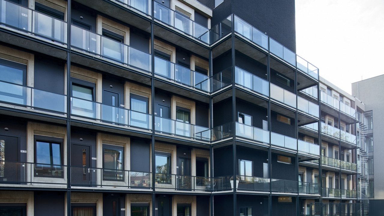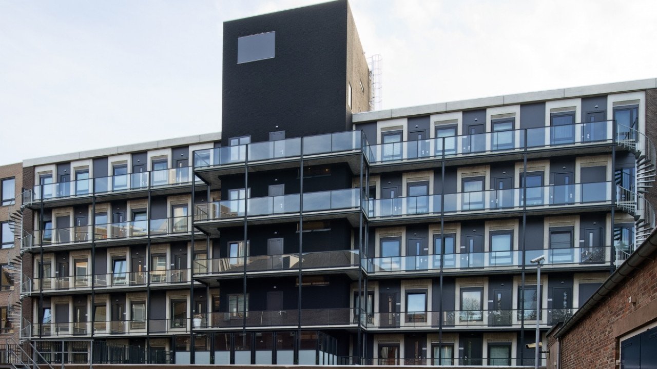 Omdat de ingang van de appartementen aan de achterkant van het gebouw liggen, is een staal- en betonconstructie aan de gevel bevestigd met de trappen en de galerij. “De metaalconstructie heeft ook weer de donkere kleur, terwijl de betonnen vloerdelen licht zijn. De reling is van glas, wat een rustig beeld geeft.”