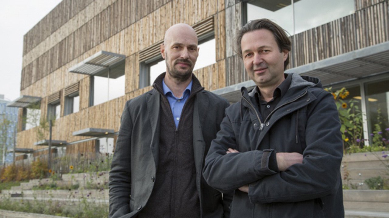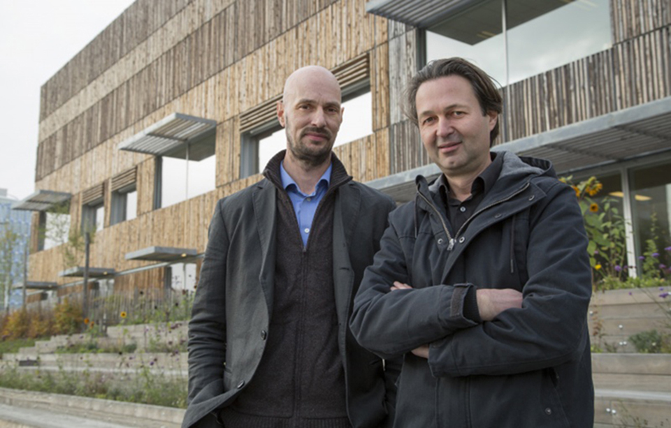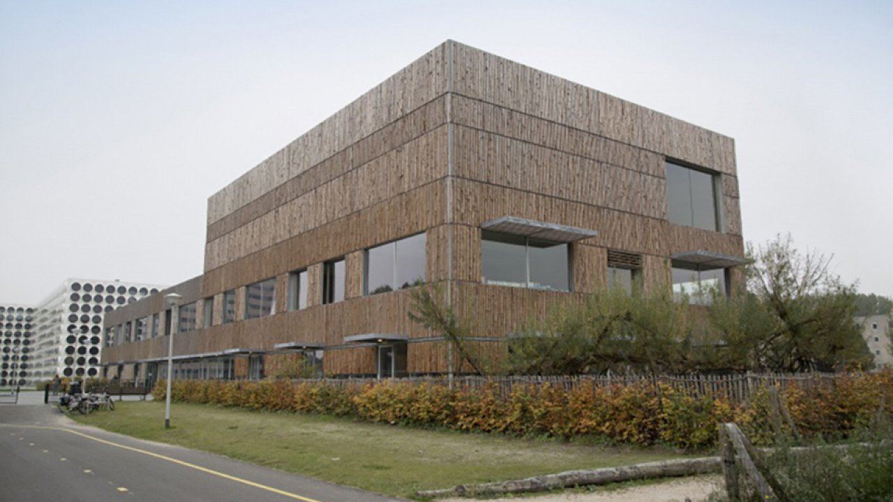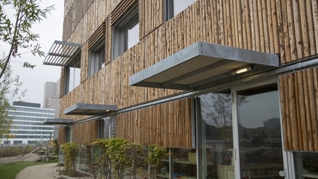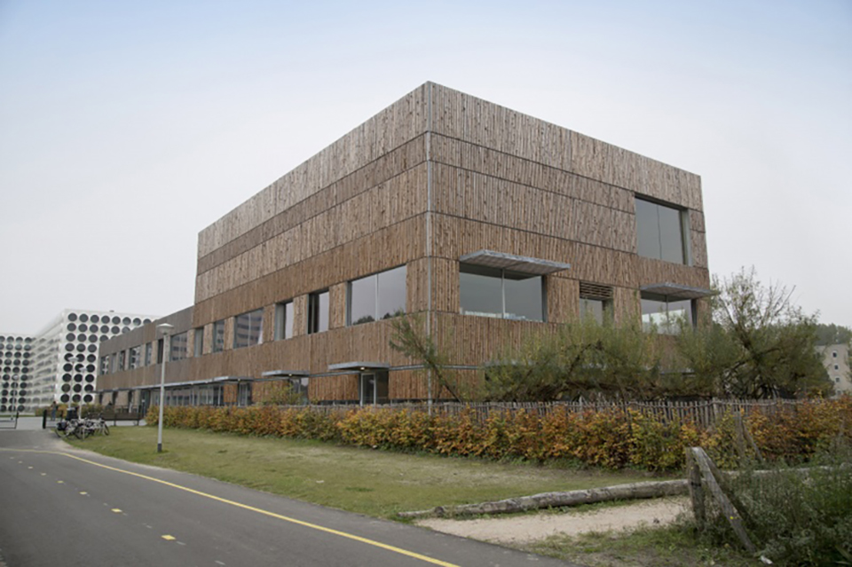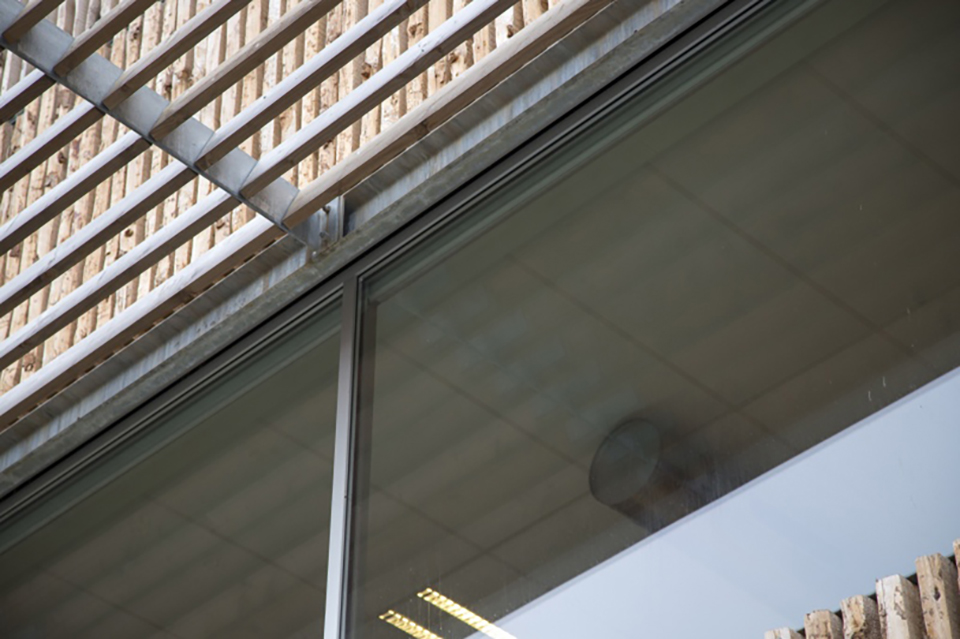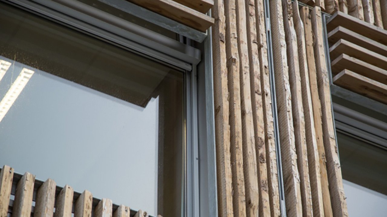 Voor de gevel langs, ook deels voor de ramen, is een open structuur van ruige houten schaaldelen in stalen frames geplaatst. De frames zijn verdeeld in banden over de gevel. Afwisseling in ritme van de houten delen en in de richting van de schorszijde, zorgen voor een geraffineerd gevelpatroon. “Bij het ontwerp van deze houten structuur hebben we een evenwicht gezocht tussen maximaal daglicht en minimale warmtelast in de ruimtes. Ook wilden we een levendig gevelbeeld bereiken door die afwisselende gevelframes in combinatie met variatie in afmetingen en posities van de kozijnen”, verduidelijkt Hund.