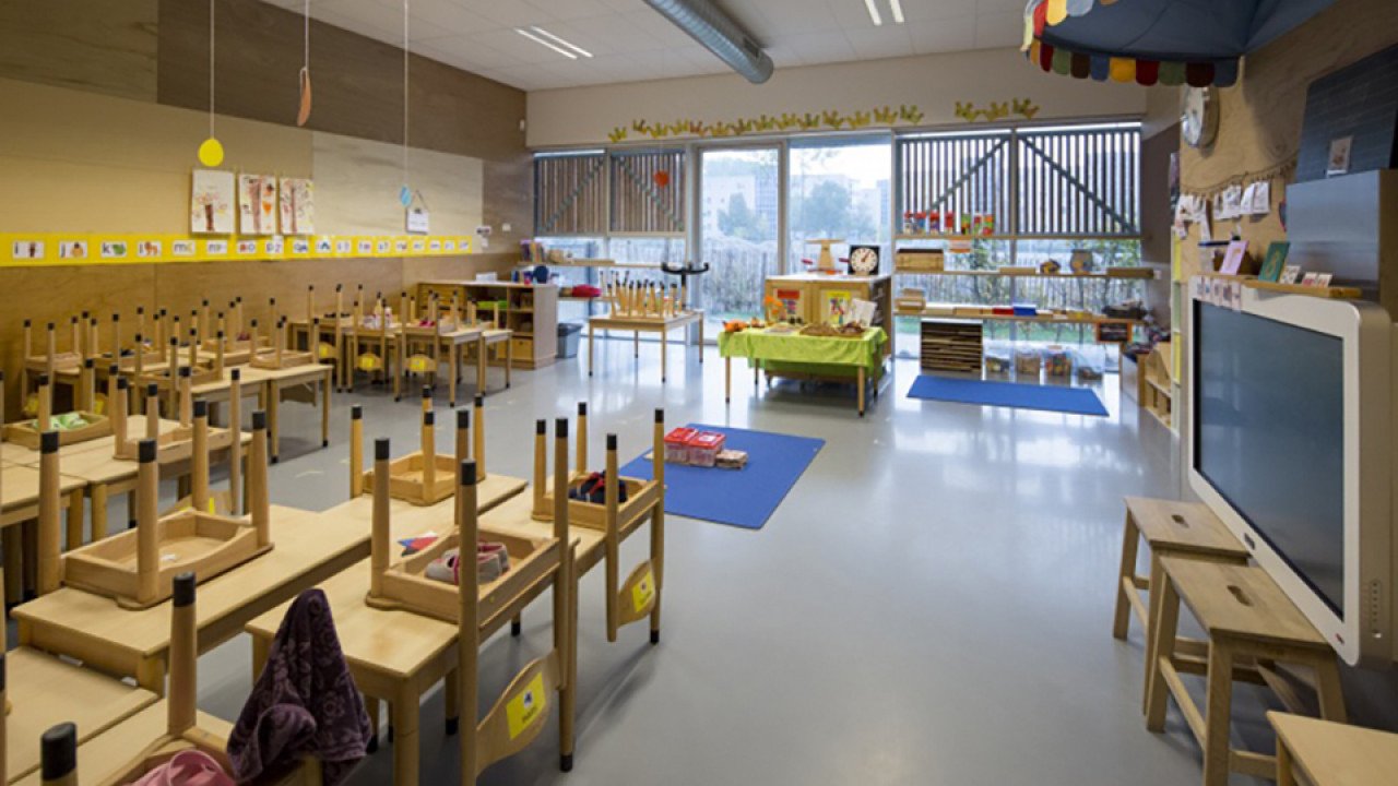 De school heeft verder een heldere ruimtelijke opzet. Er zijn vier clusters van vier lokalen, gegroepeerd naar leeftijdsgroepen. Buitenschoolse opvang vindt plaats in de grote ruimtes tussen de lokalen. “De opzet van de school en verbondenheid met omliggende buitenruimtes zorgen ervoor dat de kinderen en leraren hier op een bijzondere en prettige wijze kunnen werken, leren en spelen,” verzekert Hund.