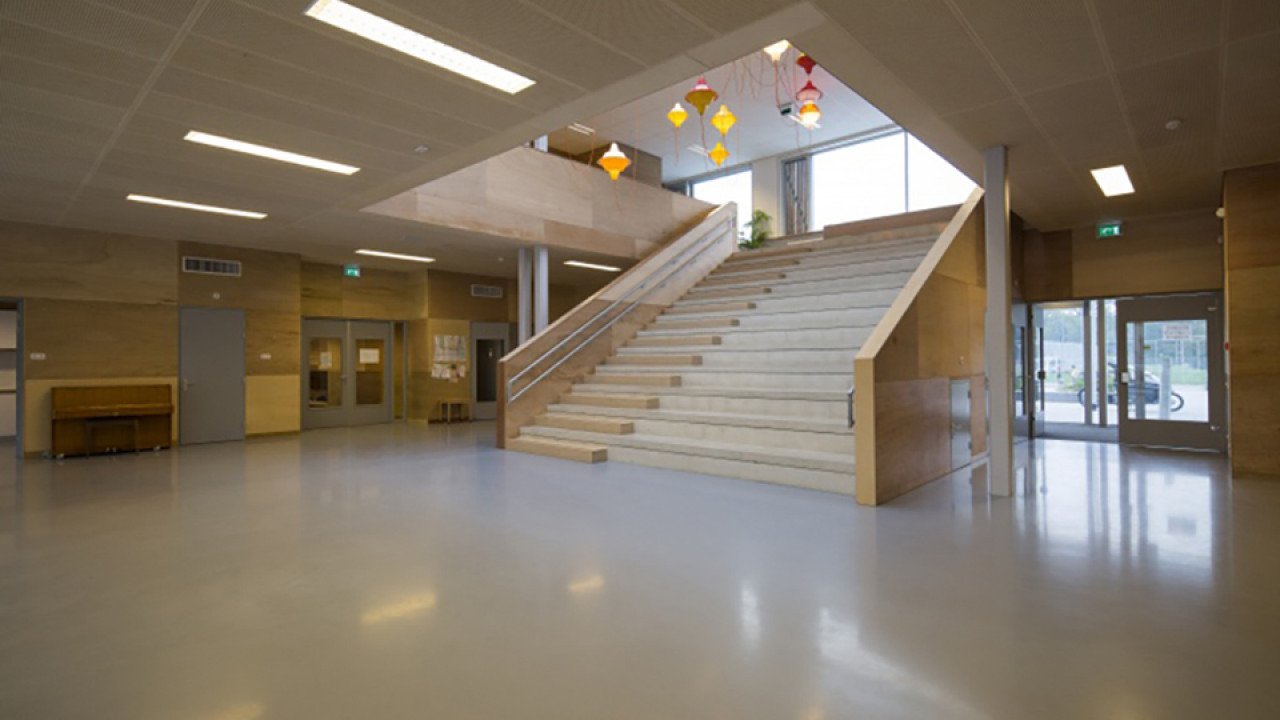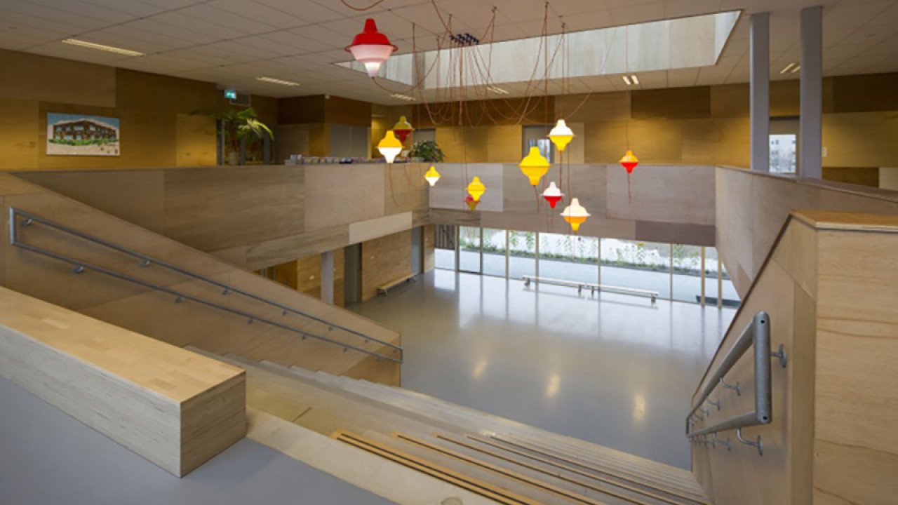 De lokalen en gymzaal zijn zo hoog mogelijk gemaakt. Leidingen zijn weggewerkt achter de lagere plafonds in de tussenruimtes.