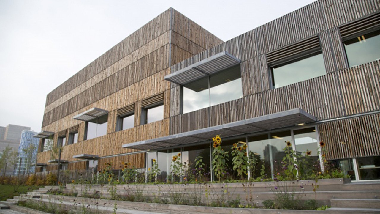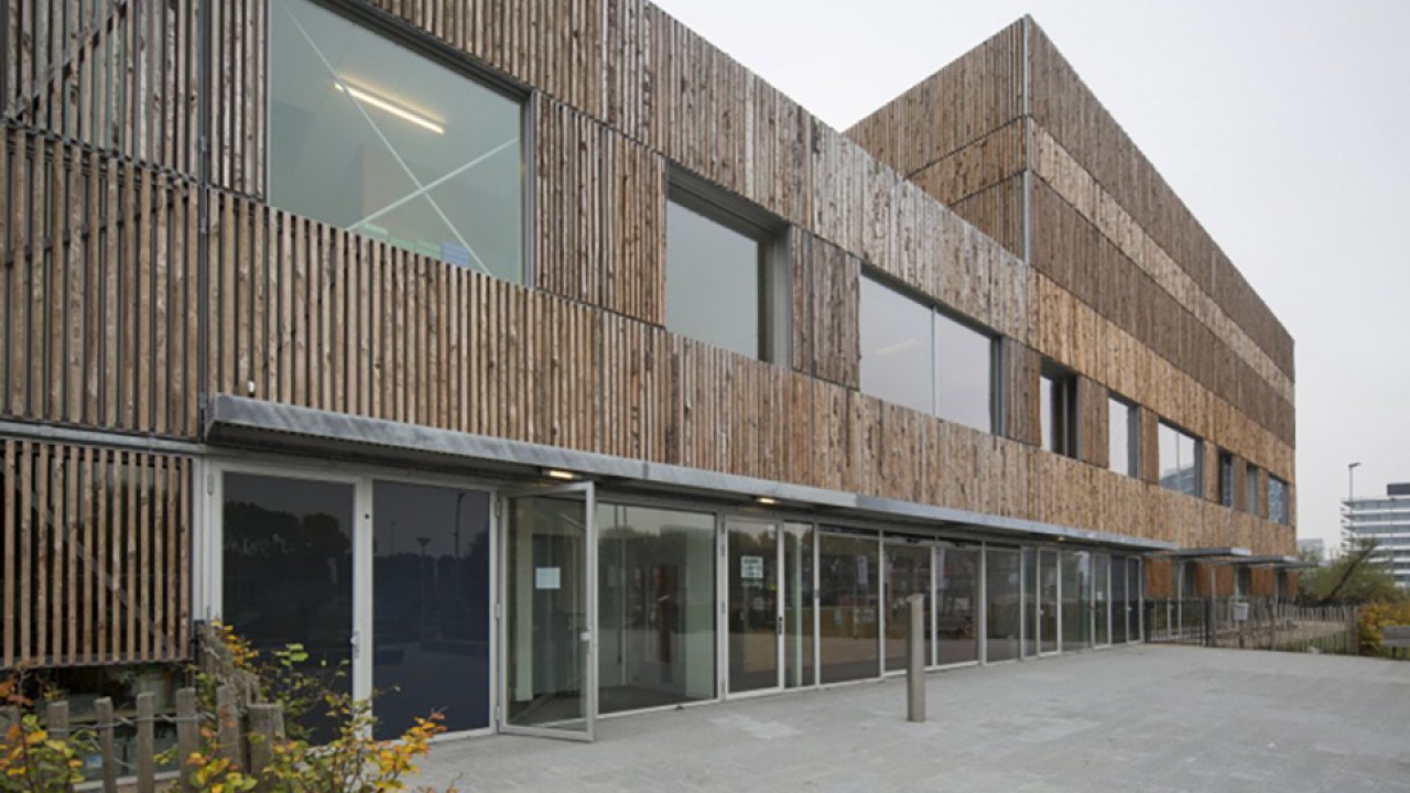 Ruig hout, glanzend aluminium en grote ramen kenmerken de gevels. Die zijn opgebouwd uit gestandaardiseerde elementen, zowel in opbouw als in afmetingen. Afhankelijk van de achterliggende ruimtes en de oriëntatie op de zon zijn de gevelelementen ingevuld met glas of aluminium plaatmateriaal.