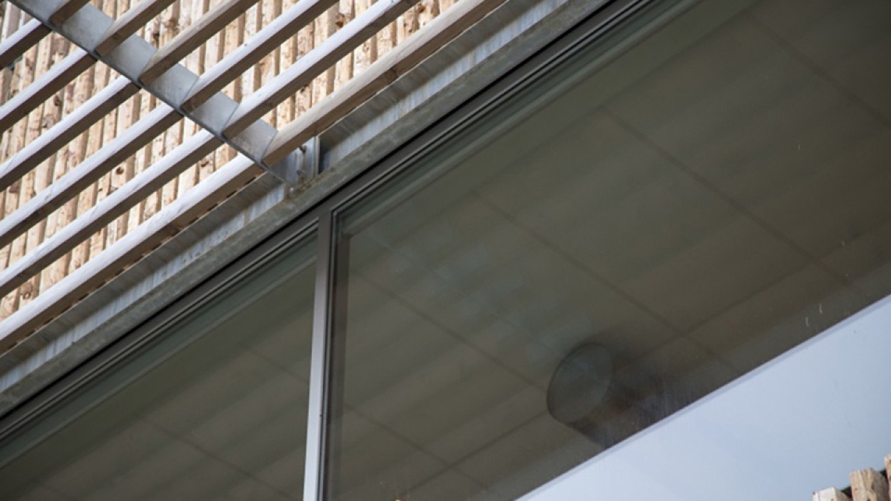 Glandorff: “De gehele begane grondgevel bestaat uit glazen puien. Op de verdiepingen hebben de groepsruimtes en de gymzaal extra grote ramen, de gymzaal zelfs een raam van 3,6 x 5 m.” Gekozen is voor 1 type slank aluminium kozijnprofiel van Reynaers. Het geanodiseerde aluminium past goed bij het hout en staal. Ook de geluidwerendheid was belangrijk bij de kozijnkeuze vanwege de drukke locatie. Tenslotte speelde de prijs een rol, gezien het krappe budget waarbinnen het gebouw moest worden gerealiseerd. D’n Boeij Aluminiumbouw was verantwoordelijk voor alle kozijnen.